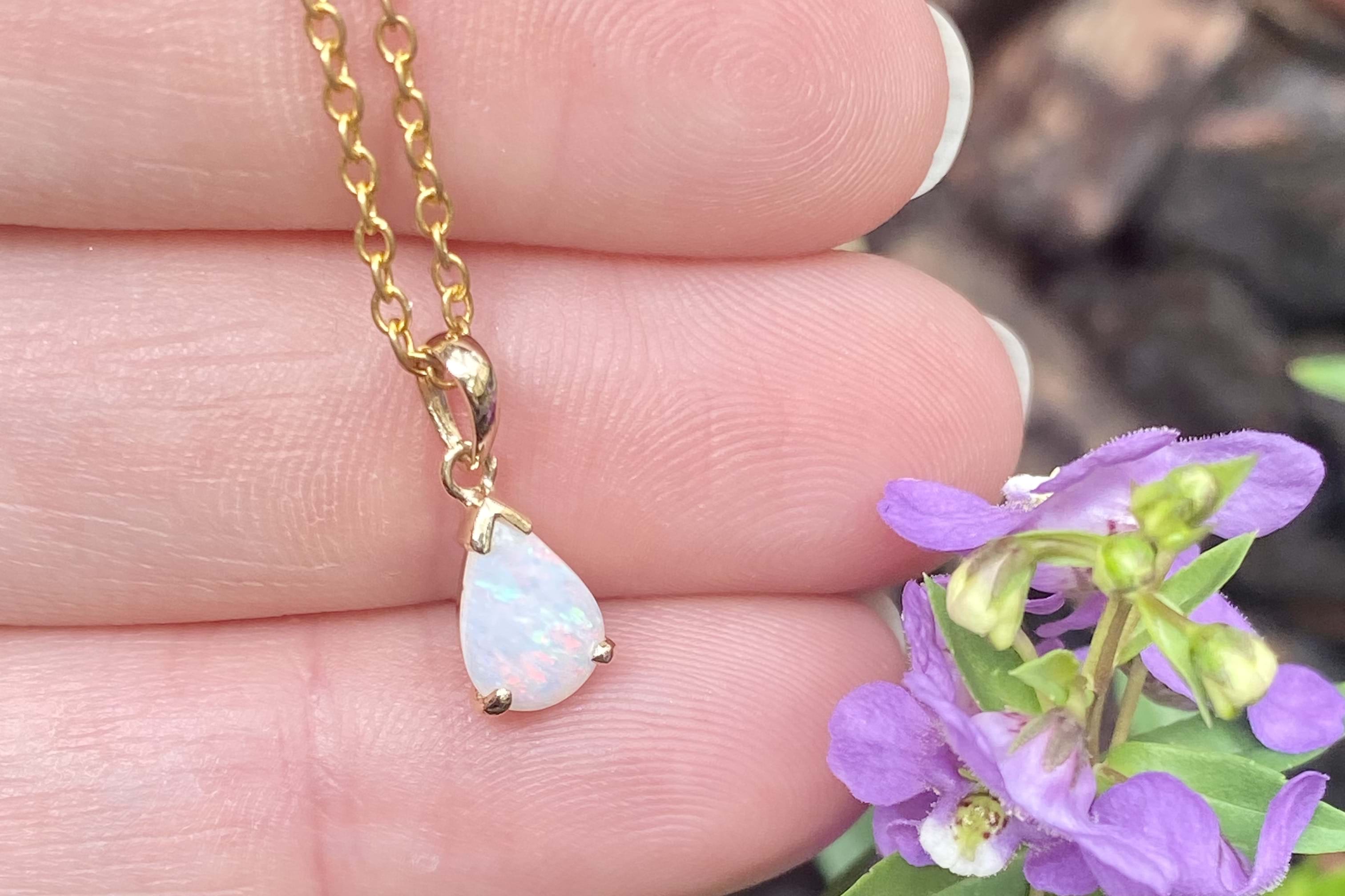 This cute pendant features a lustrous, white coober pedy opal measuring approx. 8.5x6.4mm, 2 claw and cap set into 9ct yellow gold. The opal flashes green, red and orange with every movement. Finished with a plain bale. Chains are available for separate purchase.