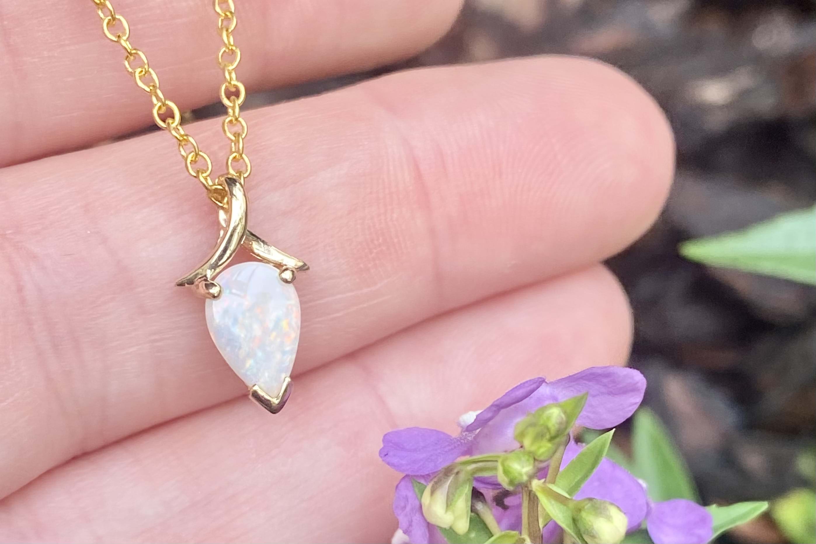 This unique pendant consists of one teardrop 9.8x6mm white Coober Pedy opal, 2 claw and cap set into 9ct yellow gold. The opal has flashes of red and orange with every movement and is finished with a ribbon style slide bale.