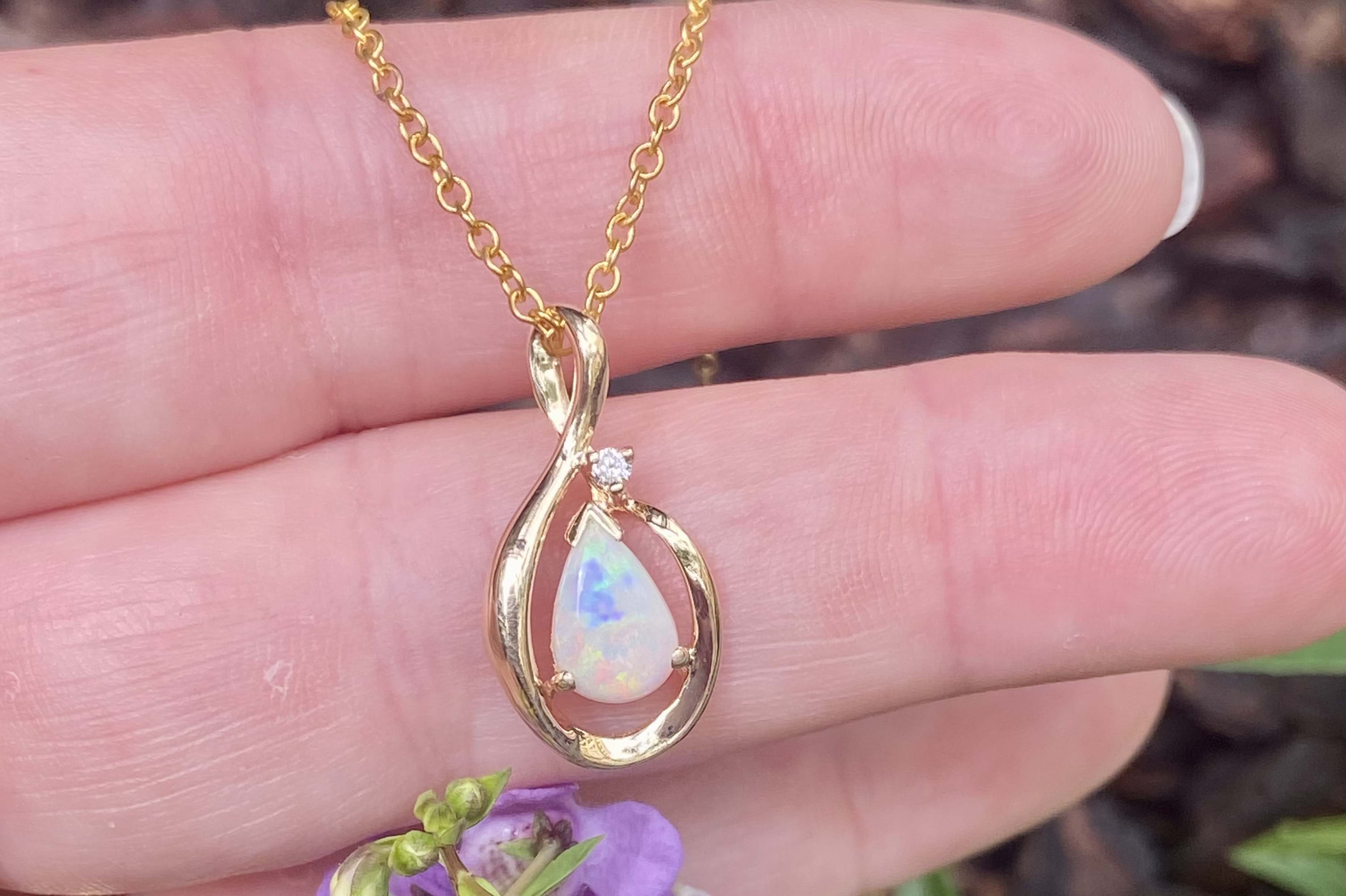 This gorgeous poendant features a white Coober Pedy opal measuring 9x6mm, 2 claw and cap set into 9ct yellow gold. The opal has vibrant flashes of green and blue throughout, and is complimented by a gold swirl design with a 3 claw set 2mm diamond. Finished with a plain bale. Chains are available for separate purchase.