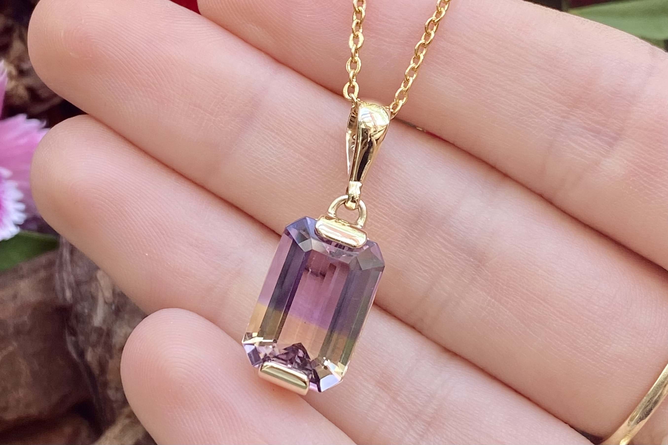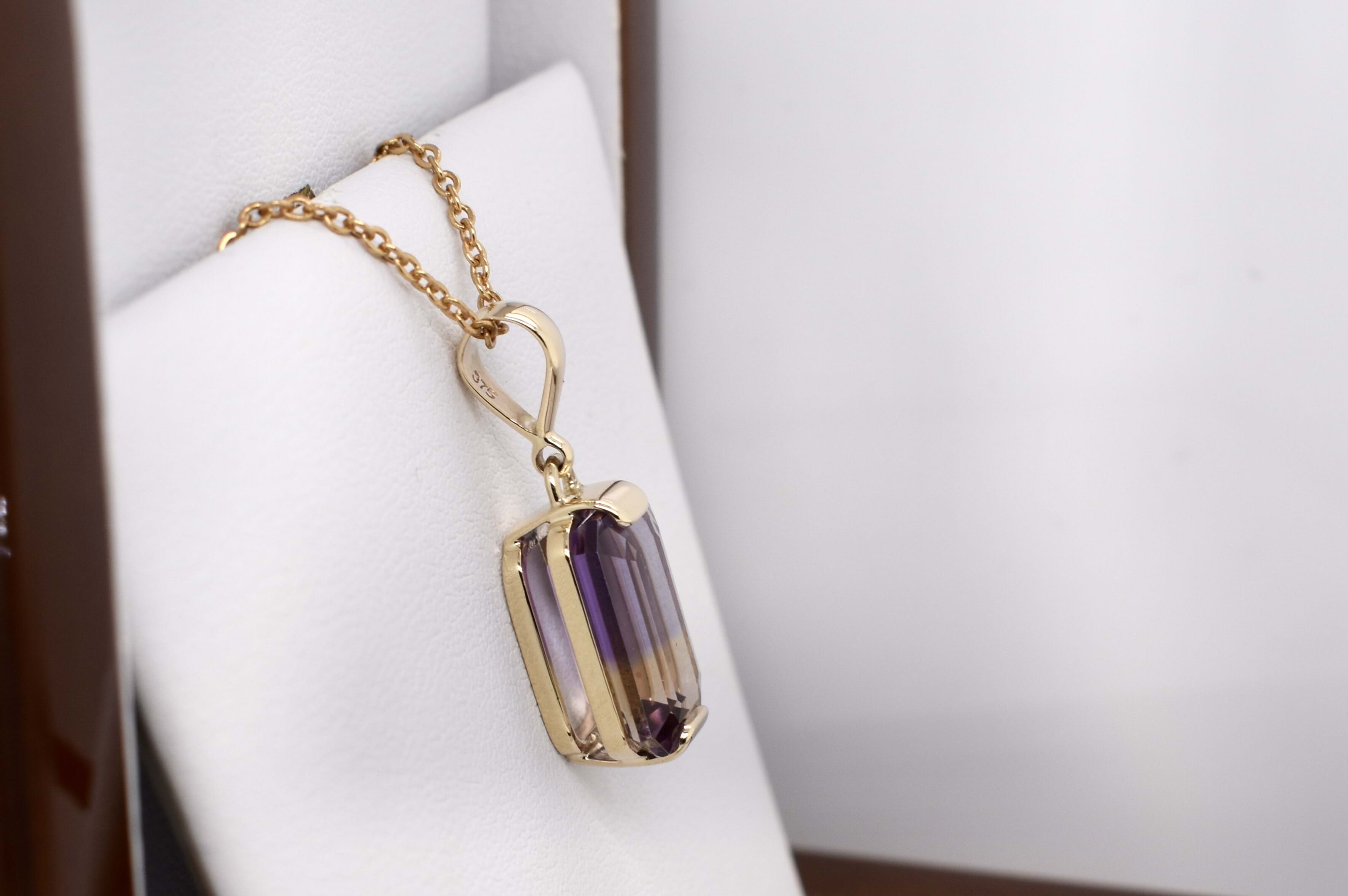 A stunning Bolivian ametrine pendant, set in 9ct yellow gold, measuring 11.9x9.9mm. Semi bezel set with a plain bale. Chains available for separate purchase.