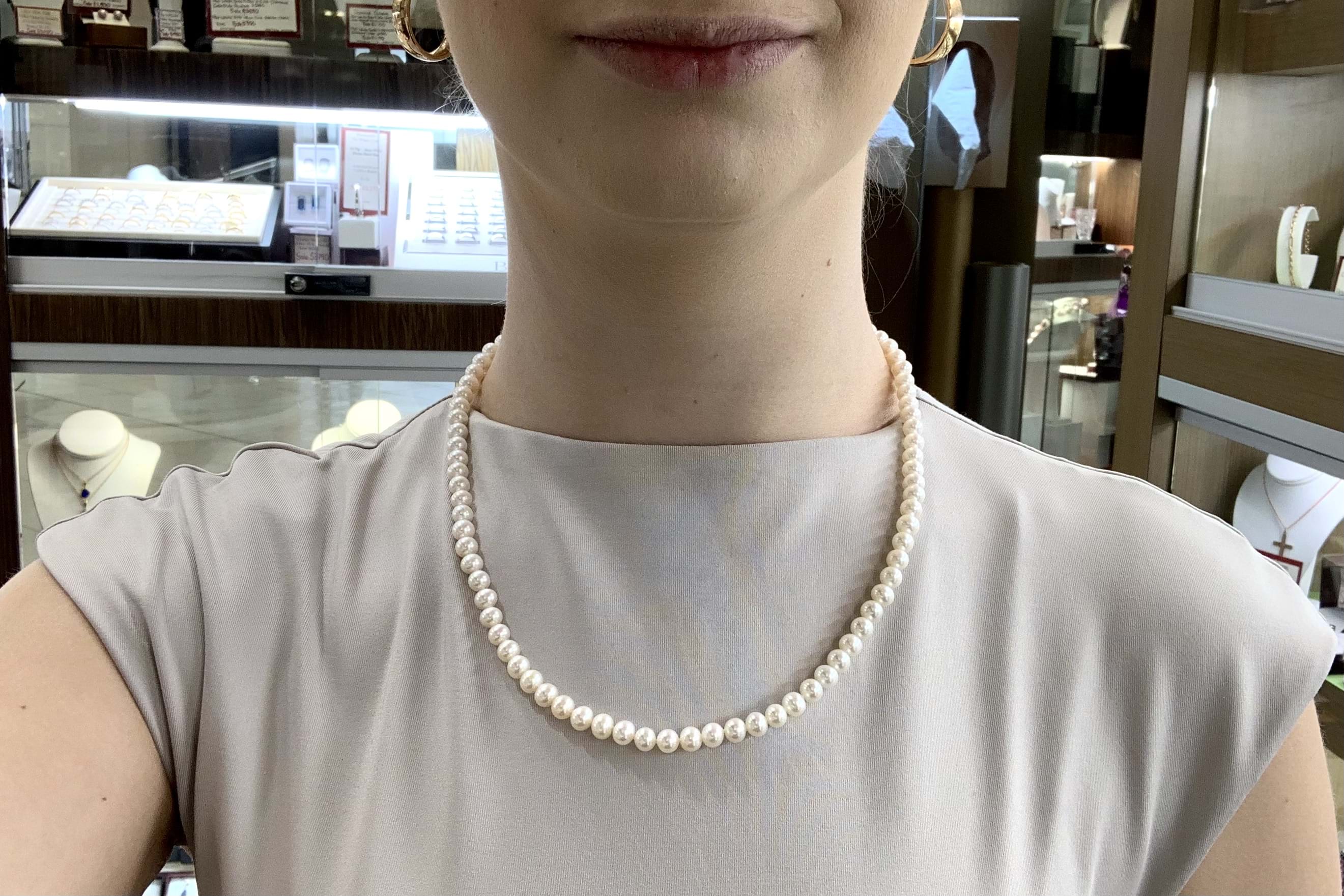 A classic strand of white Freshwater pearls, measuring 6.0-6.5mm near round. The pearls have been hand strung on silk and individually knotted with a 9ct yellow gold cut out pearl clasp. Strand length 50cm.