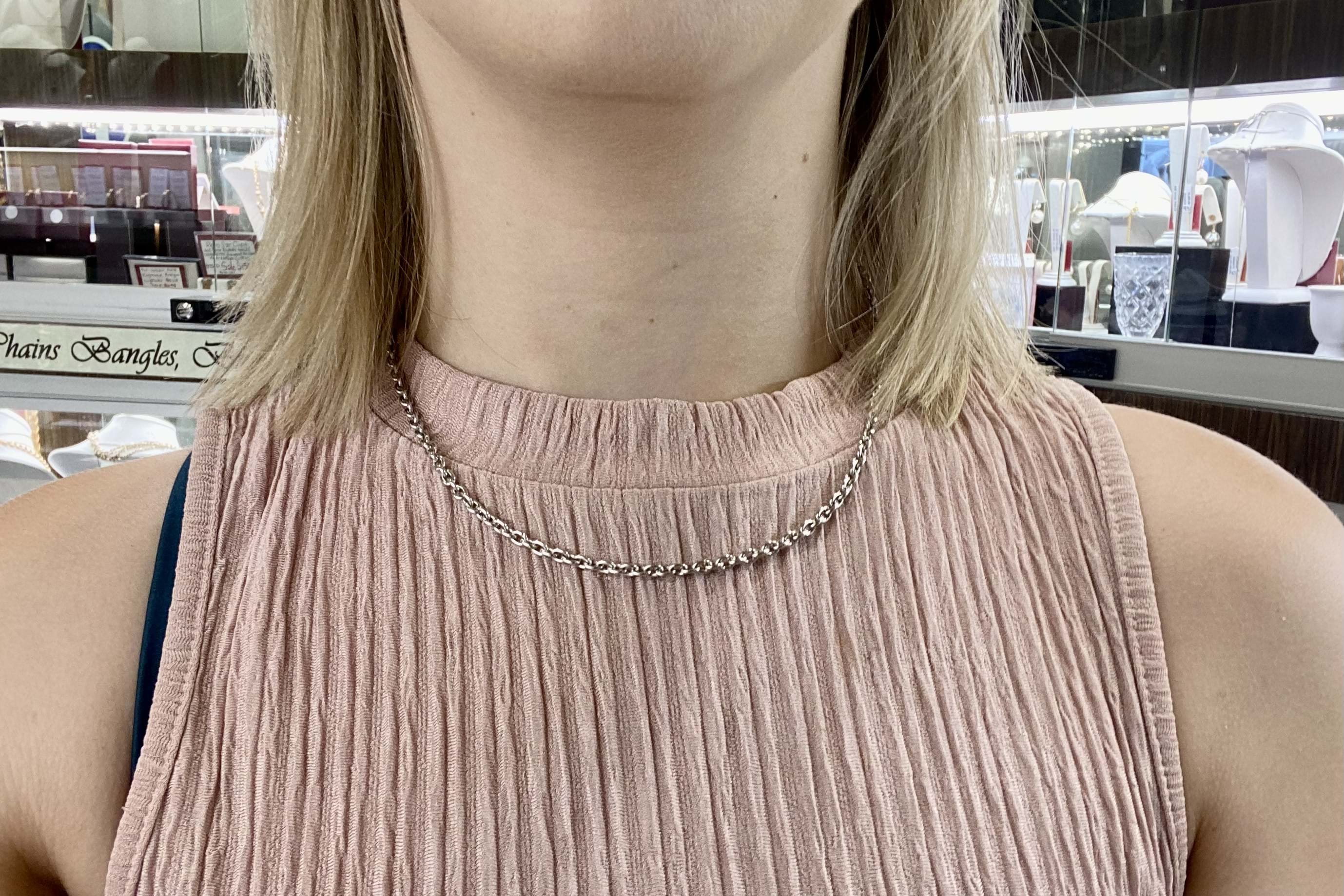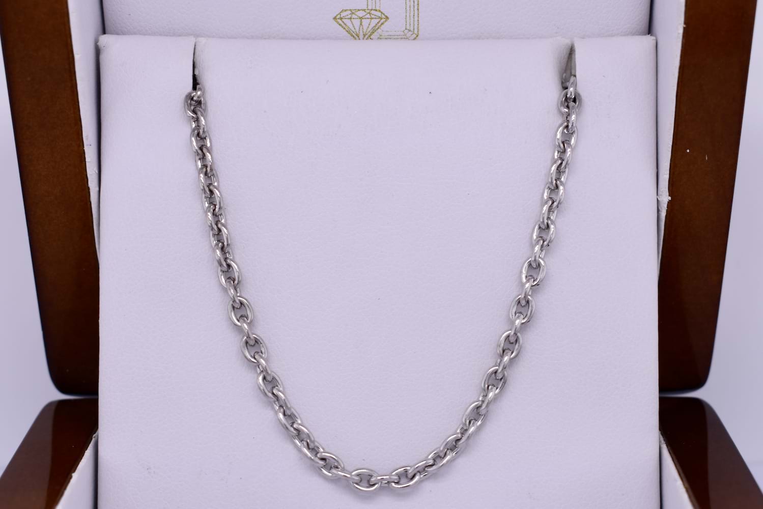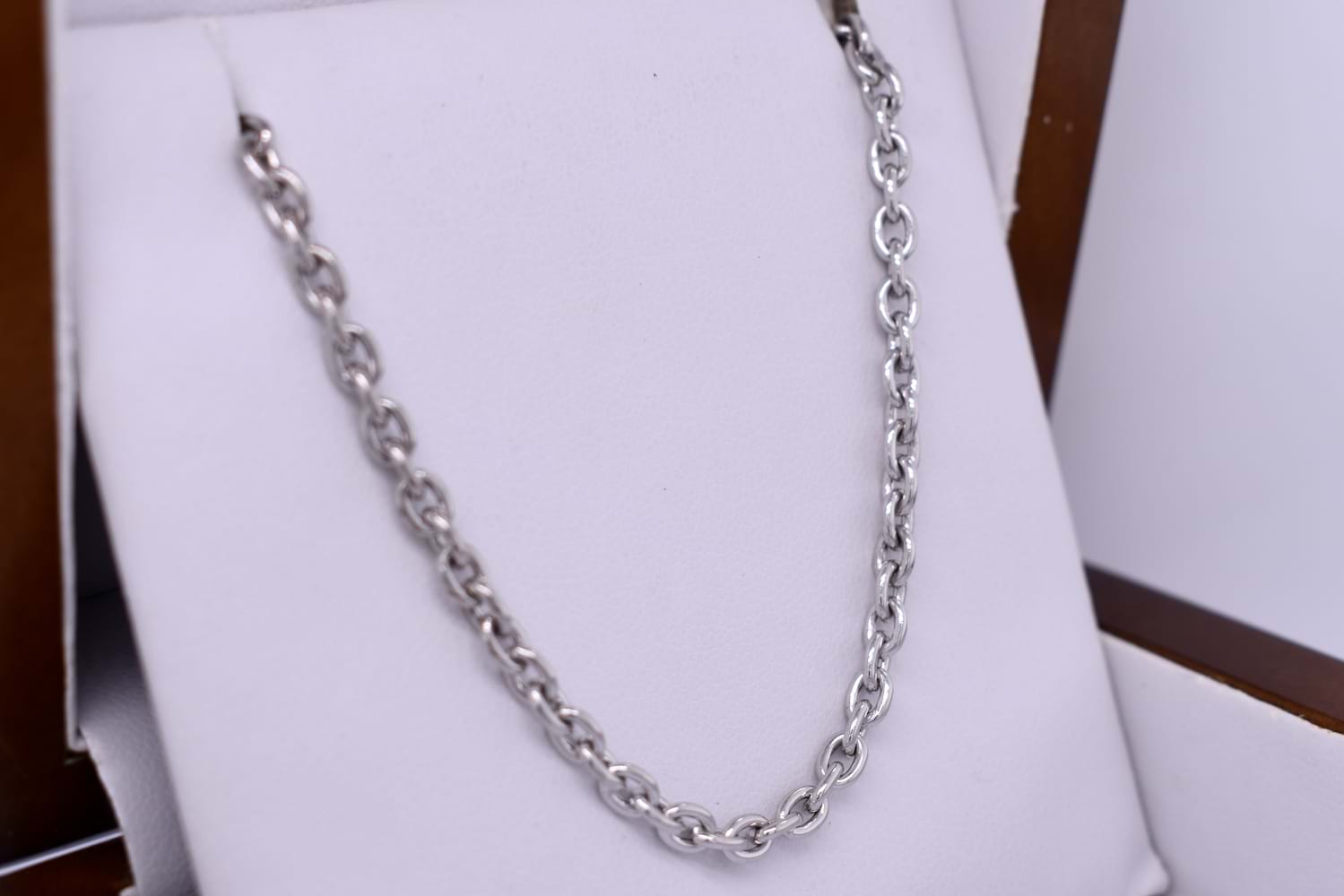 Handcrafted by our talented goldsmith in 9ct white gold this stunning, timeless and classic handmade cable link chain measures 45cm and weighs 16.89grams. It has been rhodium plated and has a 14mm parrot clasp. This chain can be made to order in length, rose/white/yellow gold and 9ct, 14ct or 18ct.