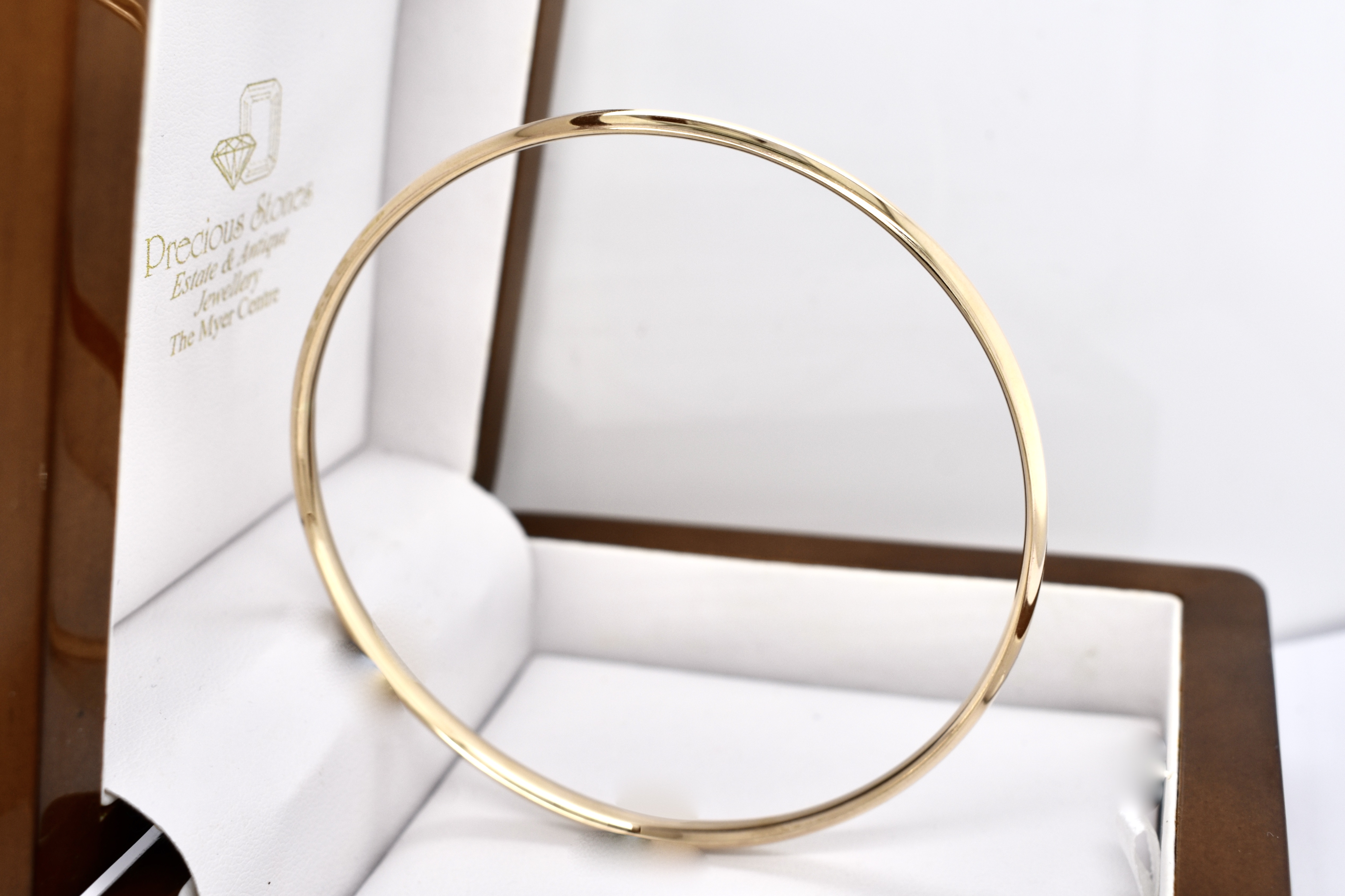 This classic solid round bangle has been beautifully hand crafted by our talented goldsmith in 9ct yellow gold, with a hand size of 70mm and width of 4mm. Weighing 16.5 grams.