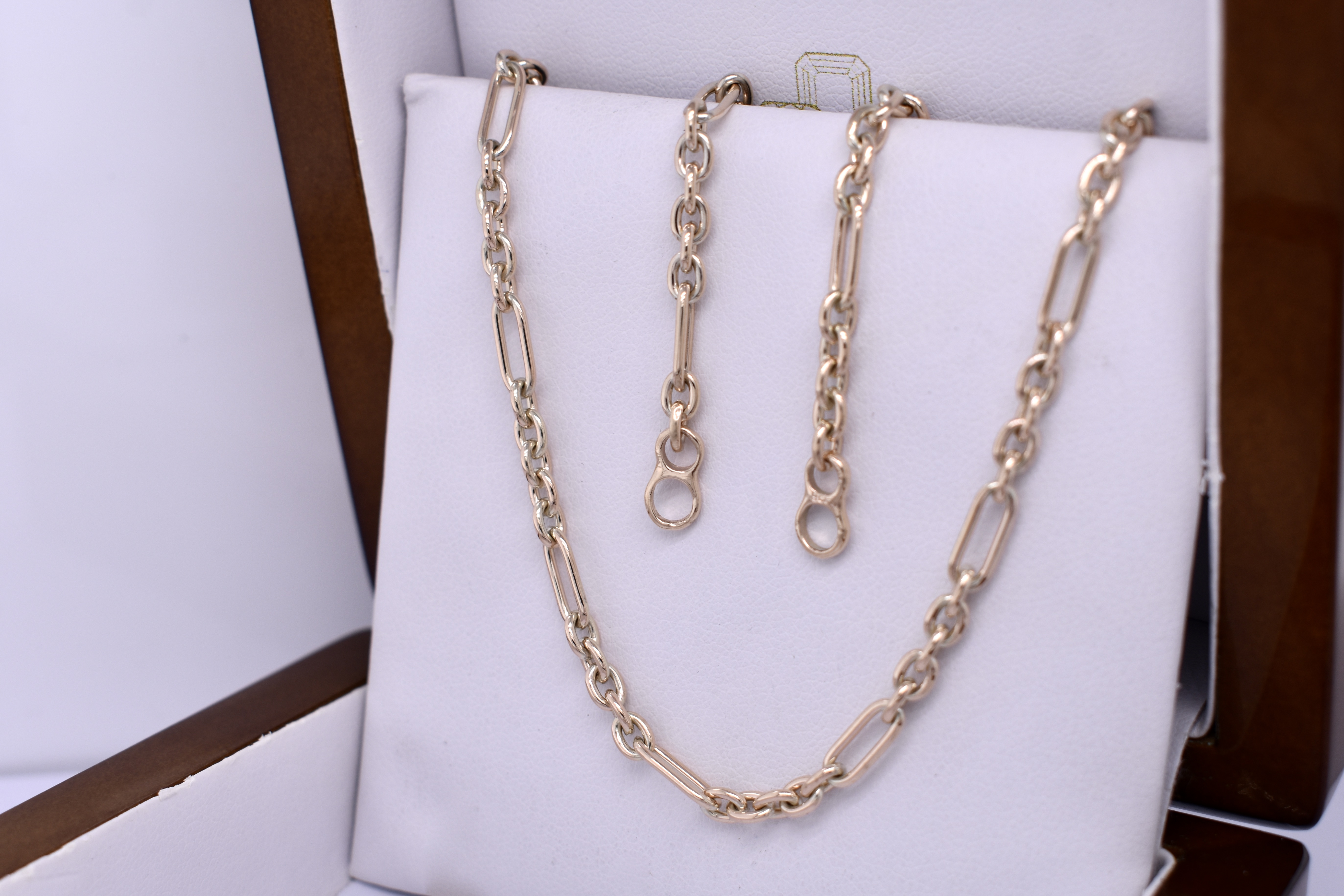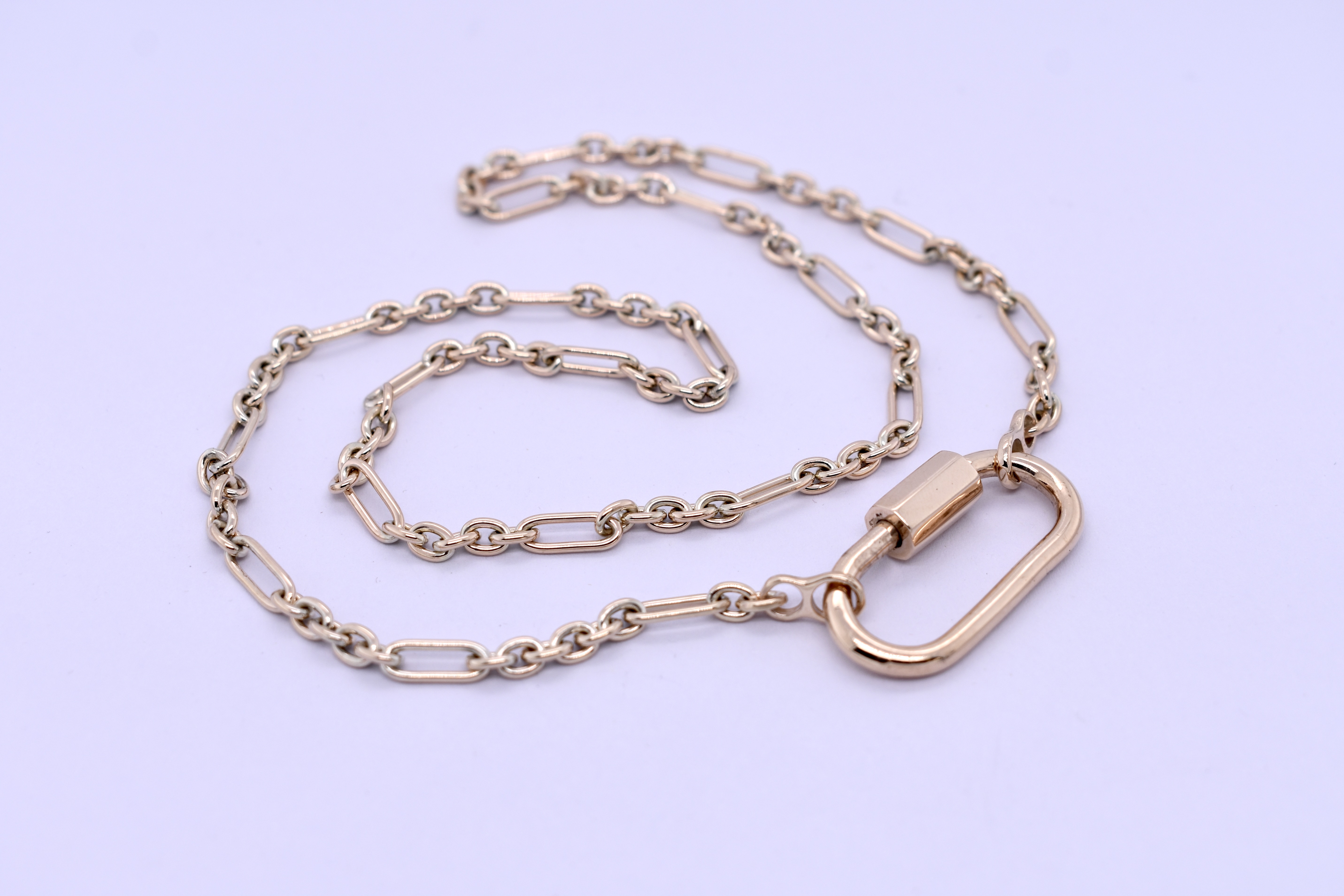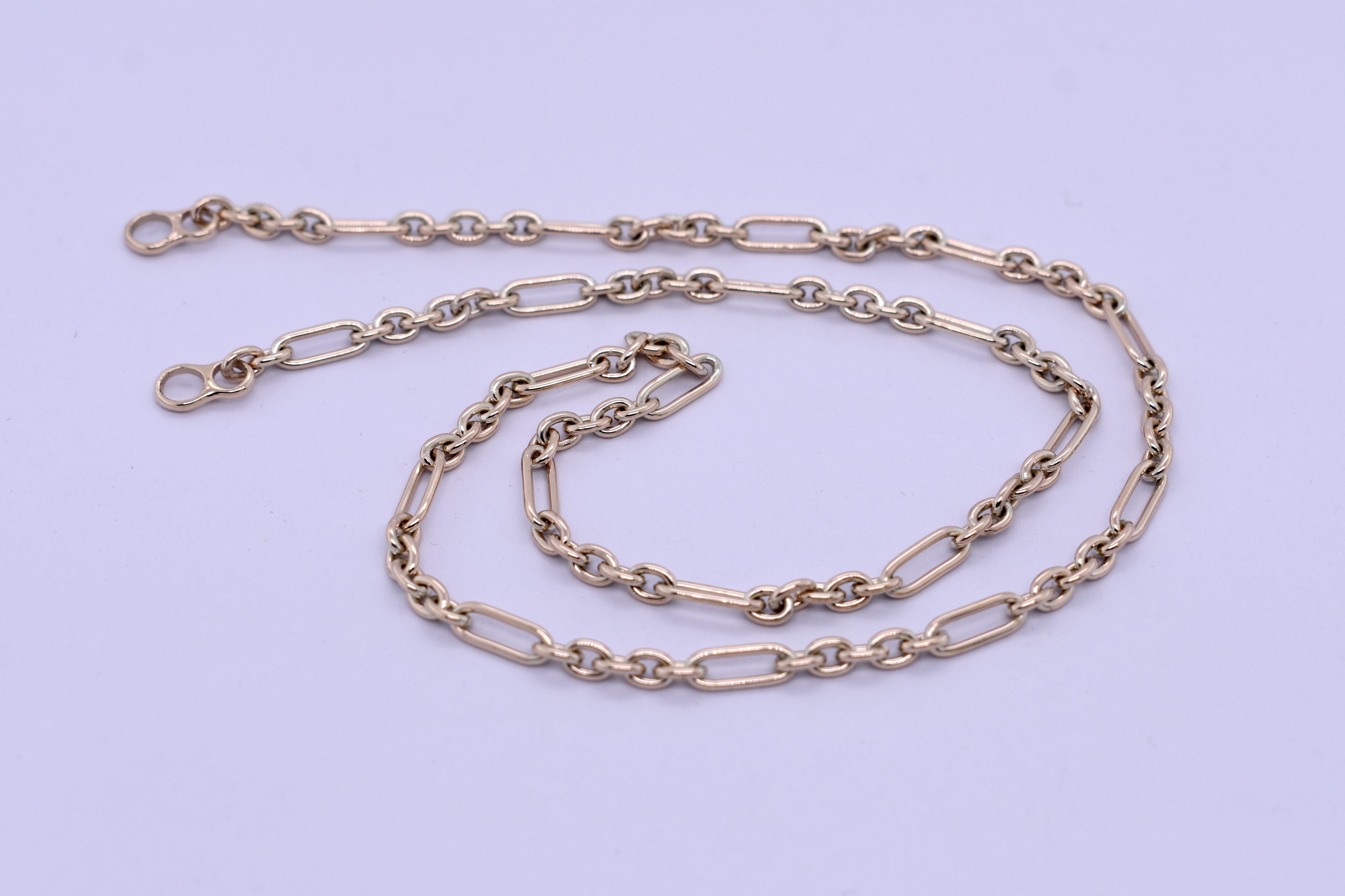 This beautiful chain was handmade by our goldsmith in 9ct yellow gold in this pretty 5/1 cable link (5 short, 1 long). It has two jump rings on the ends, offering great versatility for different clasps, carabiners and brooches. Chain measures 45cm long and weighs 13.10grams. Carabiner pictured for seperate purchase.