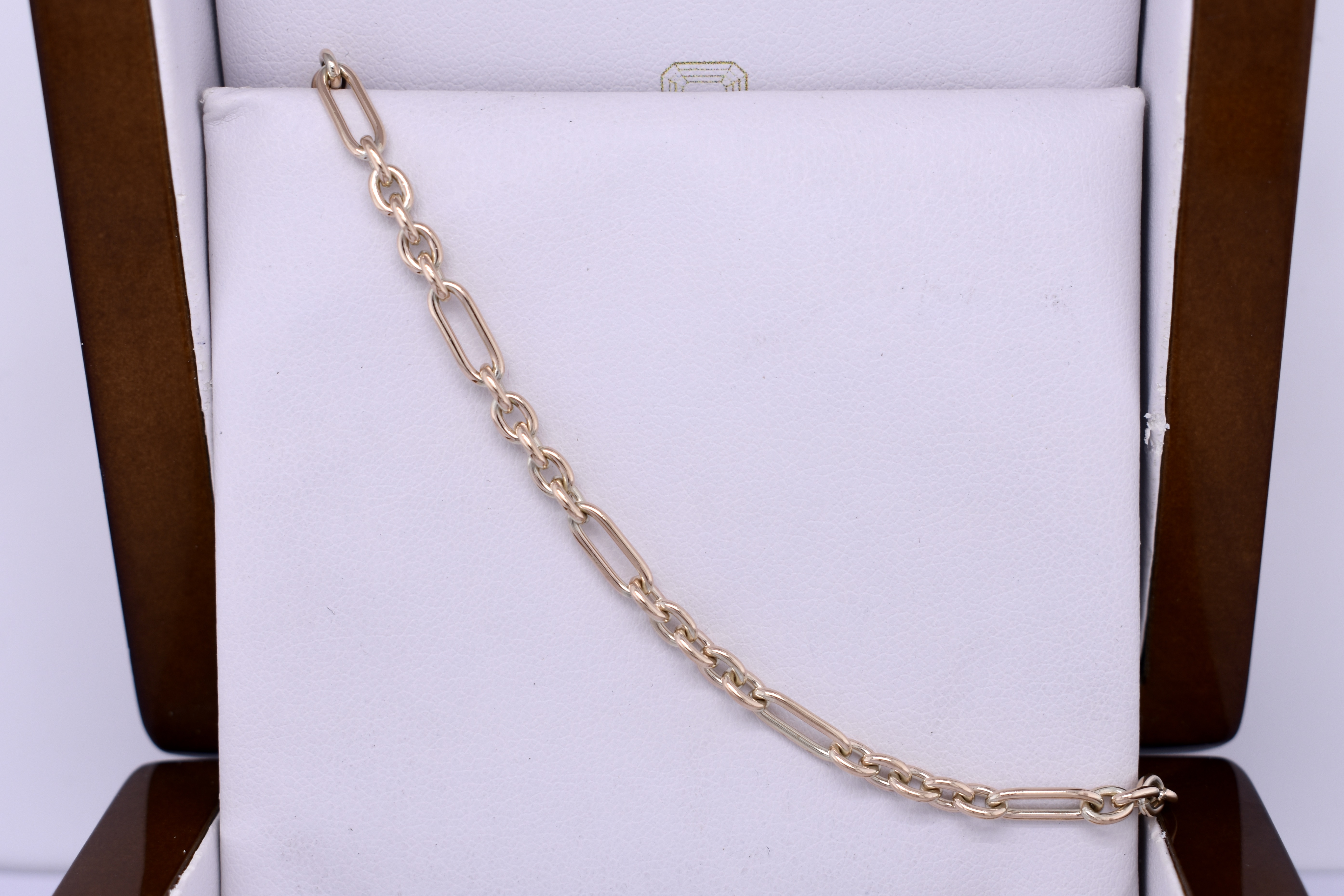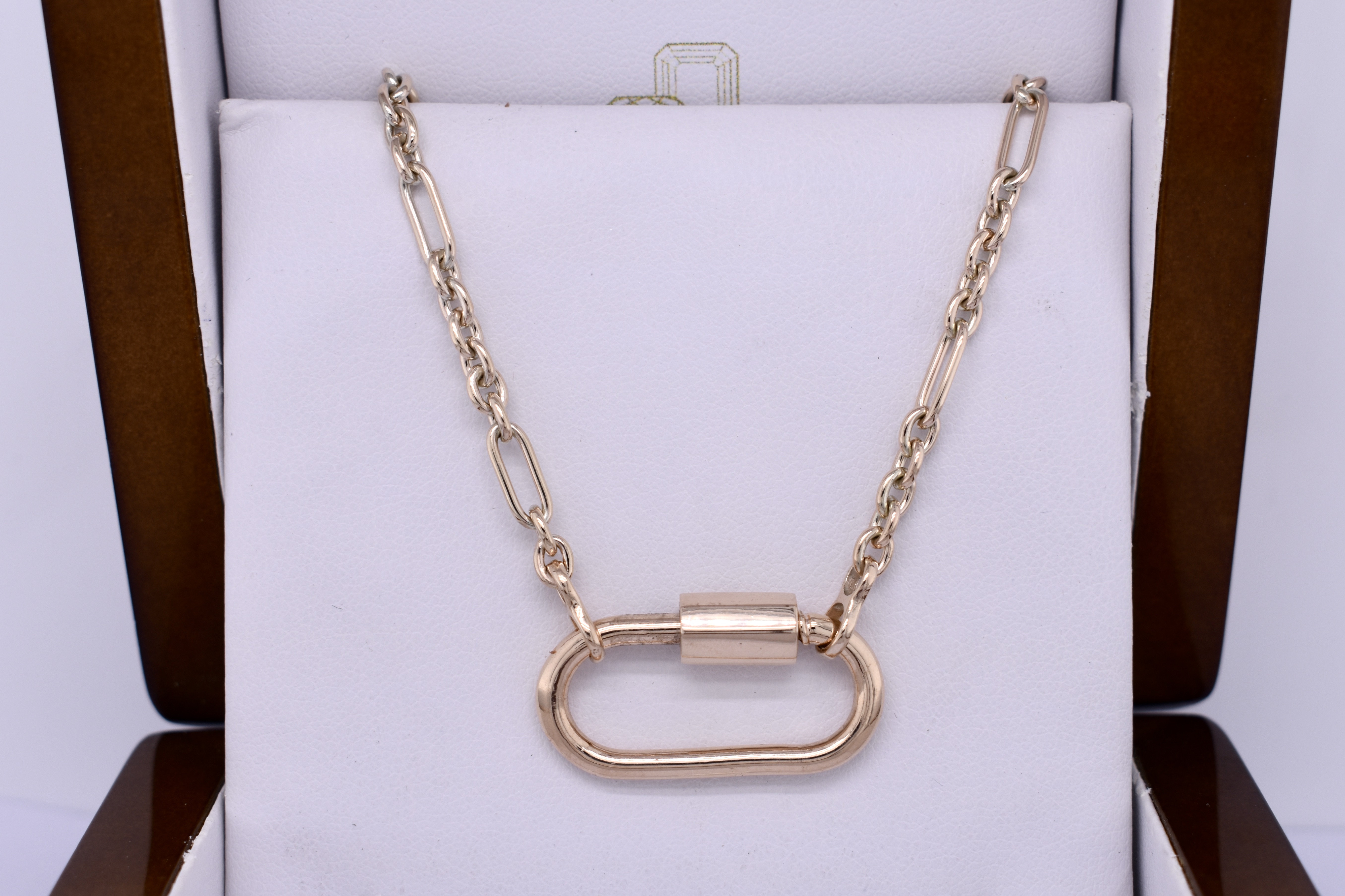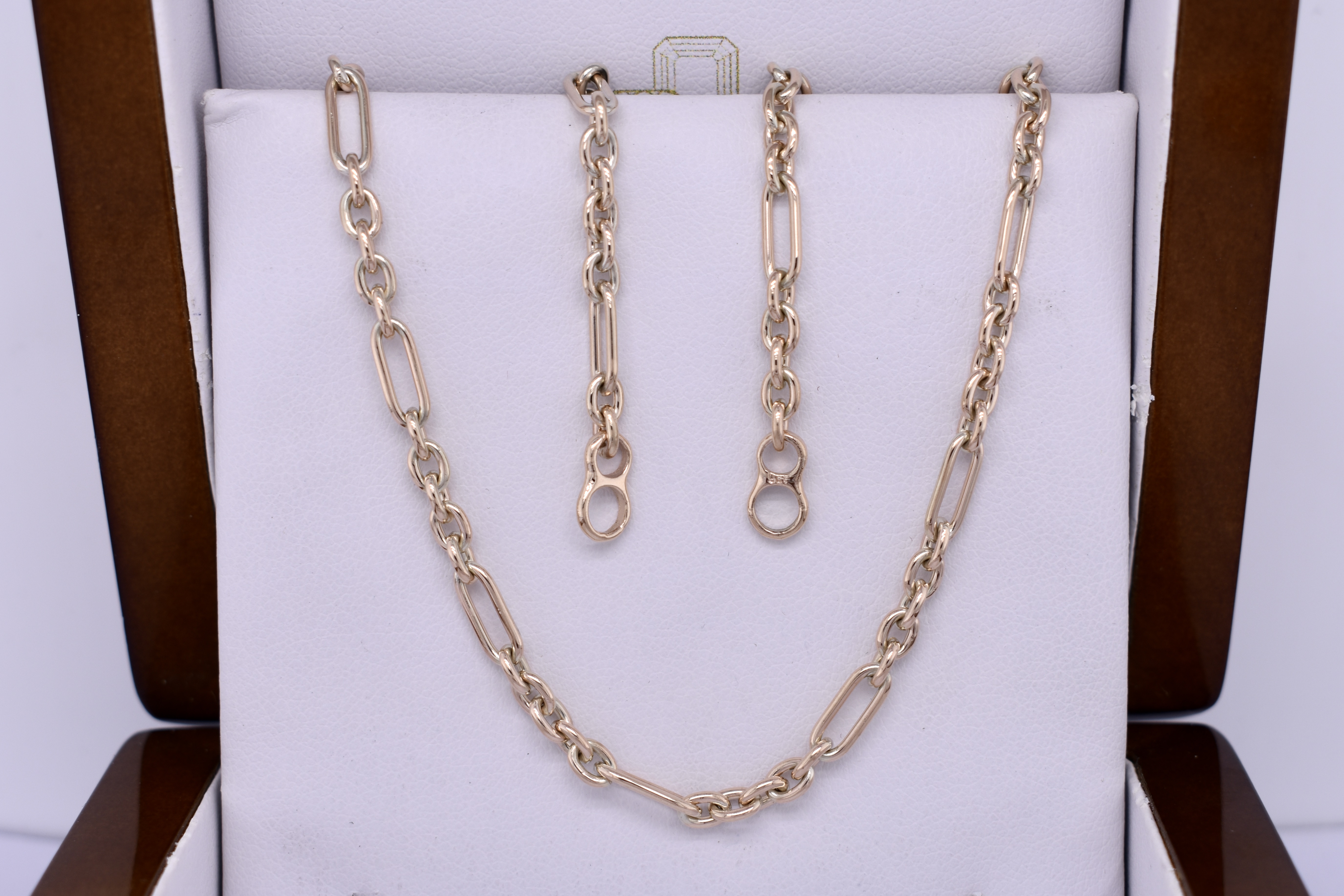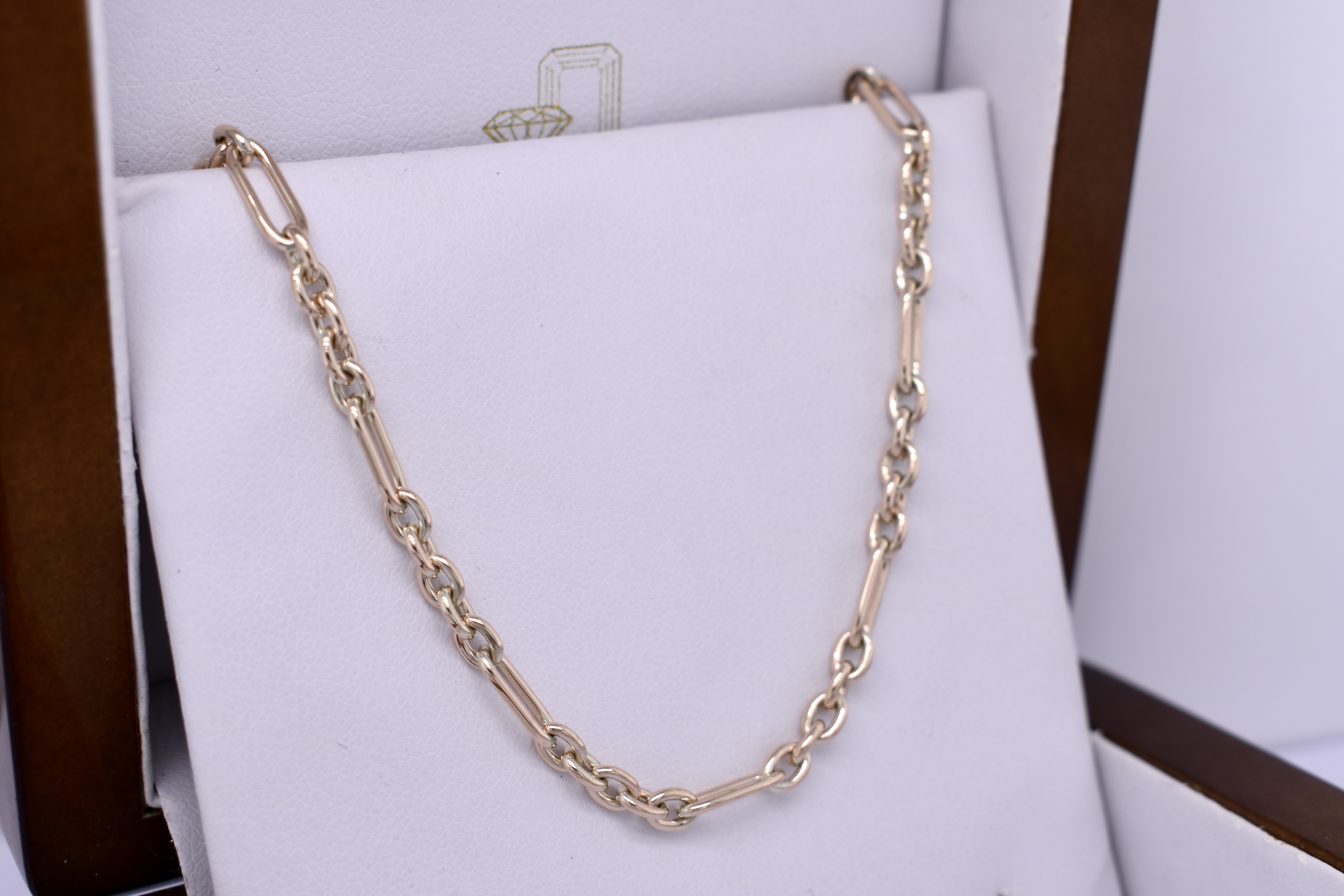 This beautiful chain was handmade by our goldsmith in 9ct yellow gold in this pretty 5/1 cable link (5 short, 1 long). It has two jump rings on the ends, offering great versatility for different clasps, carabiners and brooches. Chain measures 45cm long and weighs 13.10grams. Carabiner pictured for seperate purchase.