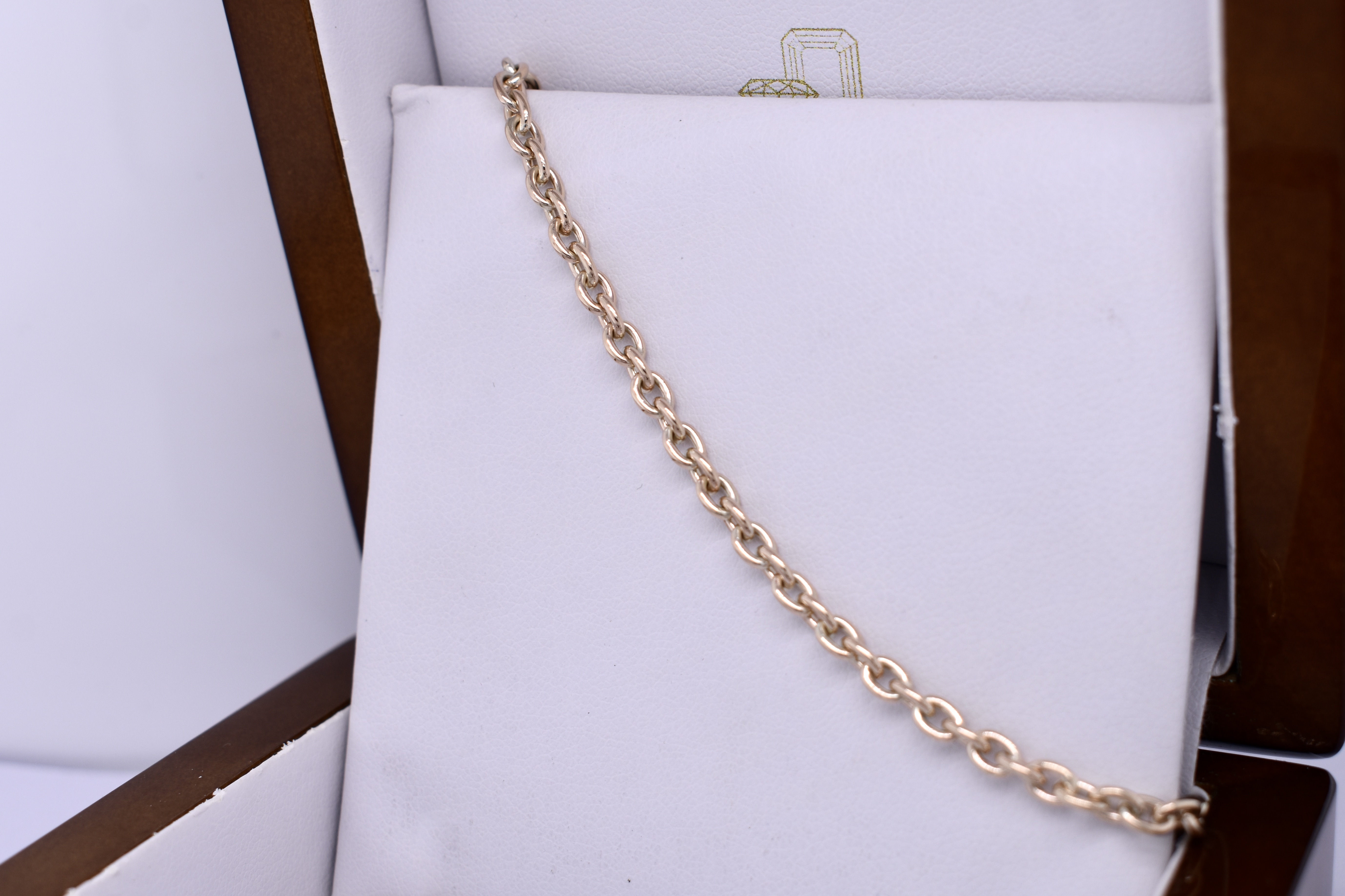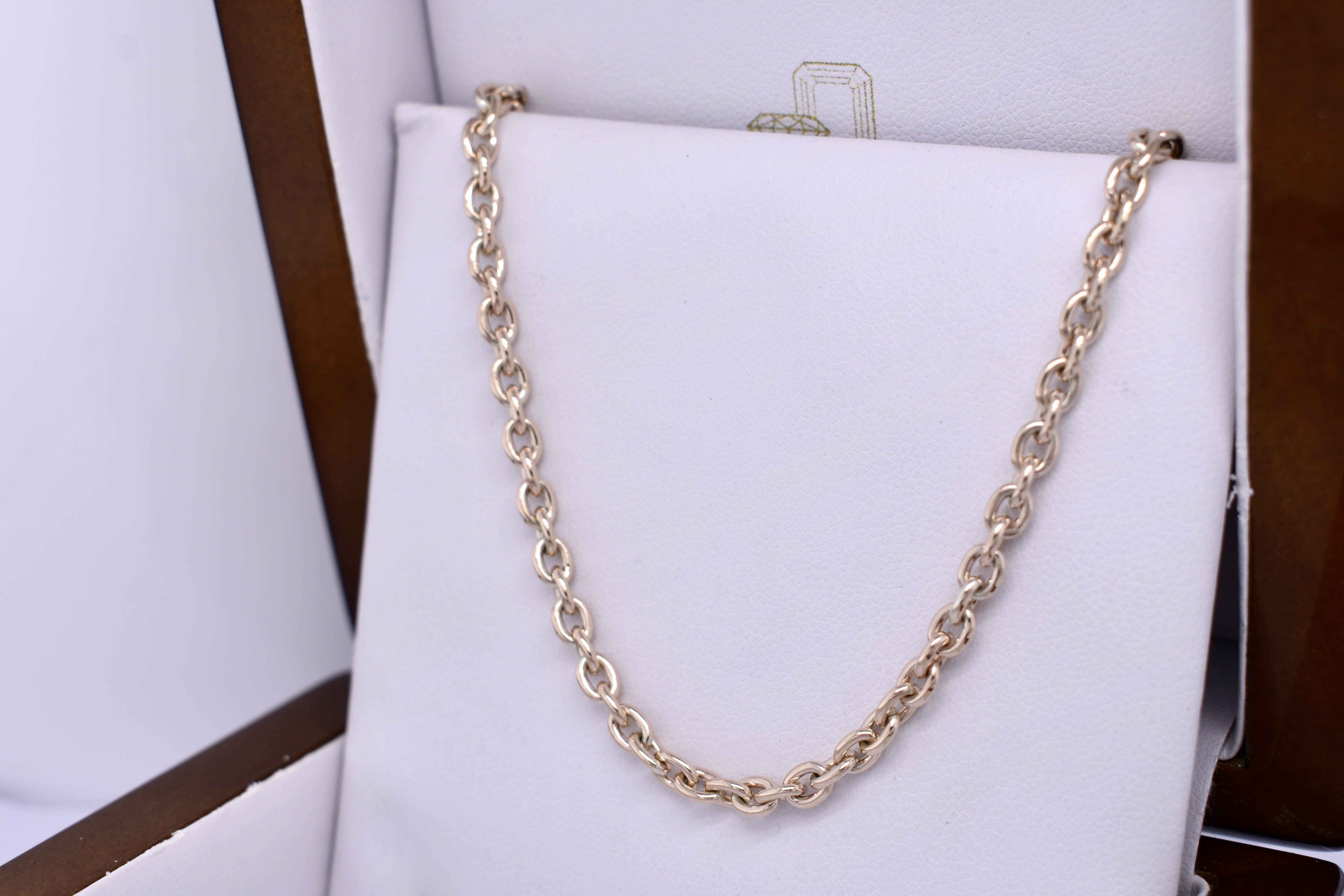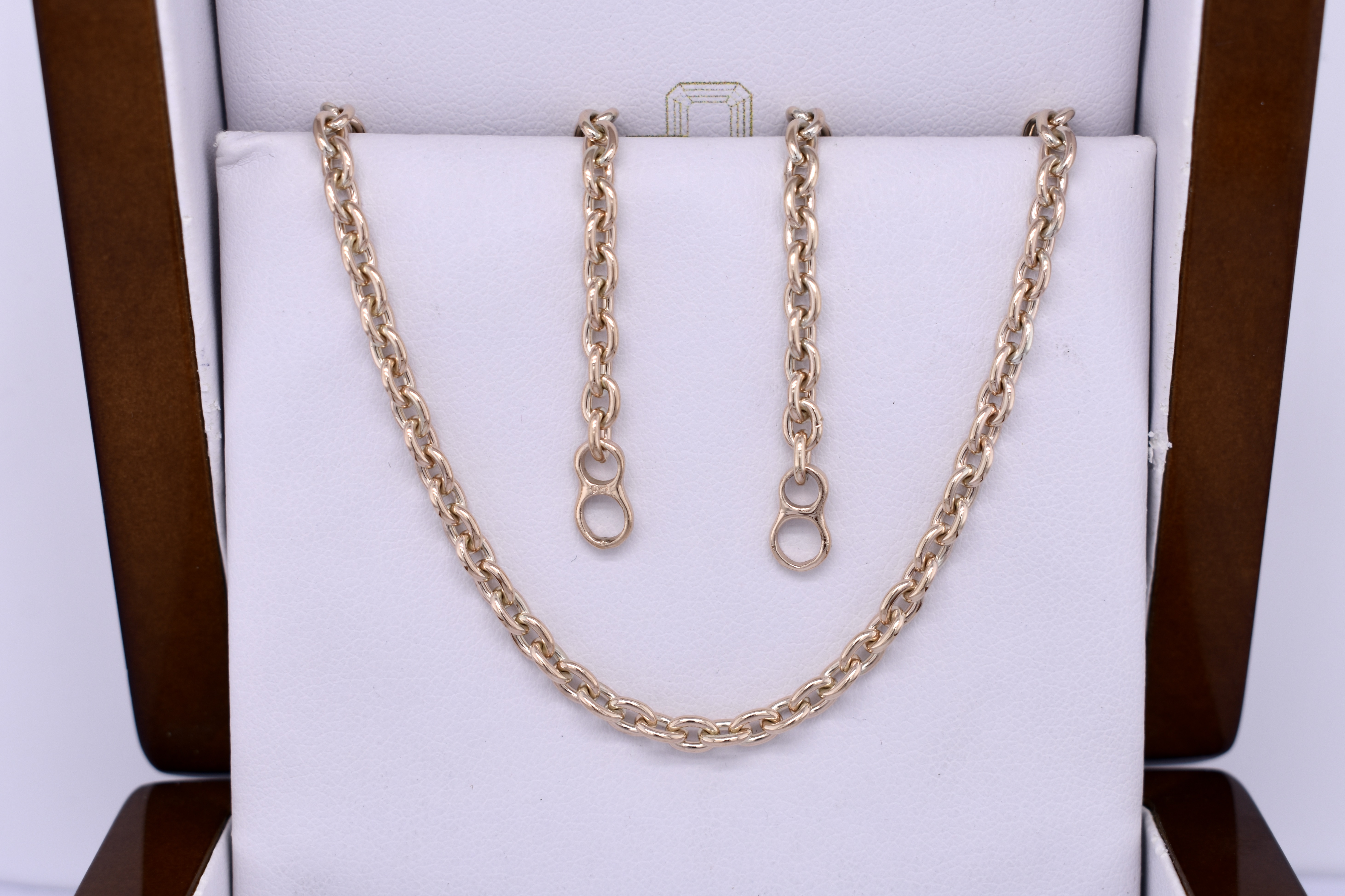 This stunning chain was handmade by our goldsmith in 9ct yellow gold in this pretty cable link. It has two jump rings on the ends, offering great versatility for different clasps, carabiners and brooches. Chain measures 42.5cm long and weighs 14.0grams.