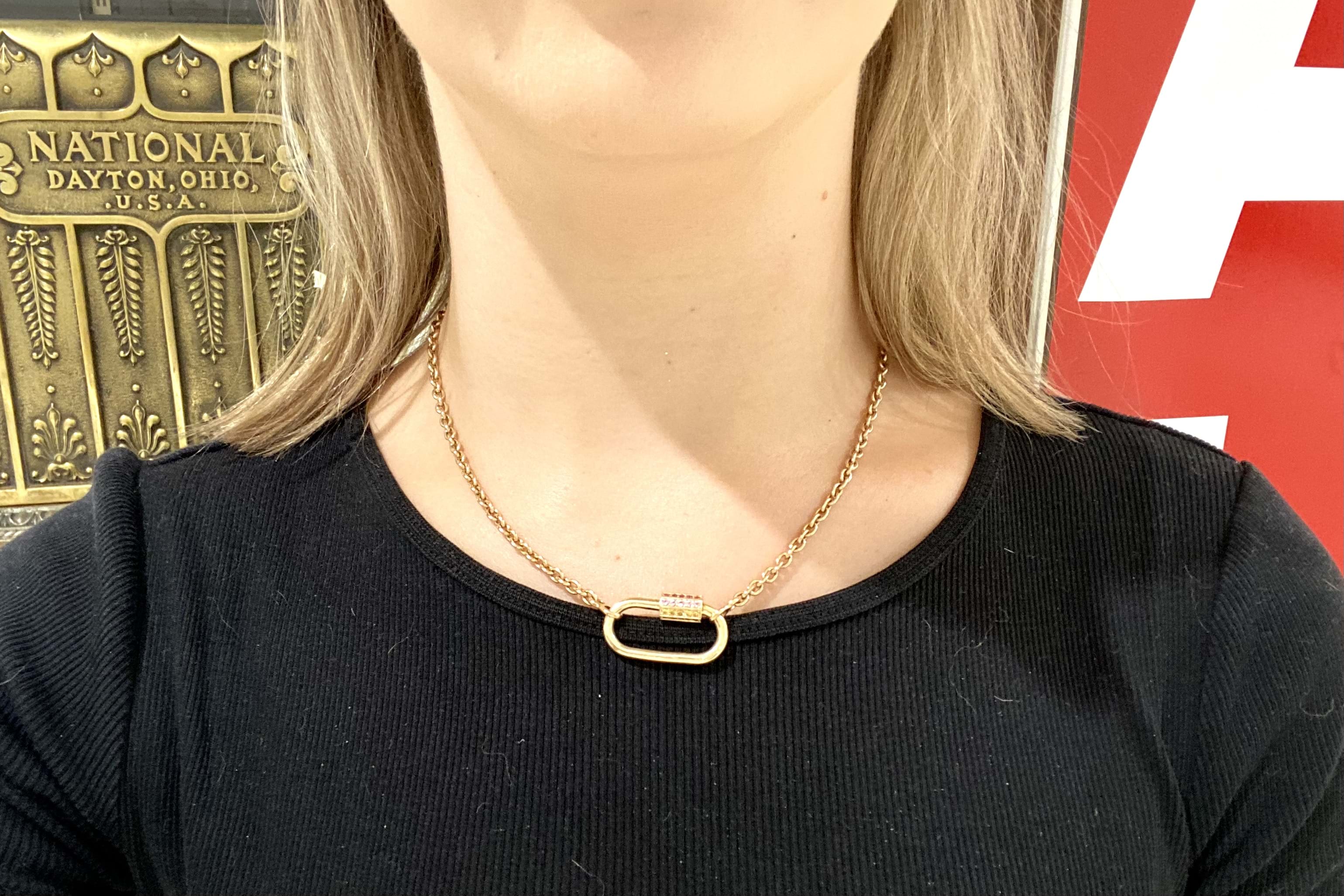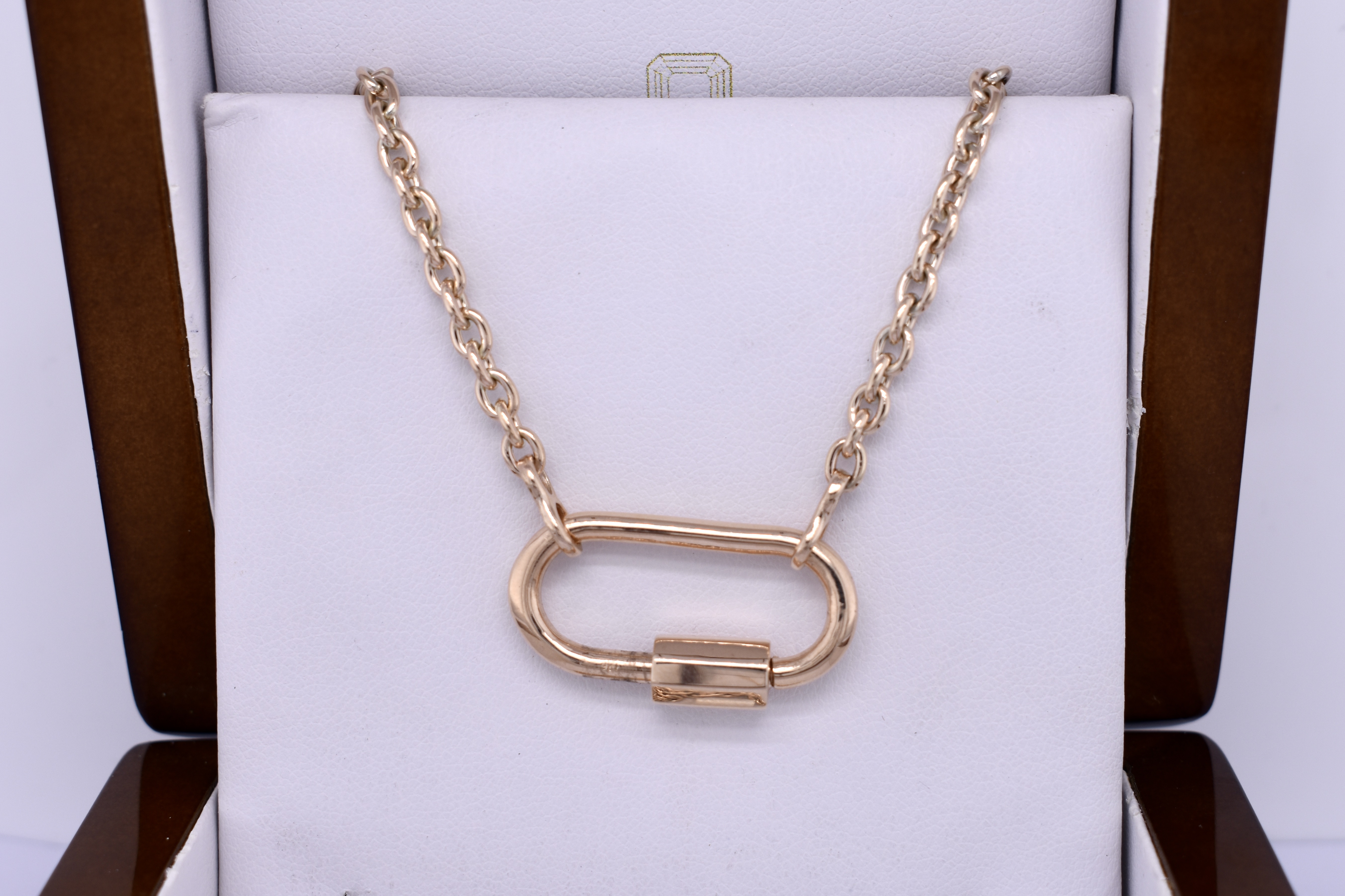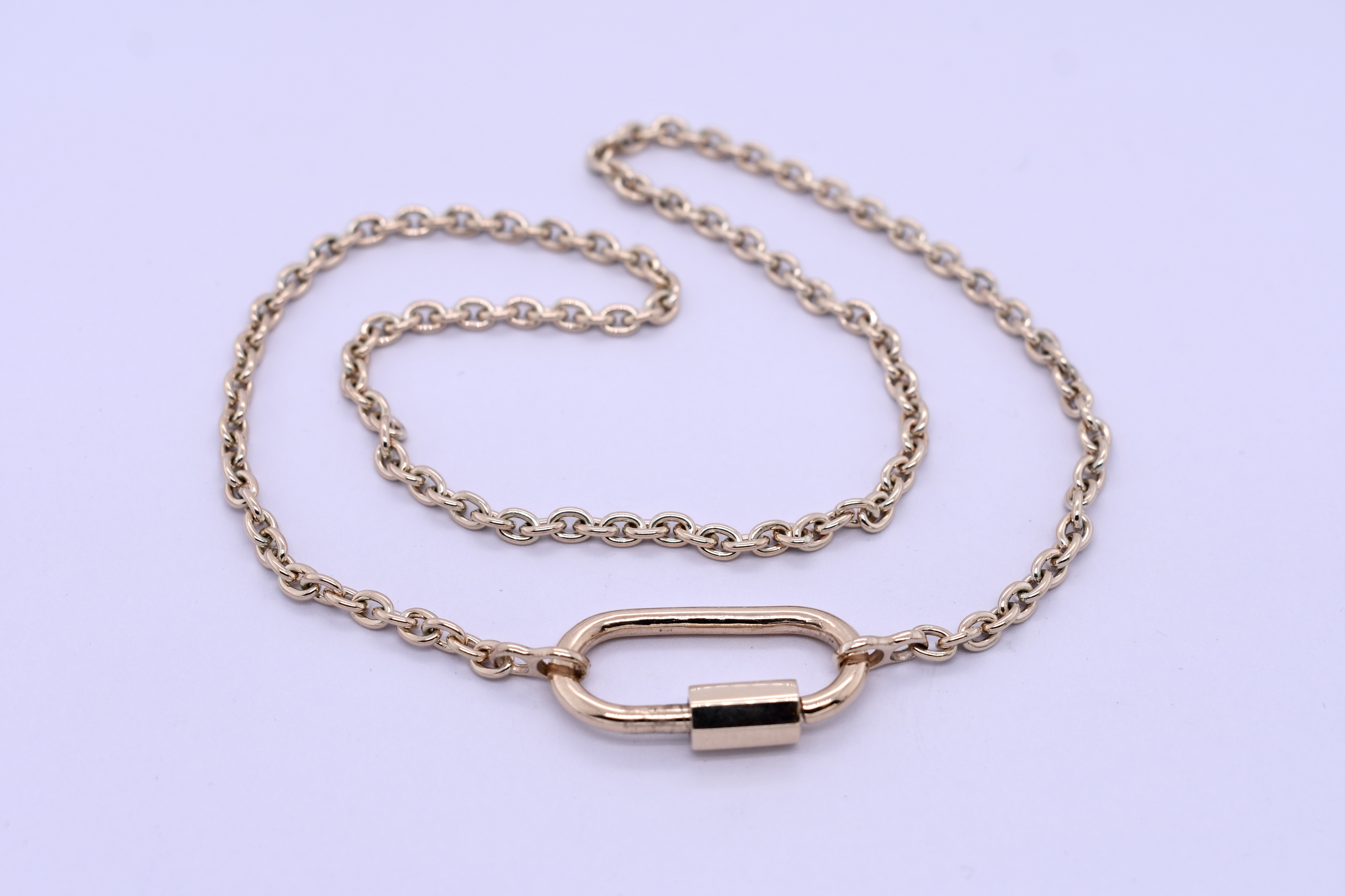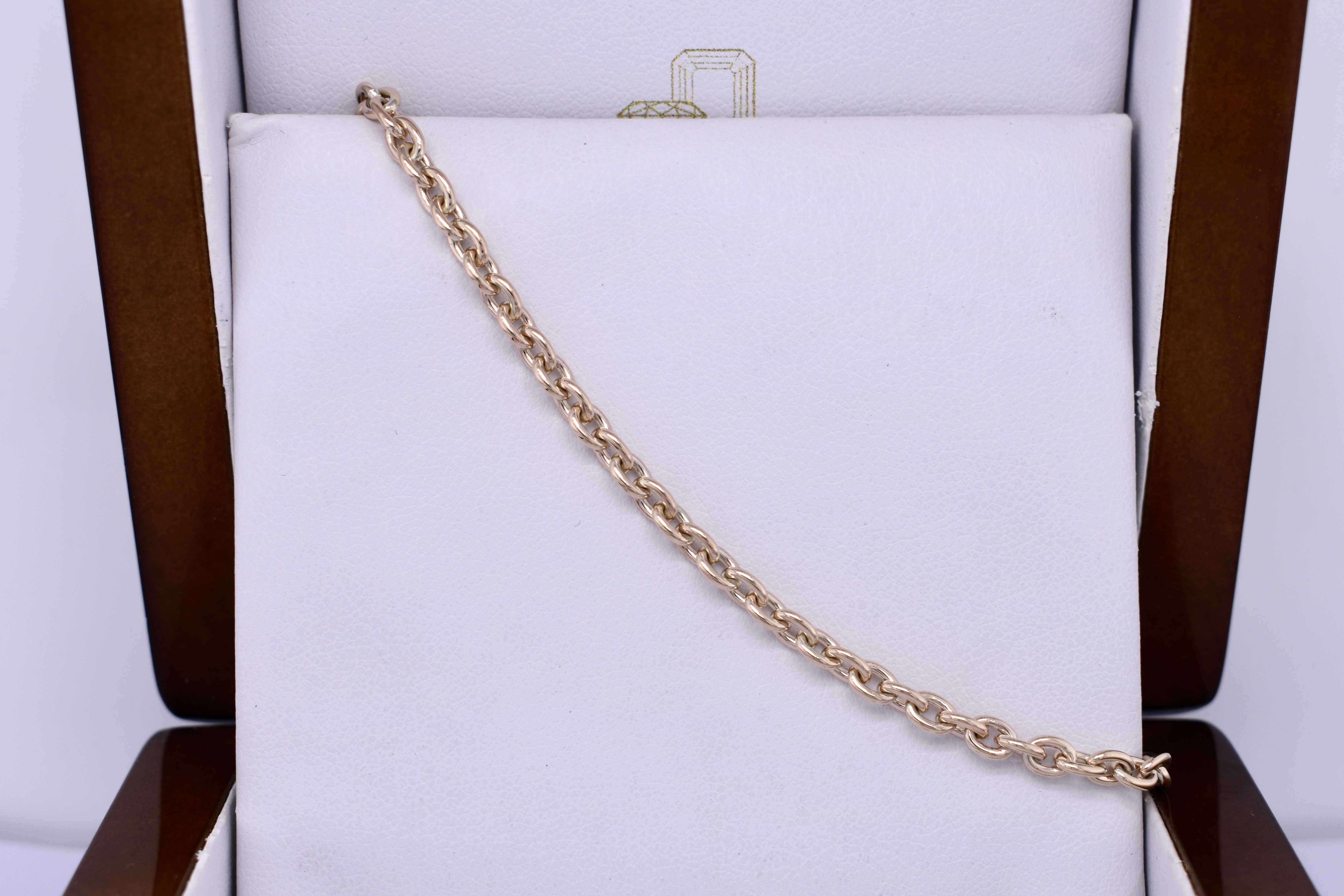 This stunning chain was handmade by our goldsmith in 9ct yellow gold in this pretty cable link. It has two jump rings on the ends, offering great versatility for different clasps, carabiners and brooches. Chain measures 42.5cm long and weighs 14.0grams.
