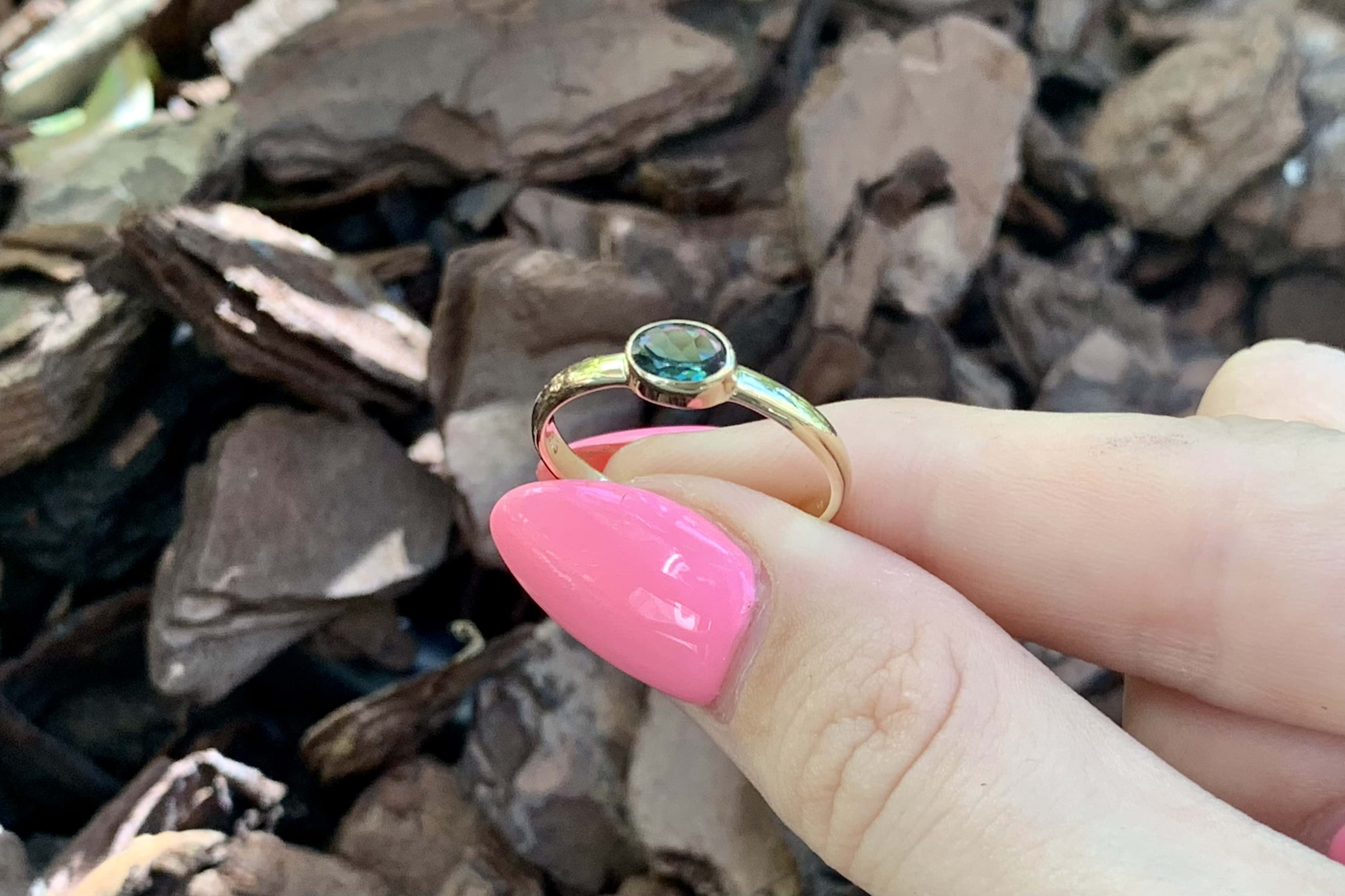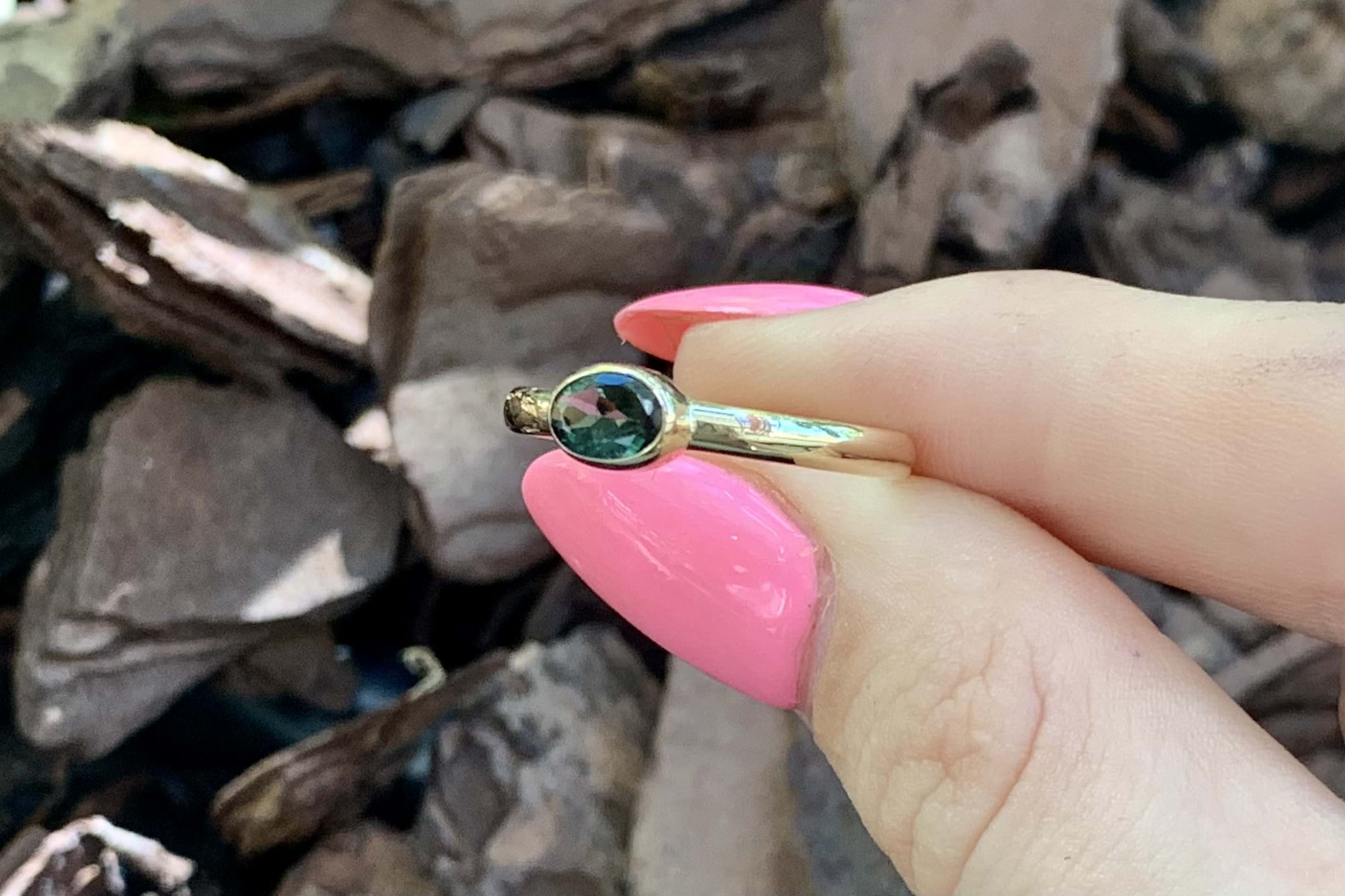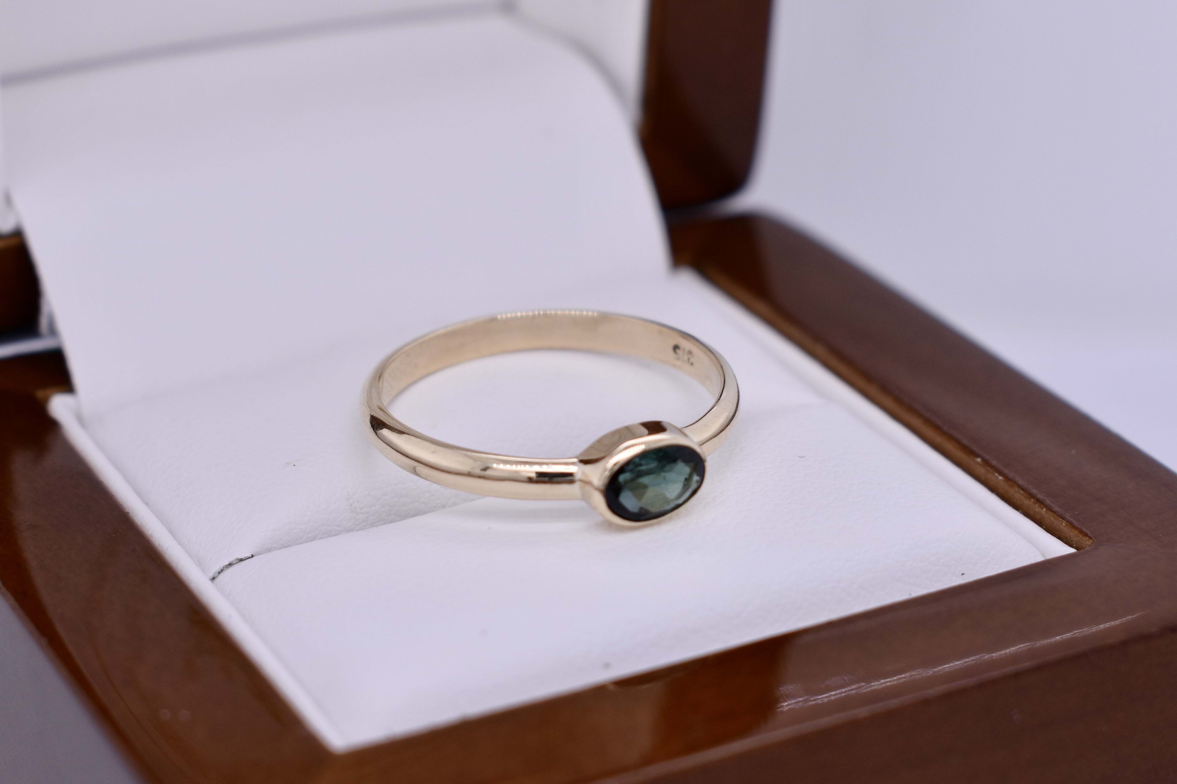 Deep green sparkling tourmaline, oval shaped measuring 6.8x5.1mm, is east west bezel set in a handmade 9ct yellow gold setting. Finished on a plain gold band. Finger size P+.