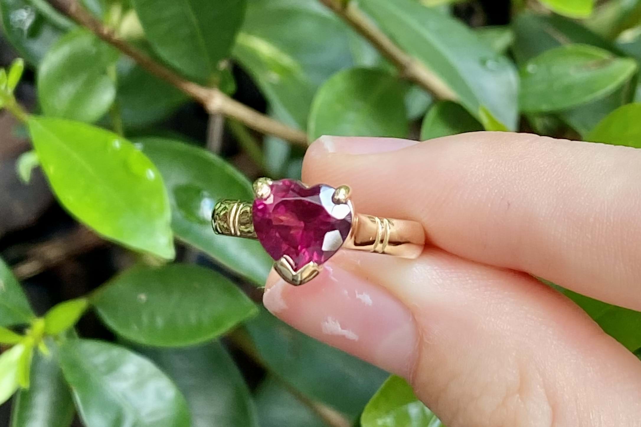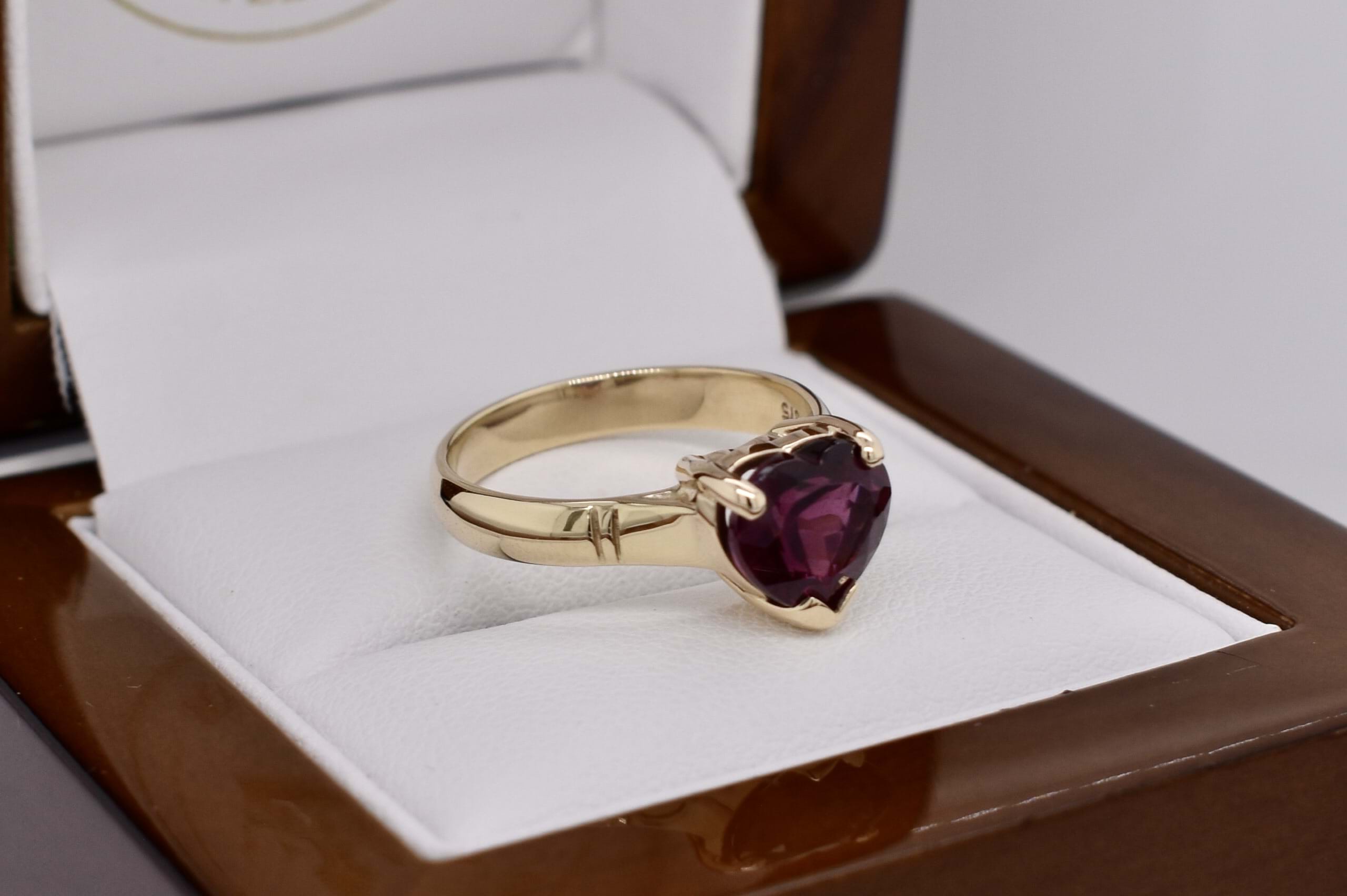 The sweetest heart shaped ring, featuring a 8.5mm heart shaped rhodolite garnet, cap and two claw set onto a plain handmade band. Finger size L+.
