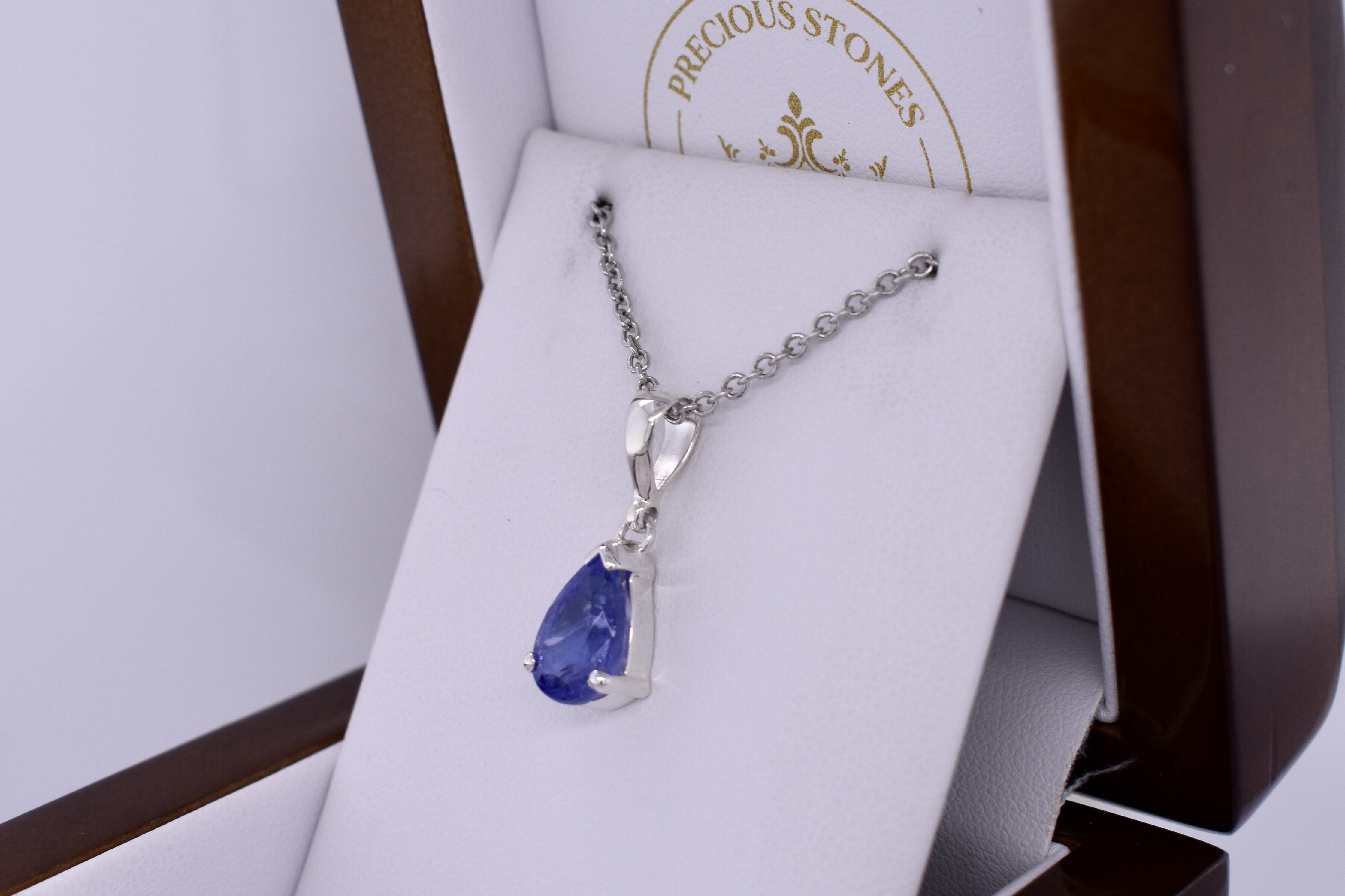 This appealing pendant features a gorgeous pearshape tanzanite measuring approx. 11.65x8.1mm, two claw and cap set into a handmade sterling silver setting. Finished with a plain bale. Chains are available for separate purchase.