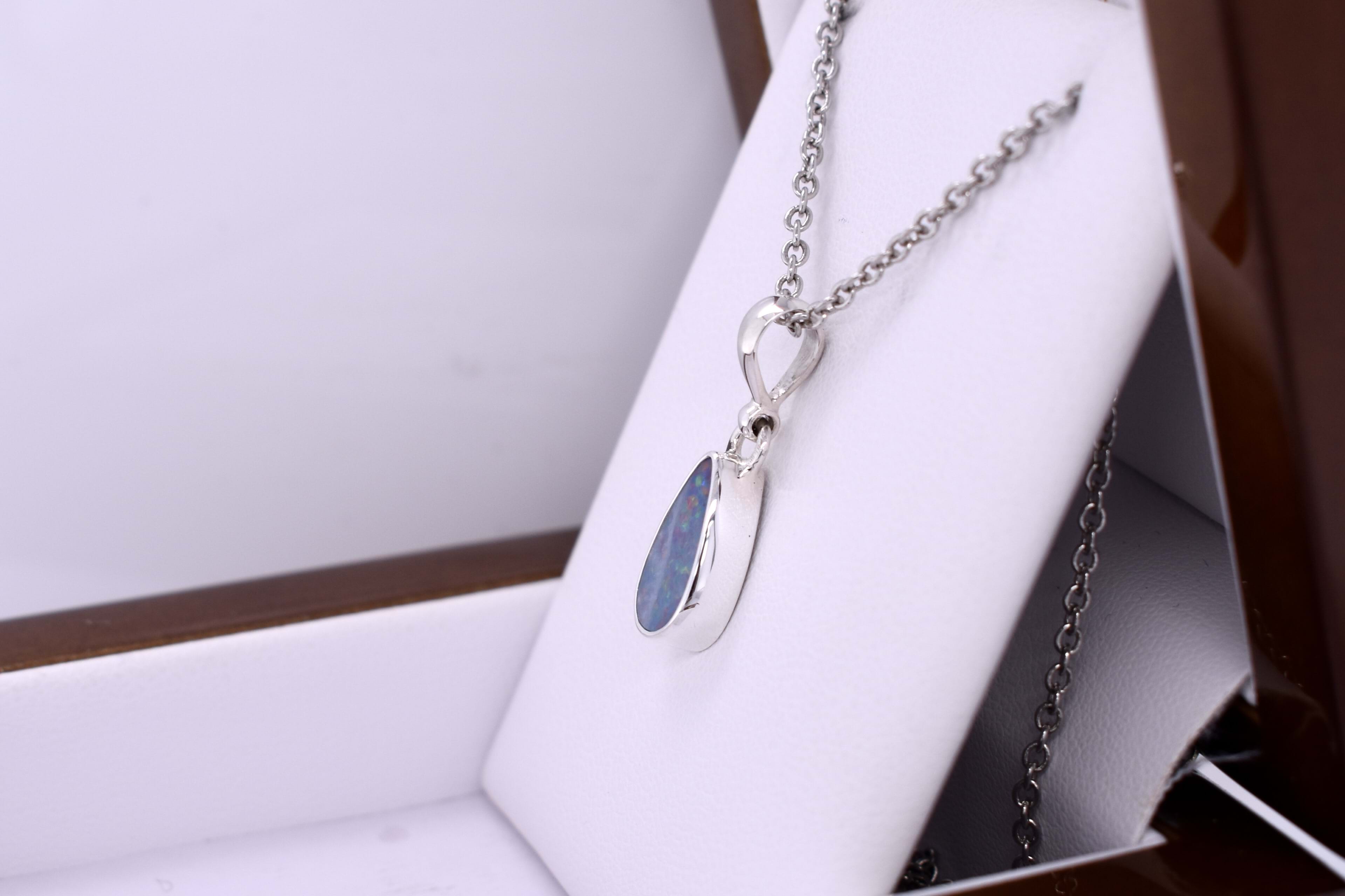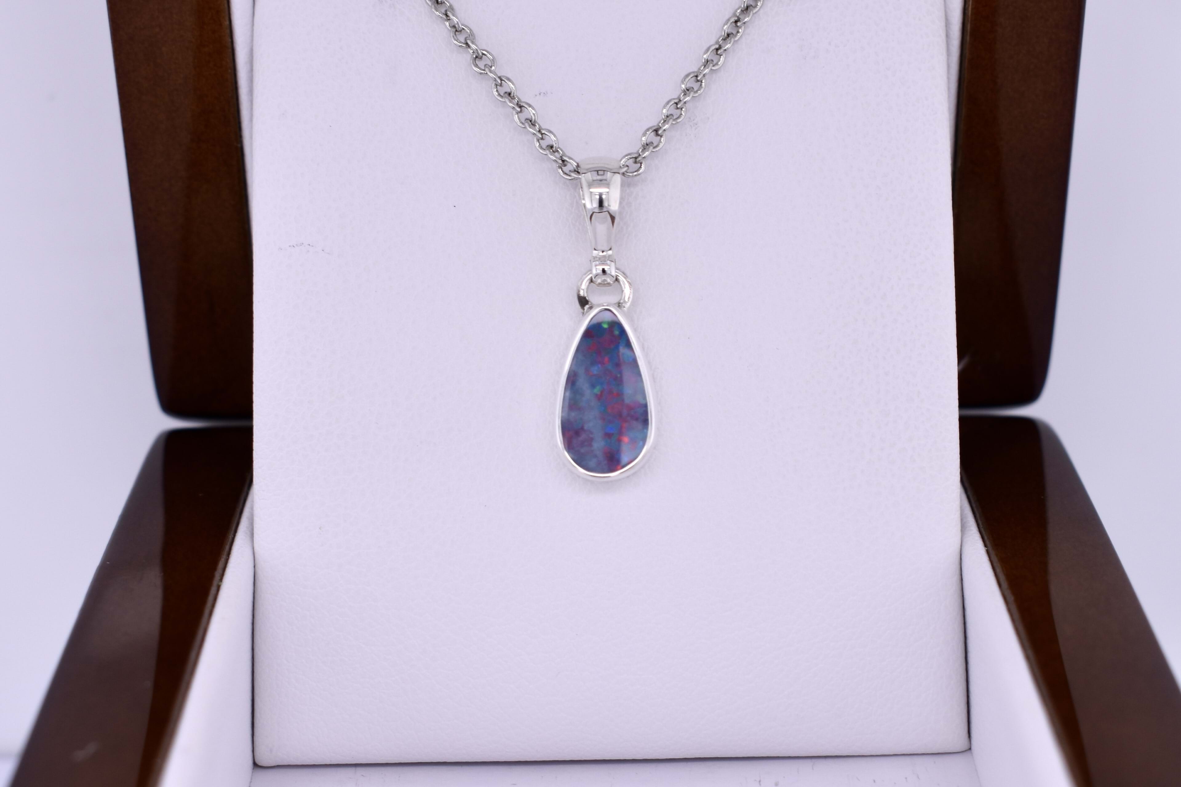 This lovely pendant is handmade and features a freeform Coober Pedy opal measuring approx. 13x7mm, set into a sterling silver bezel setting. The opal is a doublet, with a boulder opal backing and shows flashes of red and purple throughout. Finished with a plain bale. Chains are available for separate purchase.
