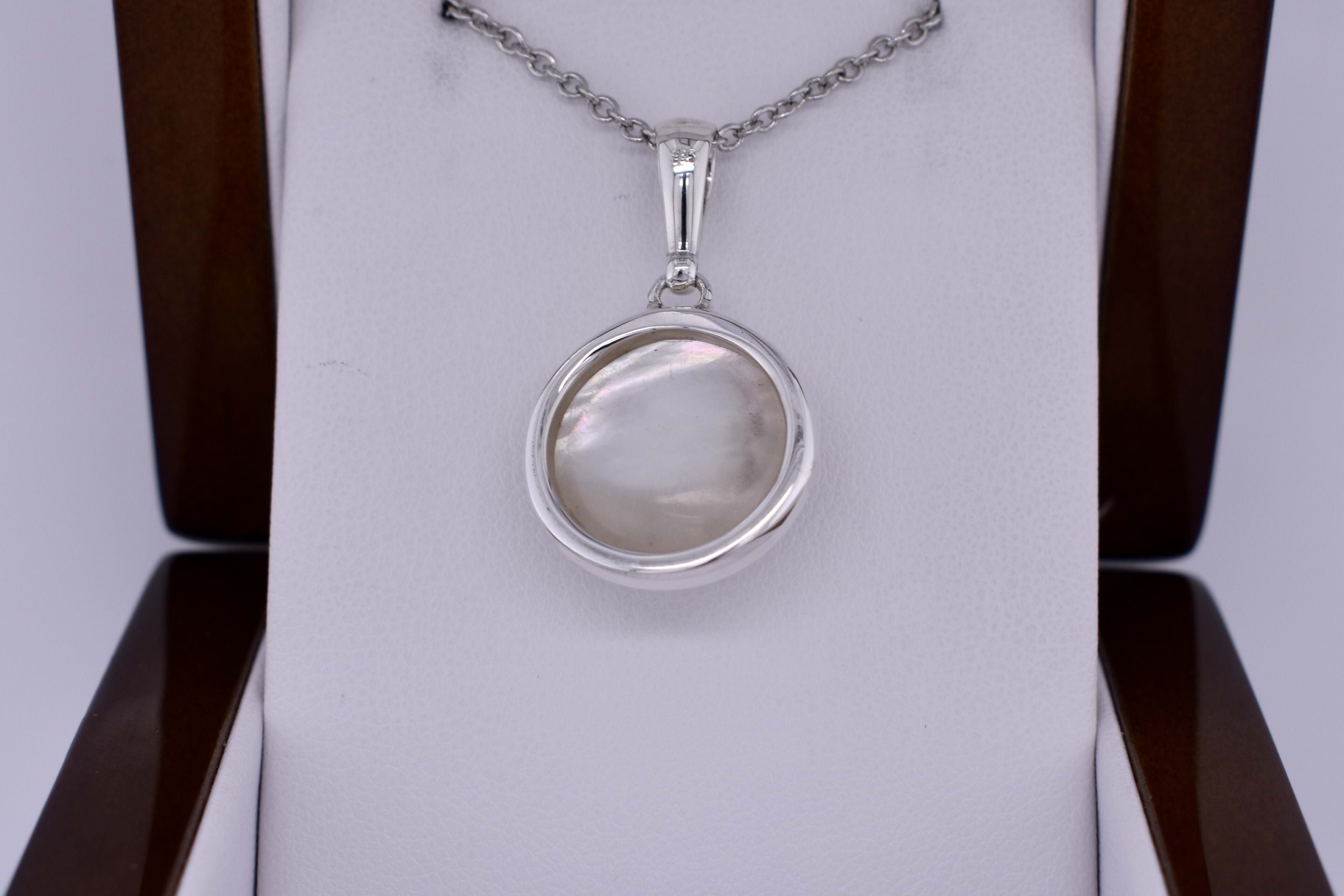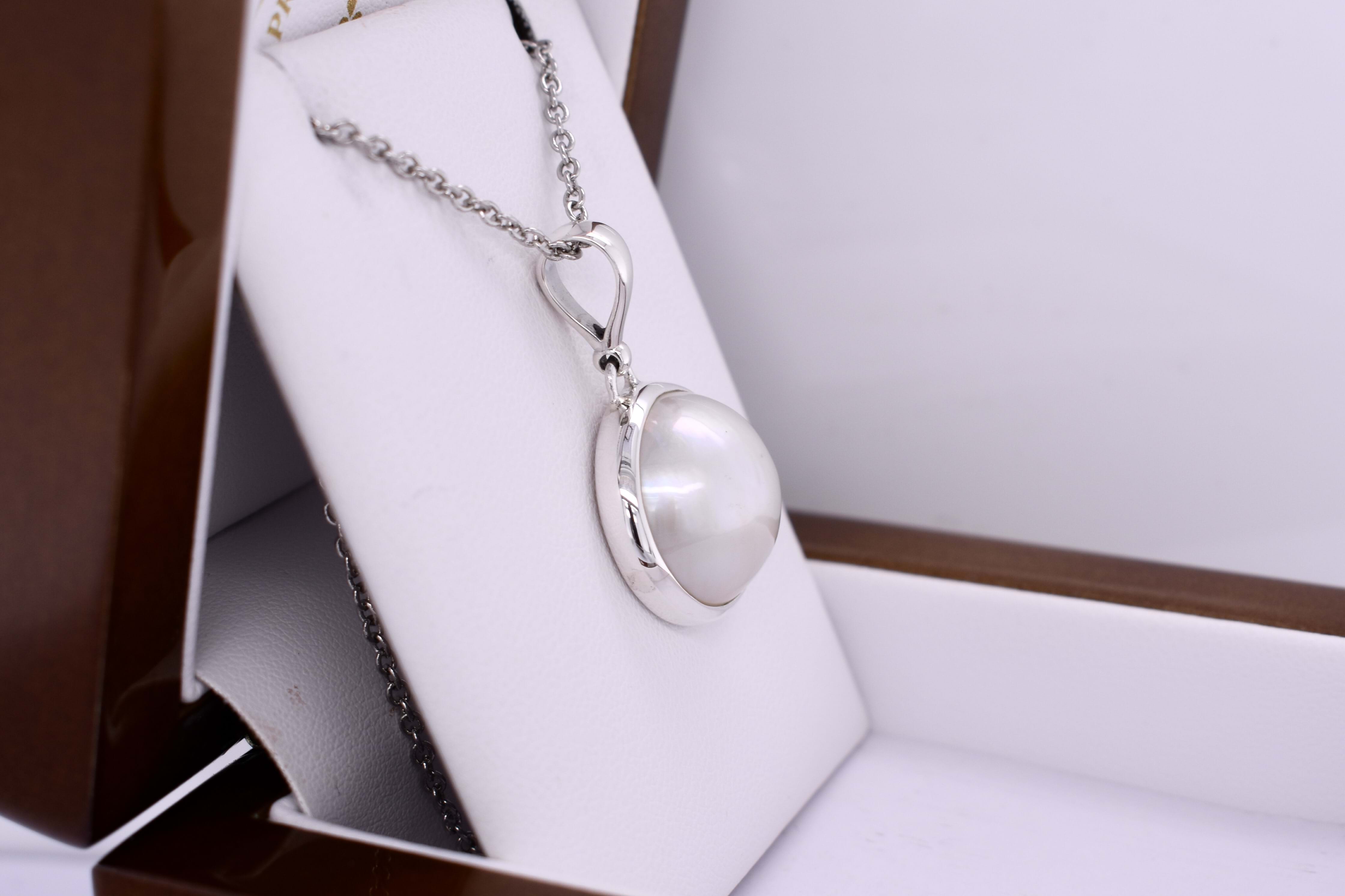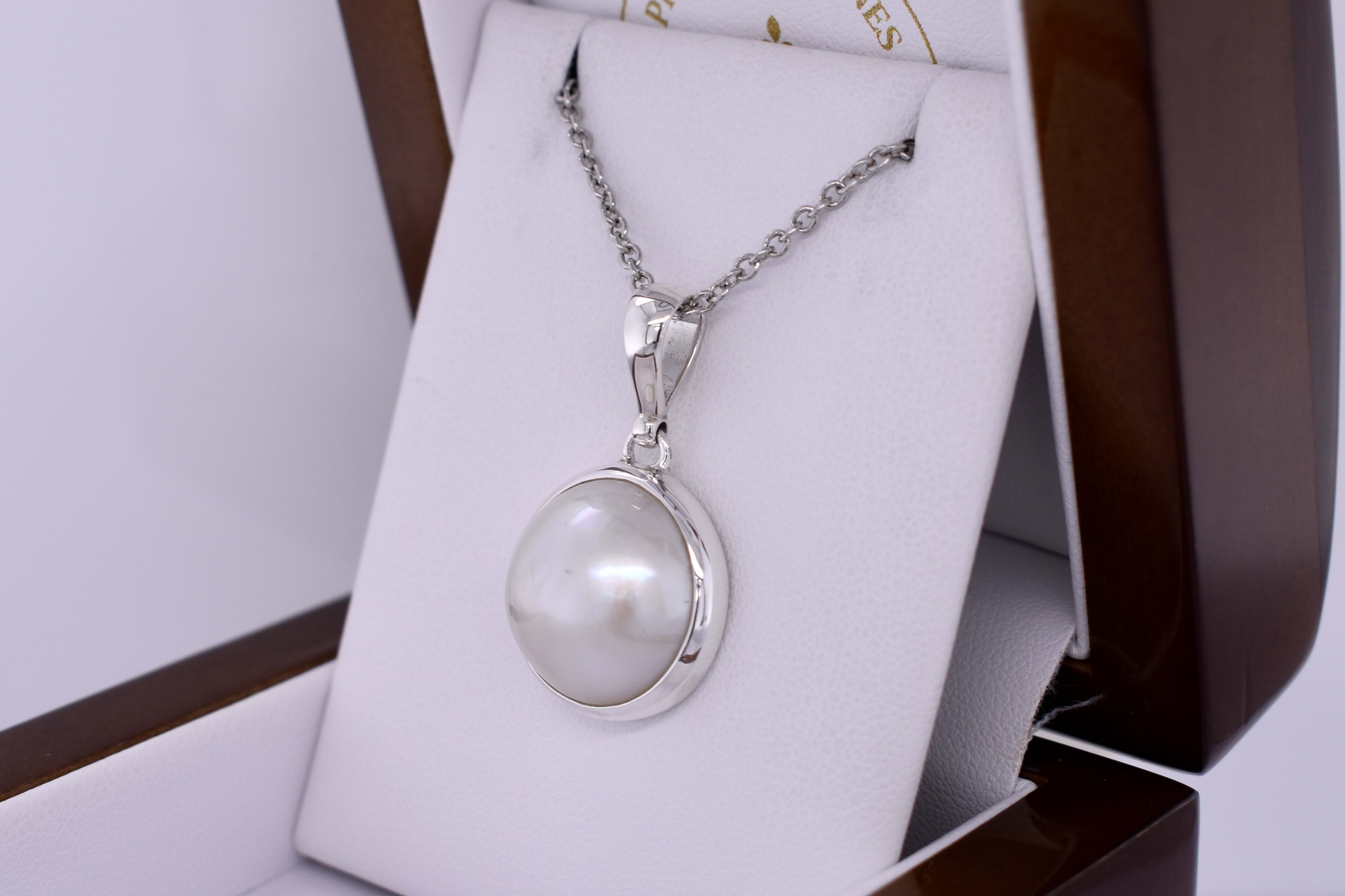 This classic pendant is handmade and features a round white mabe pearl measuring approx. 17.9mm, bezel set into sterling silver. Finished with a plain bale. Chains are available for separate purchase.