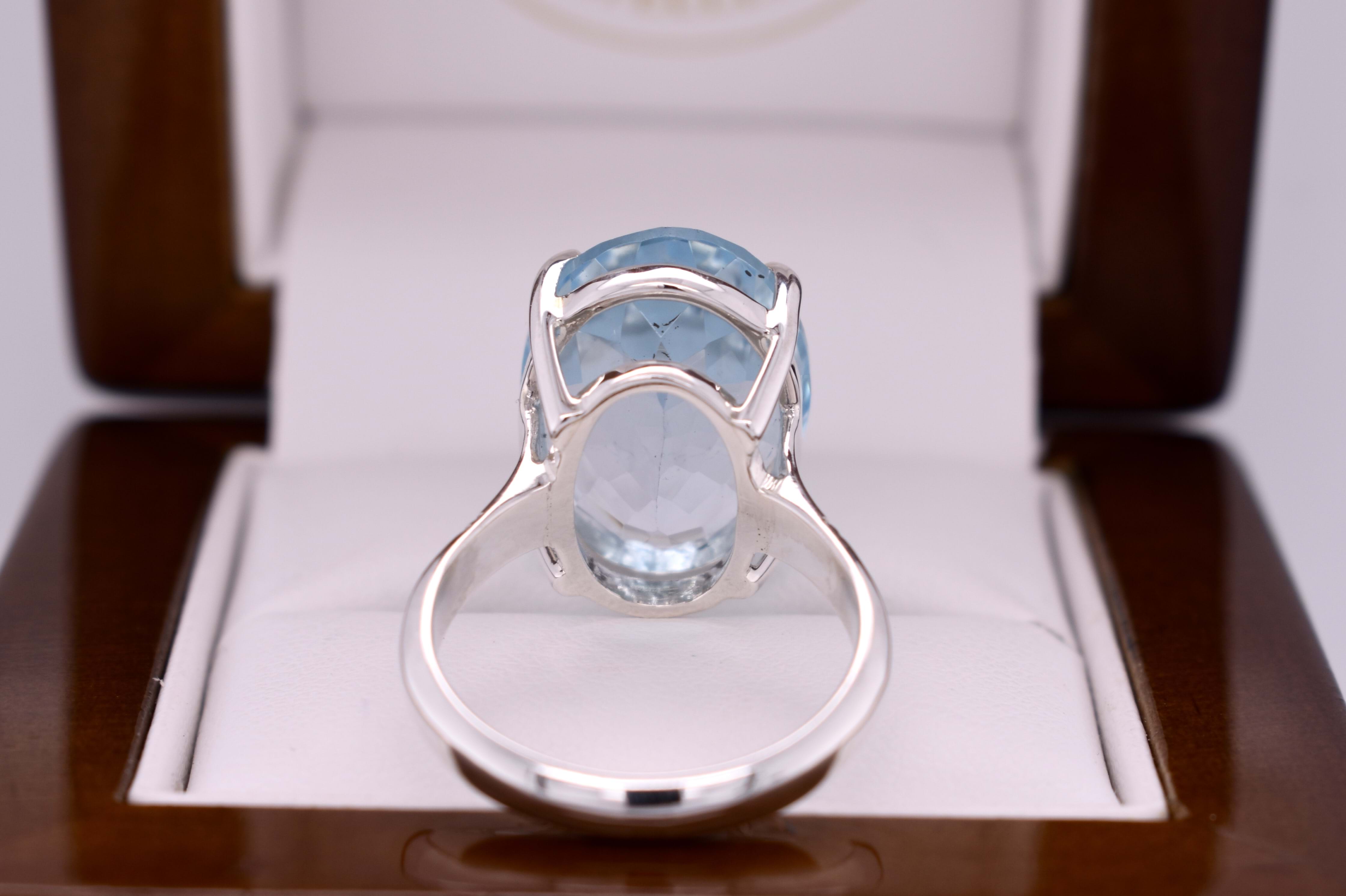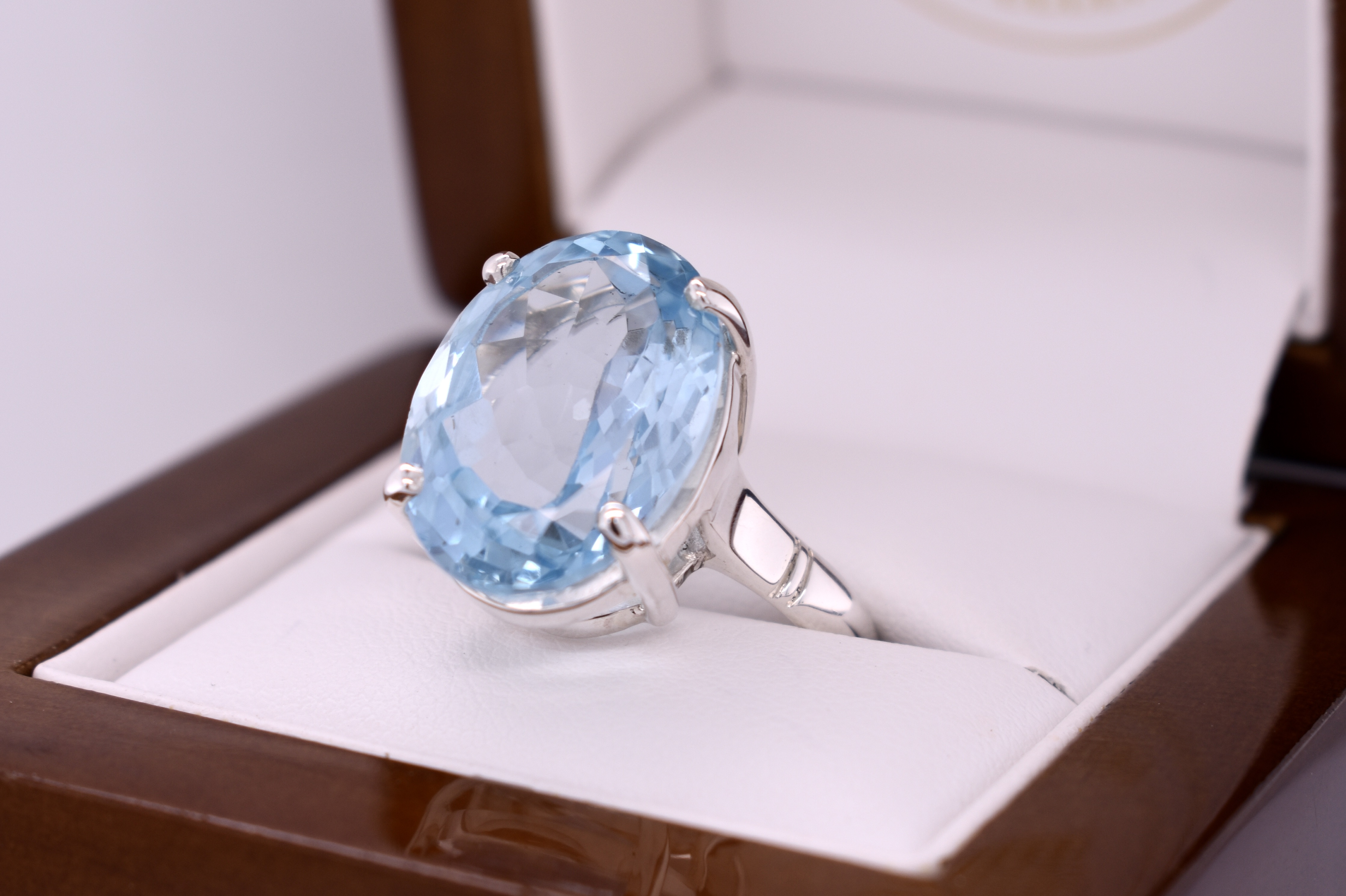 This stunning ring is handmade and features an oval sky blue topaz measuring approx. 18x13mm, set into a four claw setting. Finished on a plain grooved band. Finger size O+.