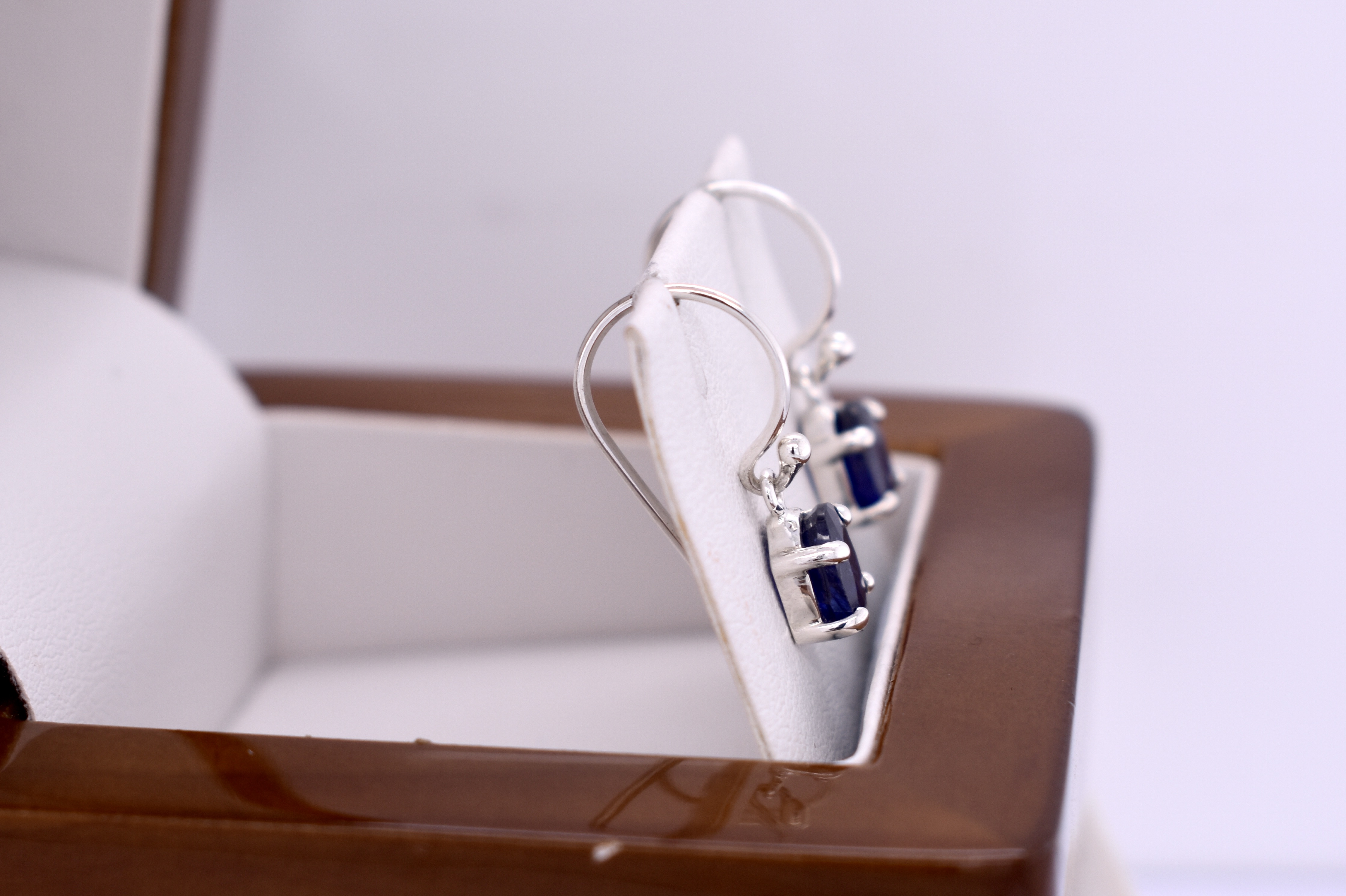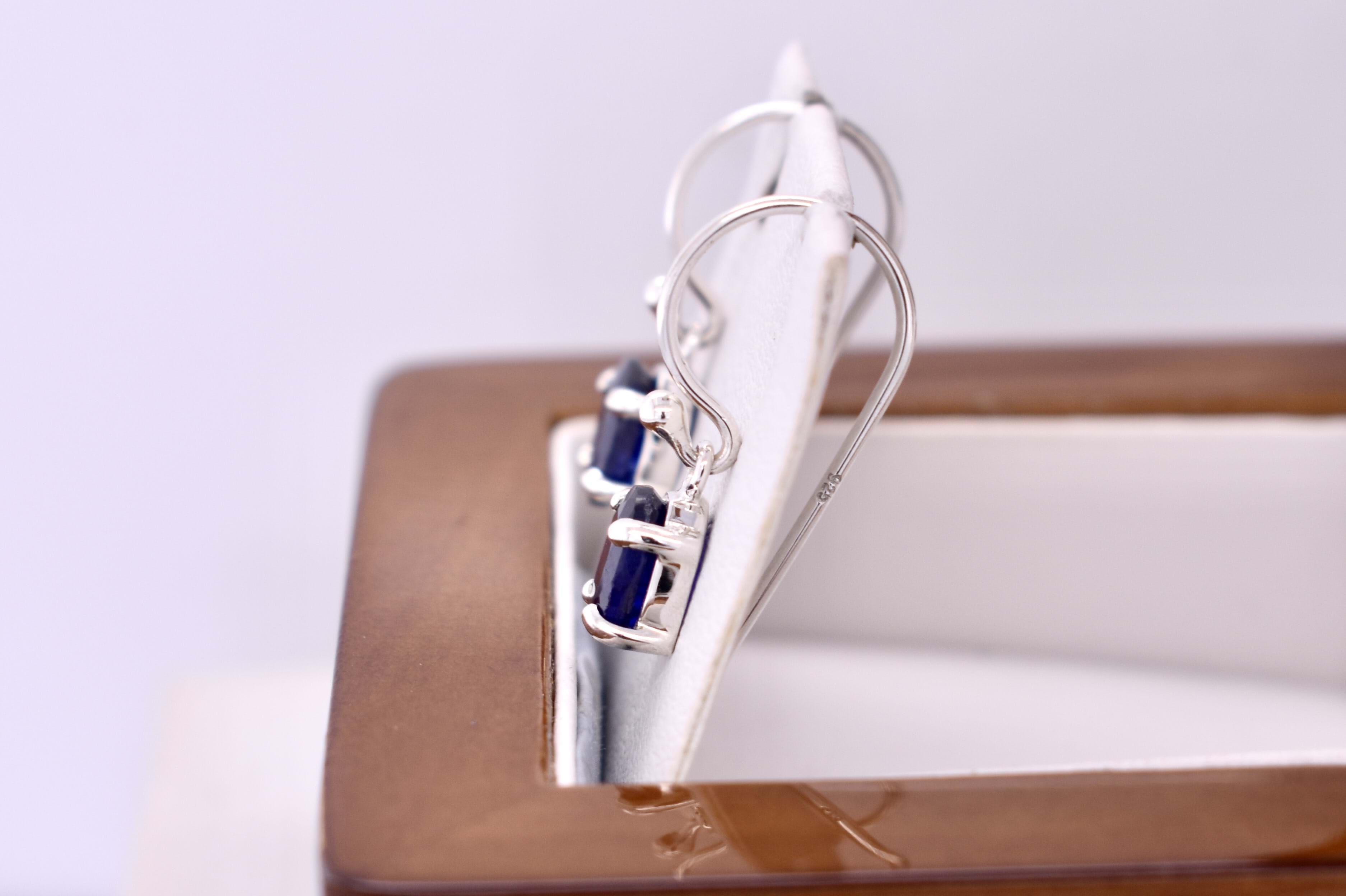 These appealing earrings feature deep blue oval sapphires measuring approx. 6.9x5.3mm, four claw set into handmade sterling silver settings. Finished with shepherd hook fittings for everyday wear.