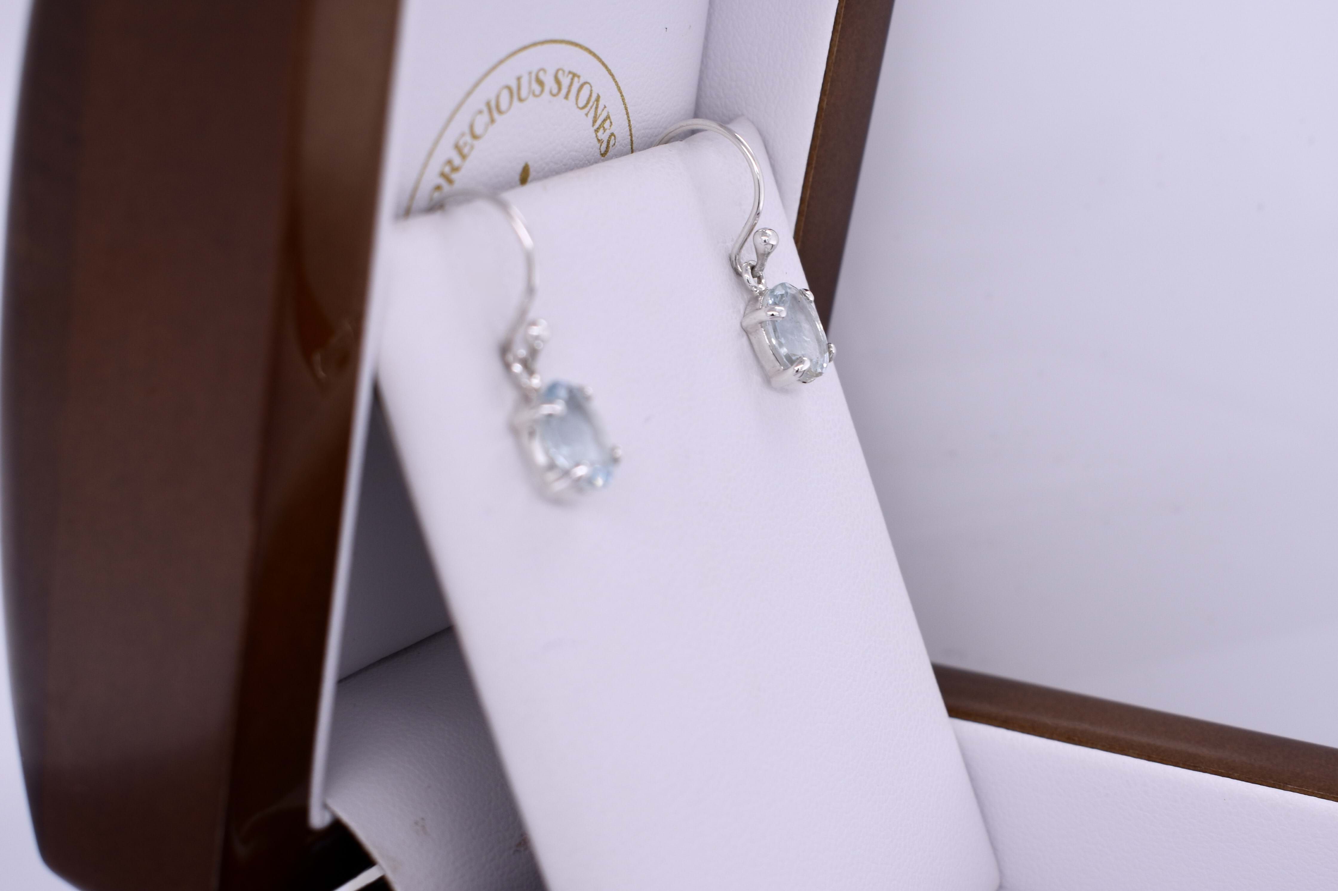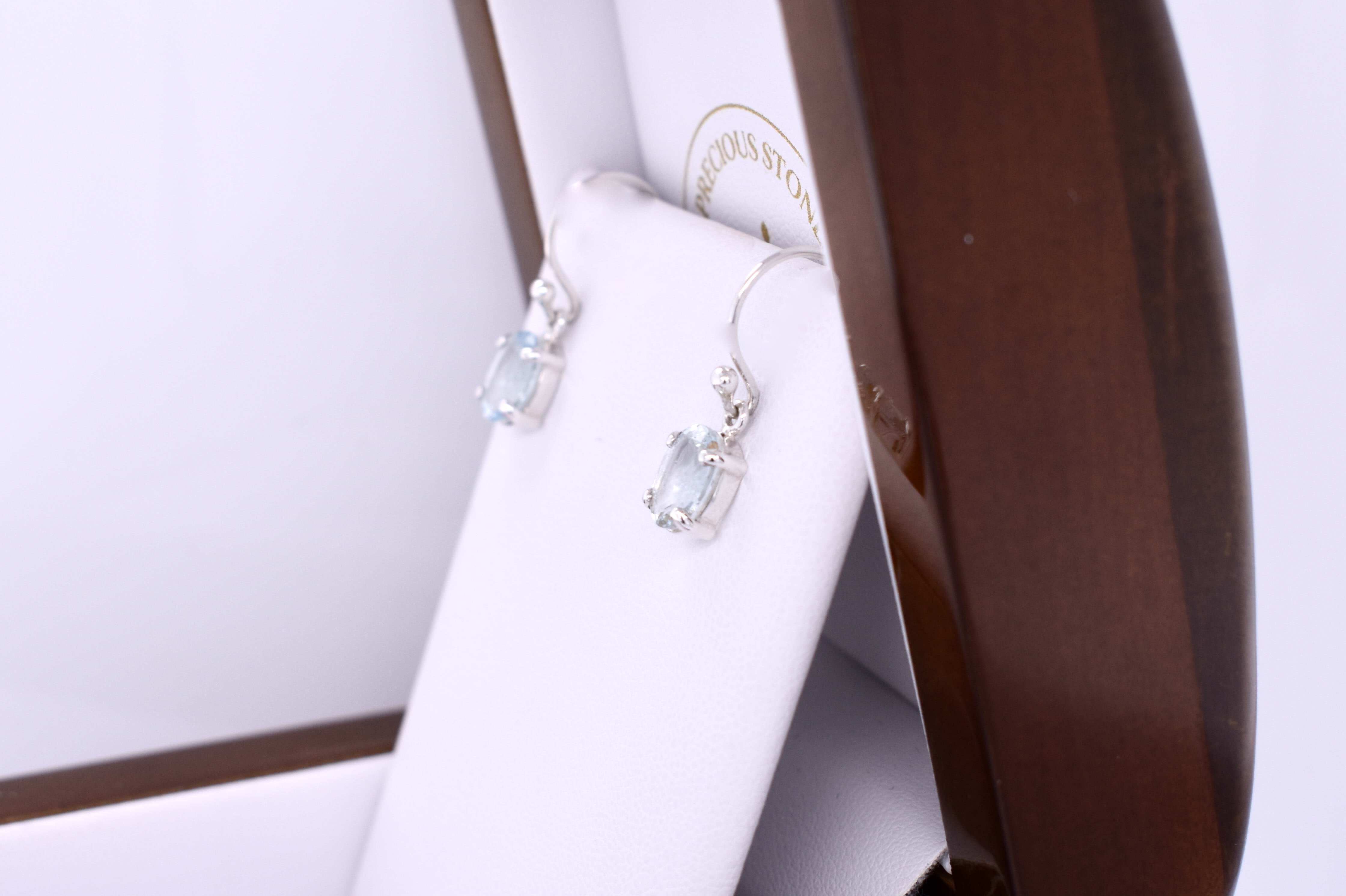These classic earrings feature light blue oval aquamarines measuring approx. 8.8x6.4mm, four claw set into handmade sterling silver settings. The earrings are finished with shepherd hook fittings for everyday wear.