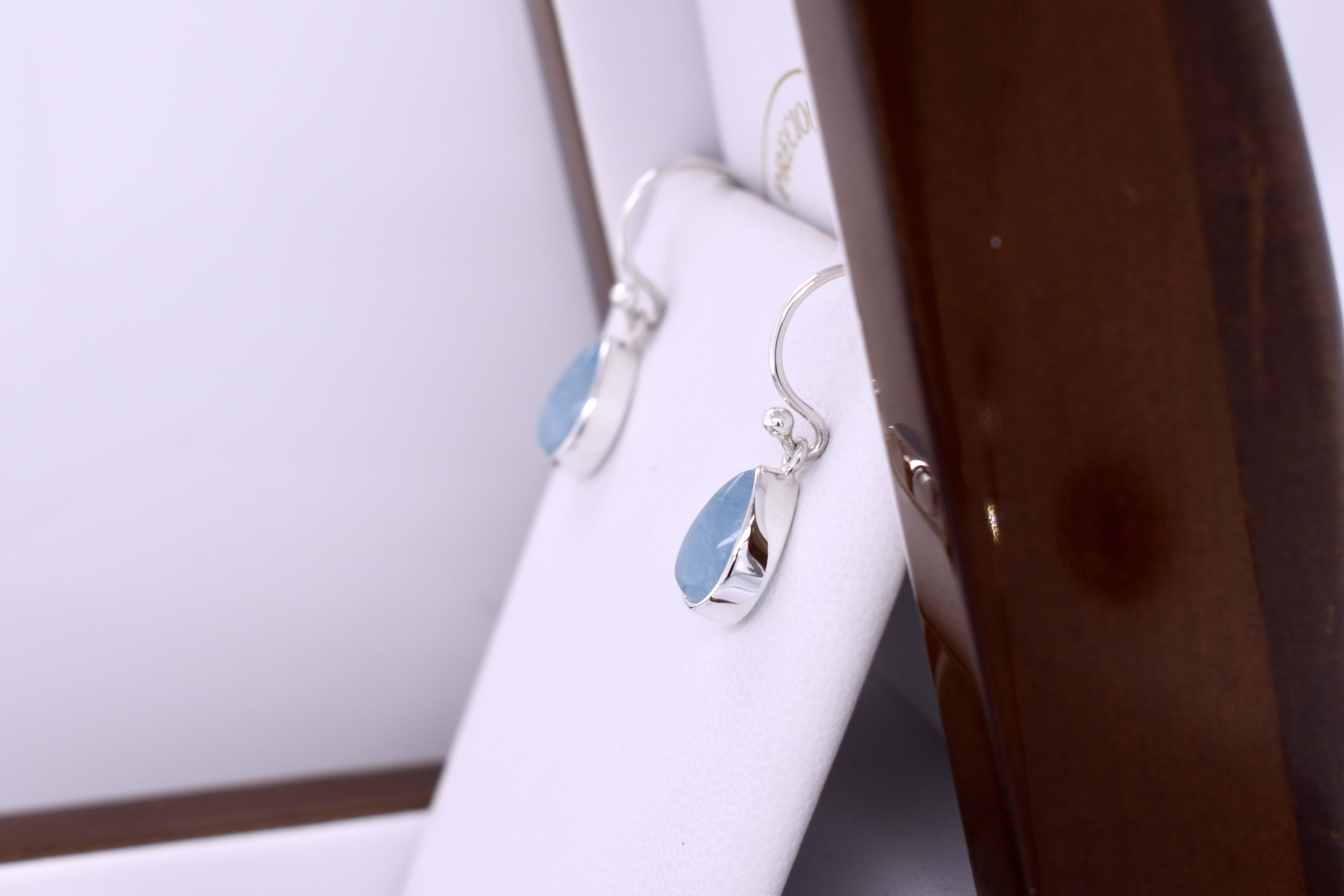 These gorgeous earrings feature pretty pearshape cabochon aquamarines measuring approx. 9.3x6.9mm, bezel set into handmade sterling silver settings. The earrings are finished with shepherd hook fittings for everyday wear.