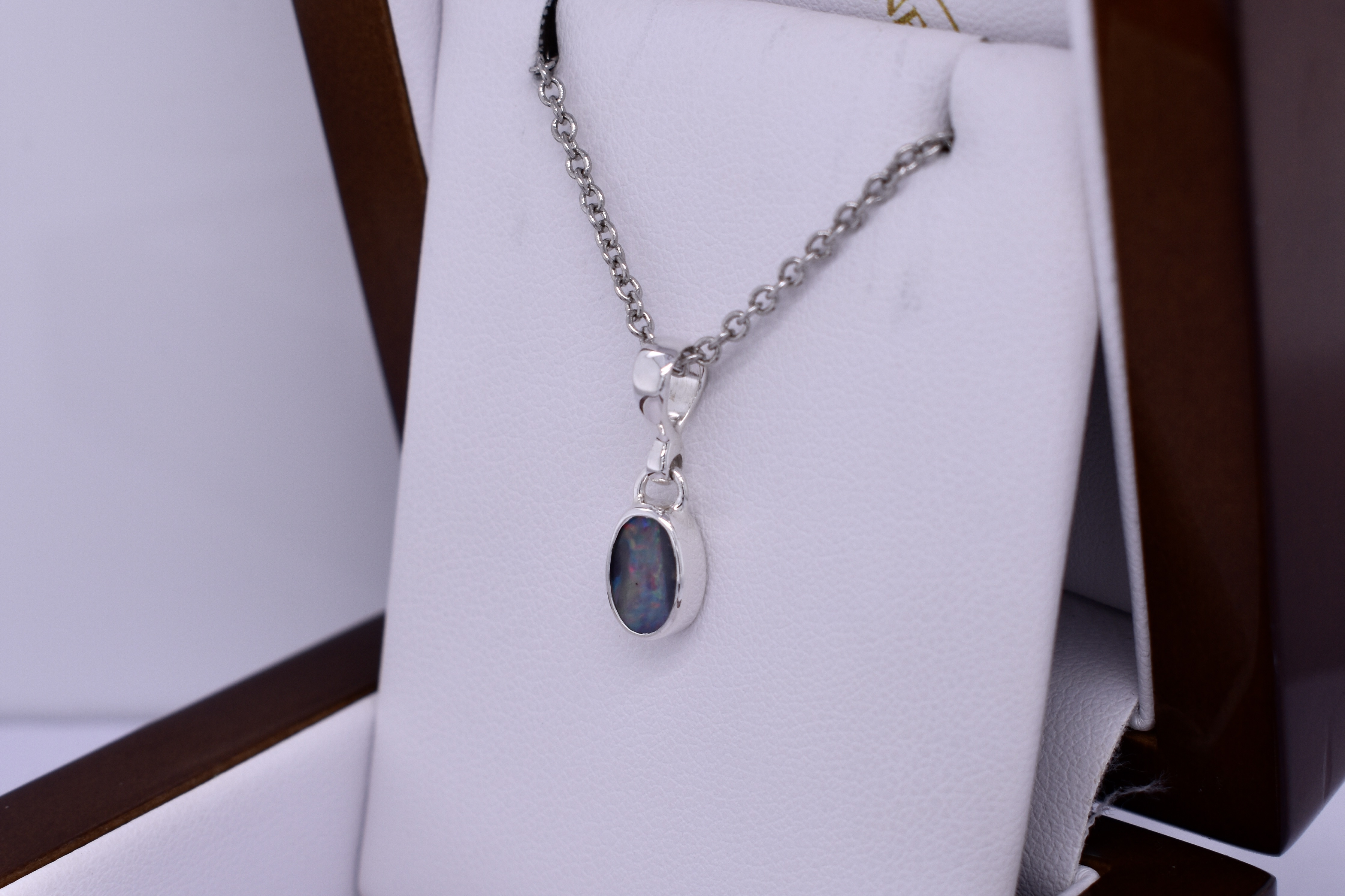 This classic pendant is handmade and features an oval boulder opal measuring approx. 9x5.8mm, set into a sterling silver bezel setting. The opal shows flashes of red and green throughout. Finished with a plain bale. Chains are available for separate purchase.