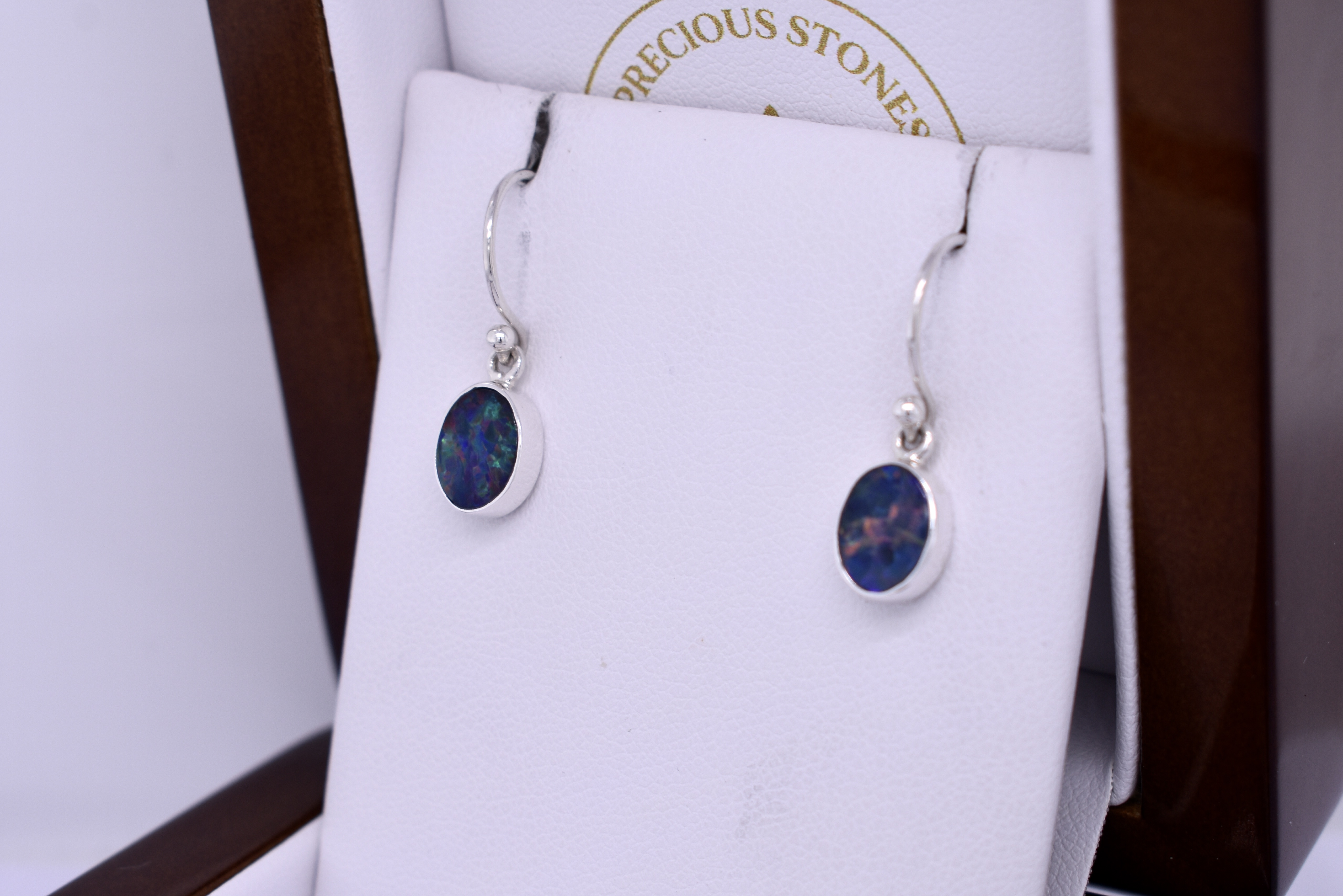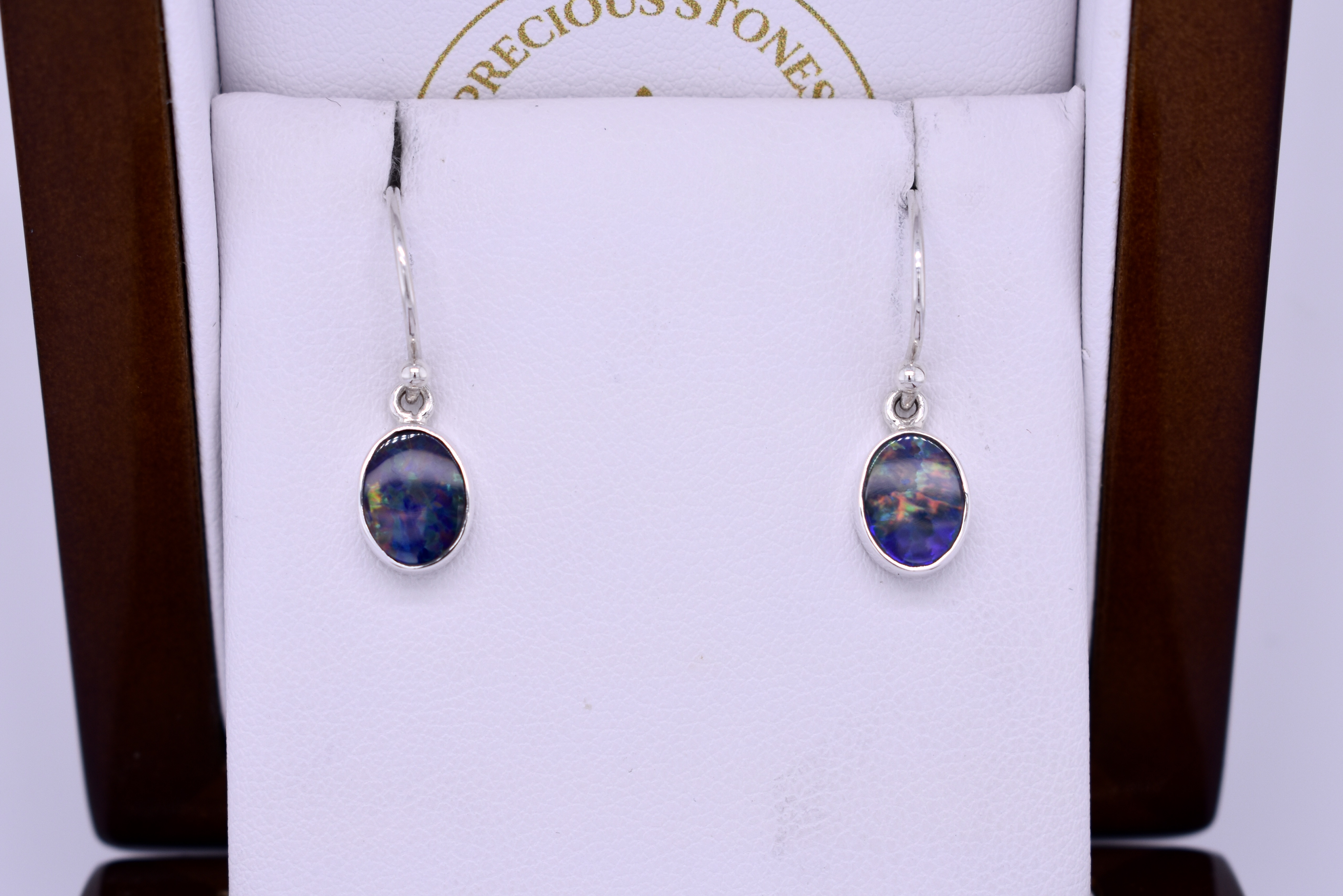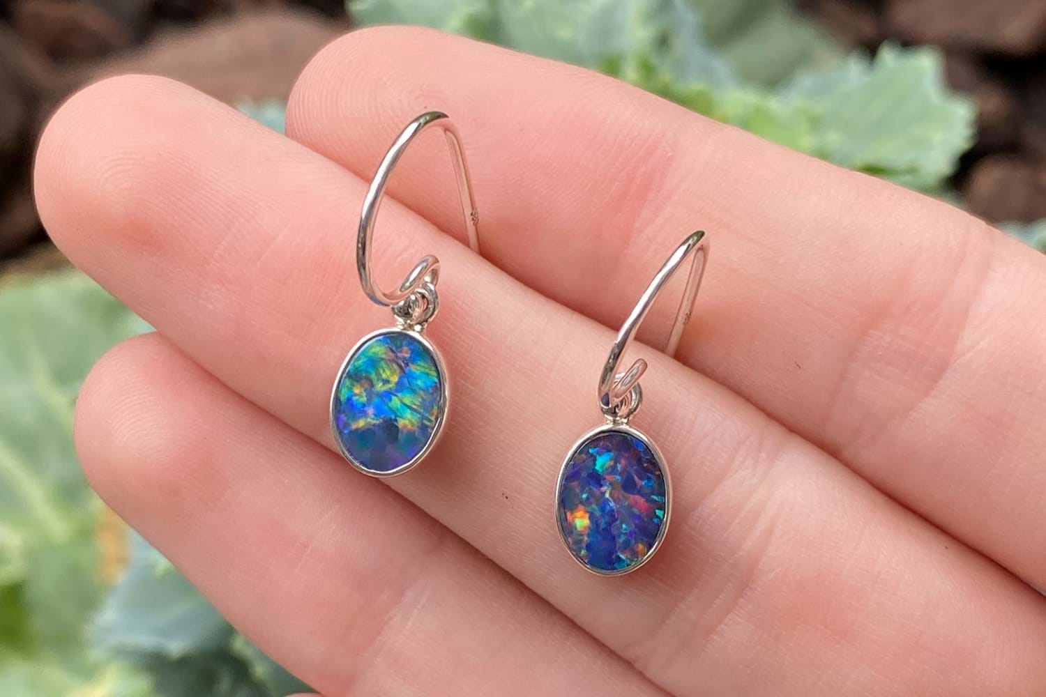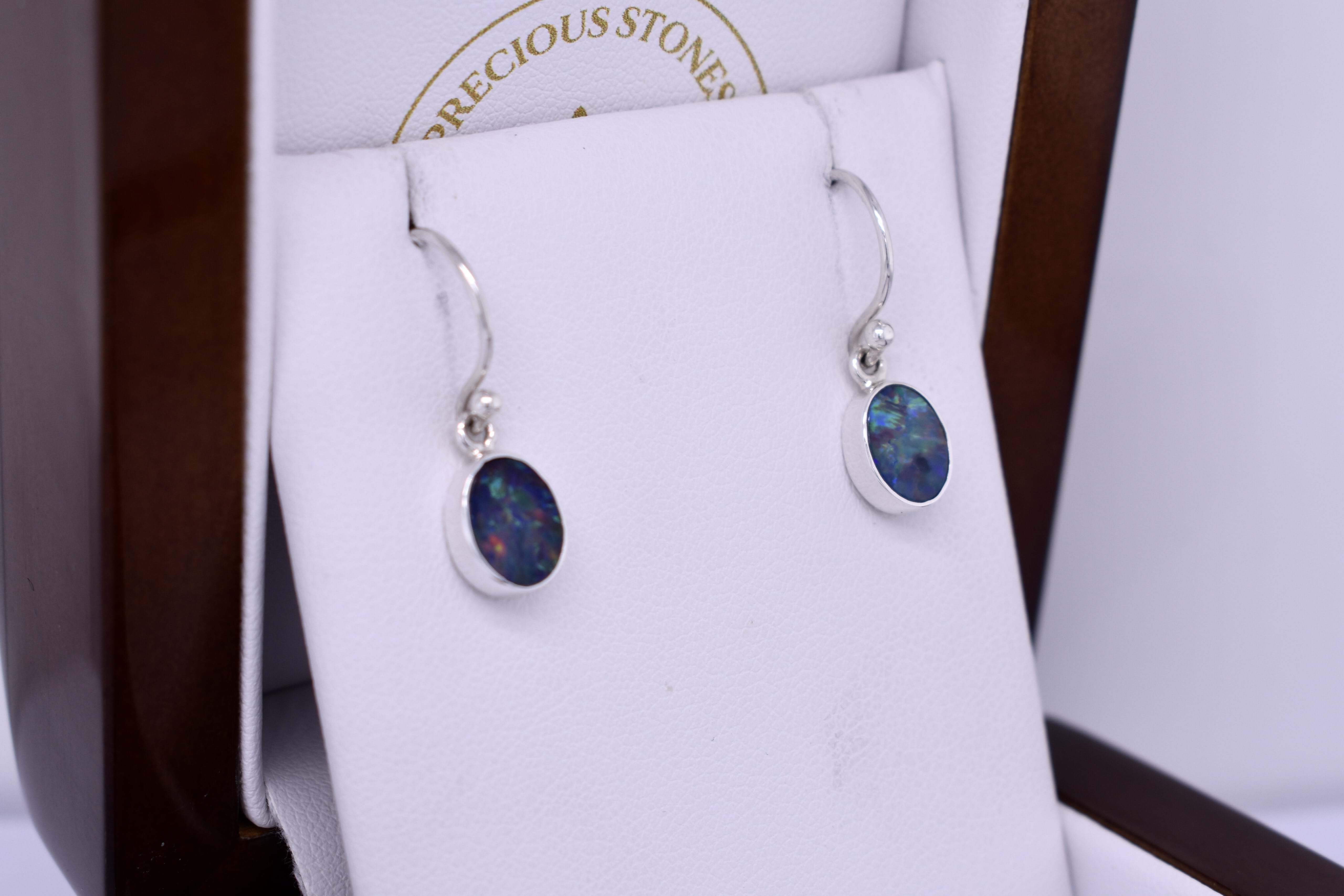This classic and colourful pair of handmade oval drops, featuring approx. 8.8x7.0mm Coober Pedy opal doublets. The doublet consisting of Coober Pedy opal (on top) with a boulder opal backing. These opals are blue with pretty flashes of green and orange throughout. They are bezel set in sterling silver with shepherd hook fittings.