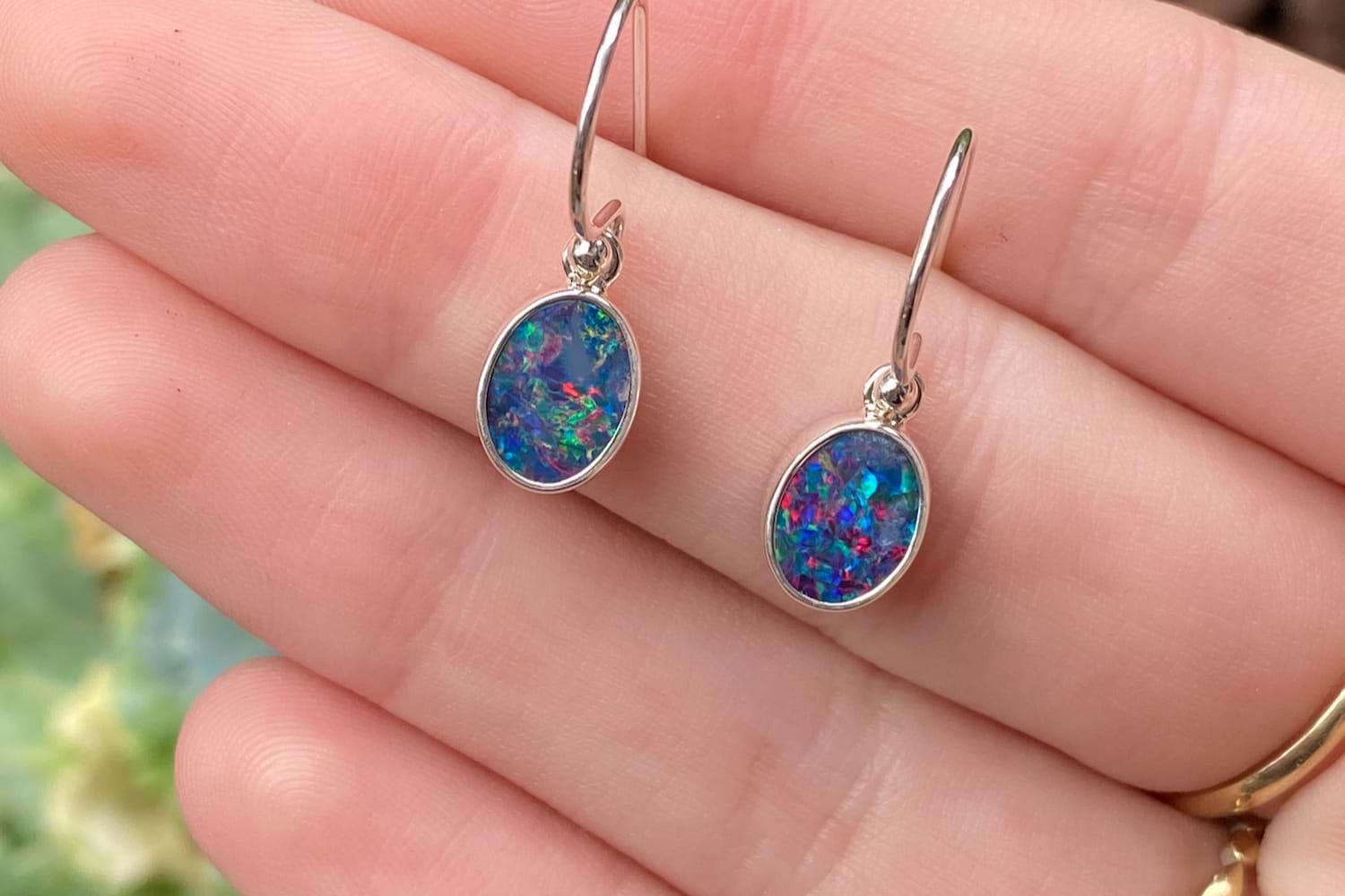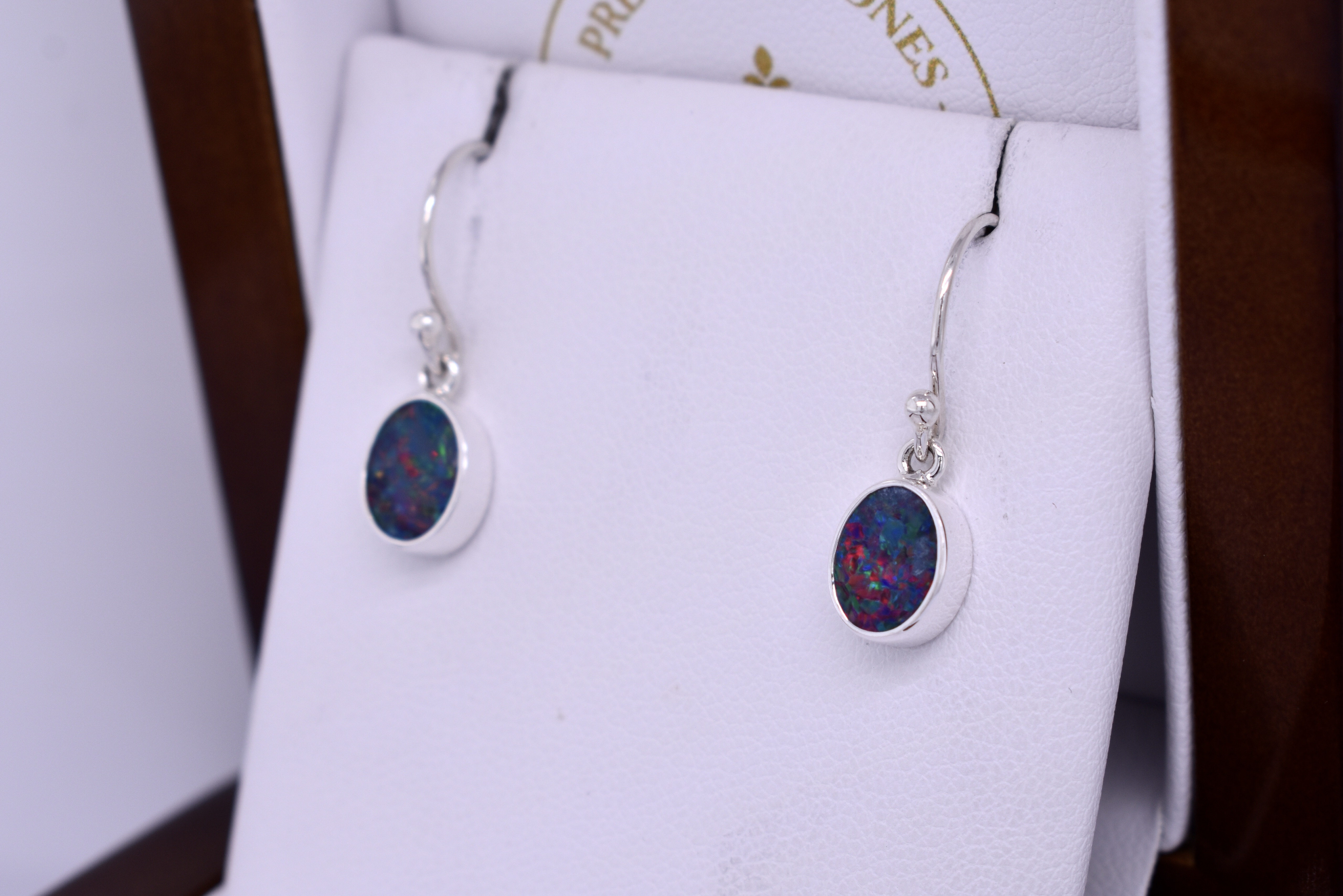 This beautiful pair of handmade oval drops, featuring approx. 8.9x7.2mm Coober Pedy opal doublets. The doublet consisting of Coober Pedy opal (on top) with a boulder opal backing. These opals are blue with pretty flashes of red and green throughout. They are bezel set in sterling silver with shepherd hook fittings.