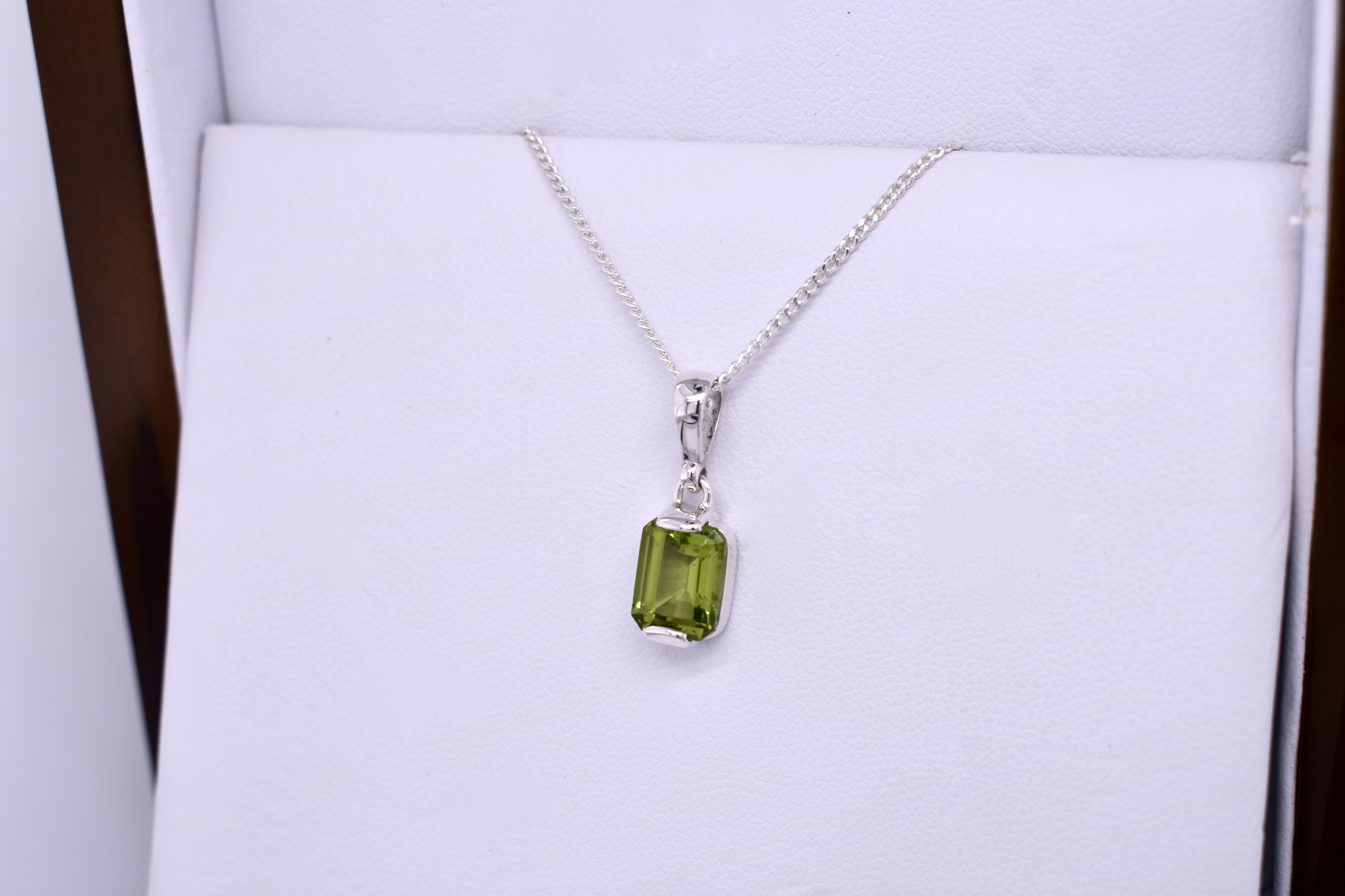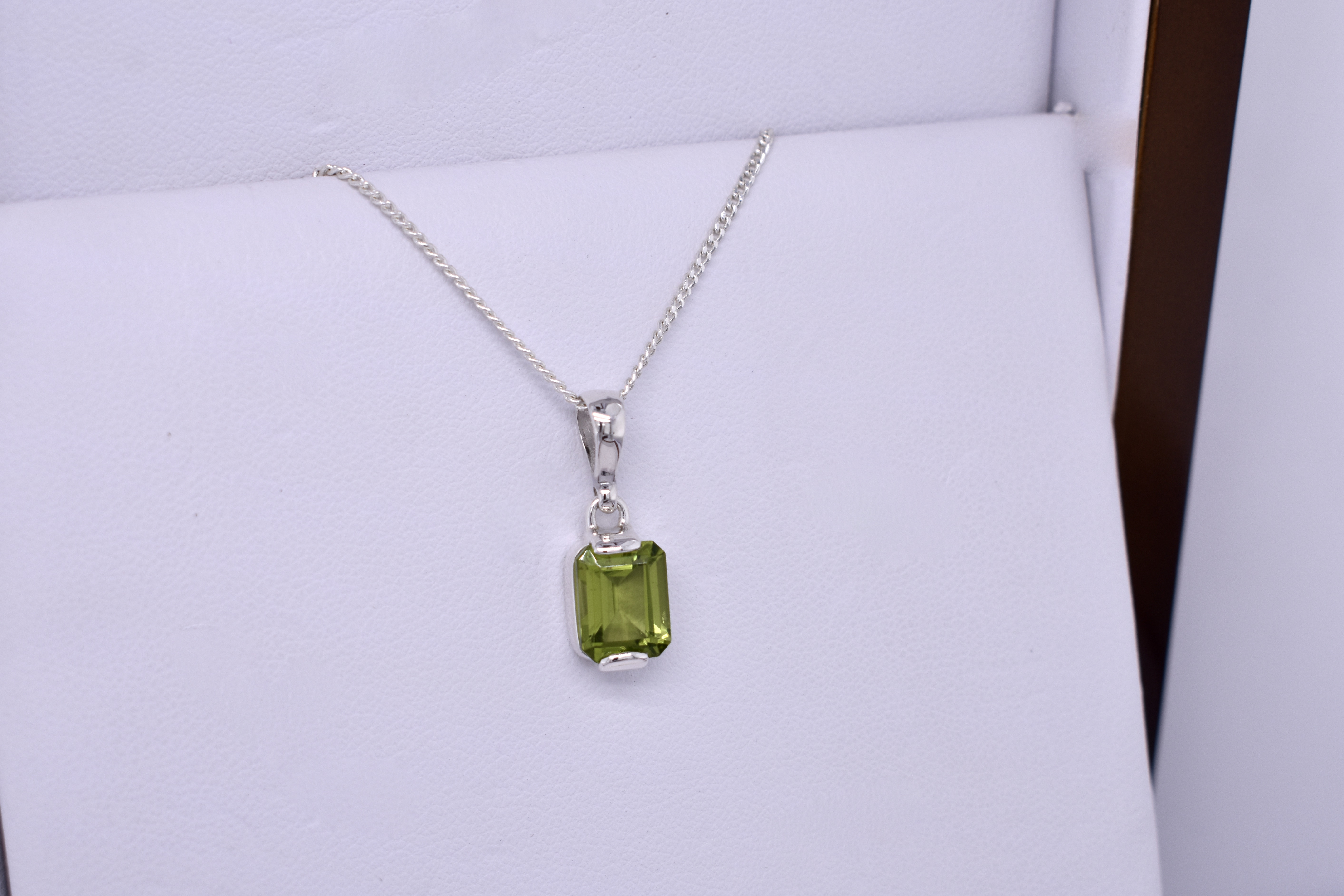 The pretty emerald cut shaped peridot pendant, semi bezel set in sterling silver with a plain bale. Pendant measures 10.8x7.5mm. Chains available for separate purchase.
