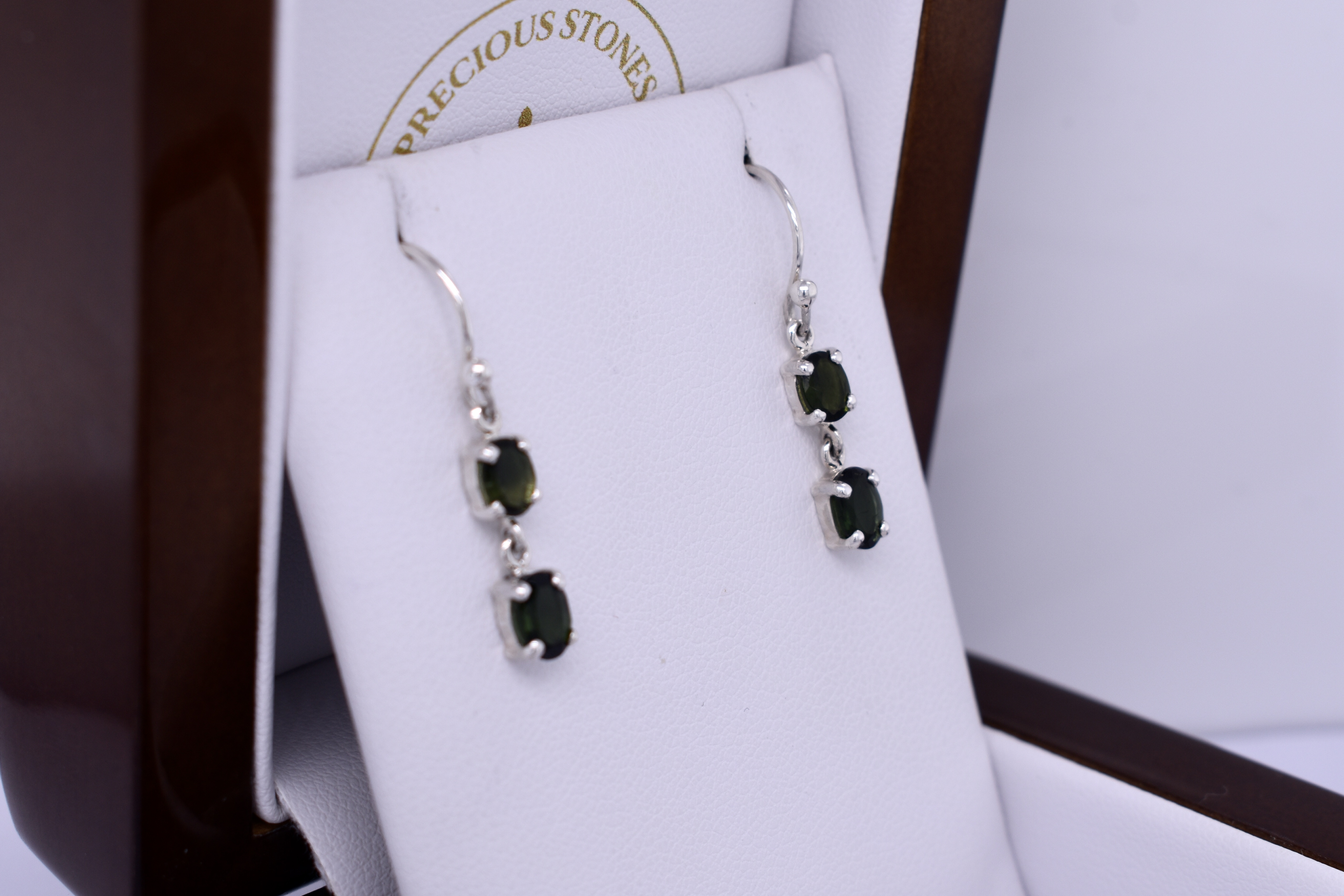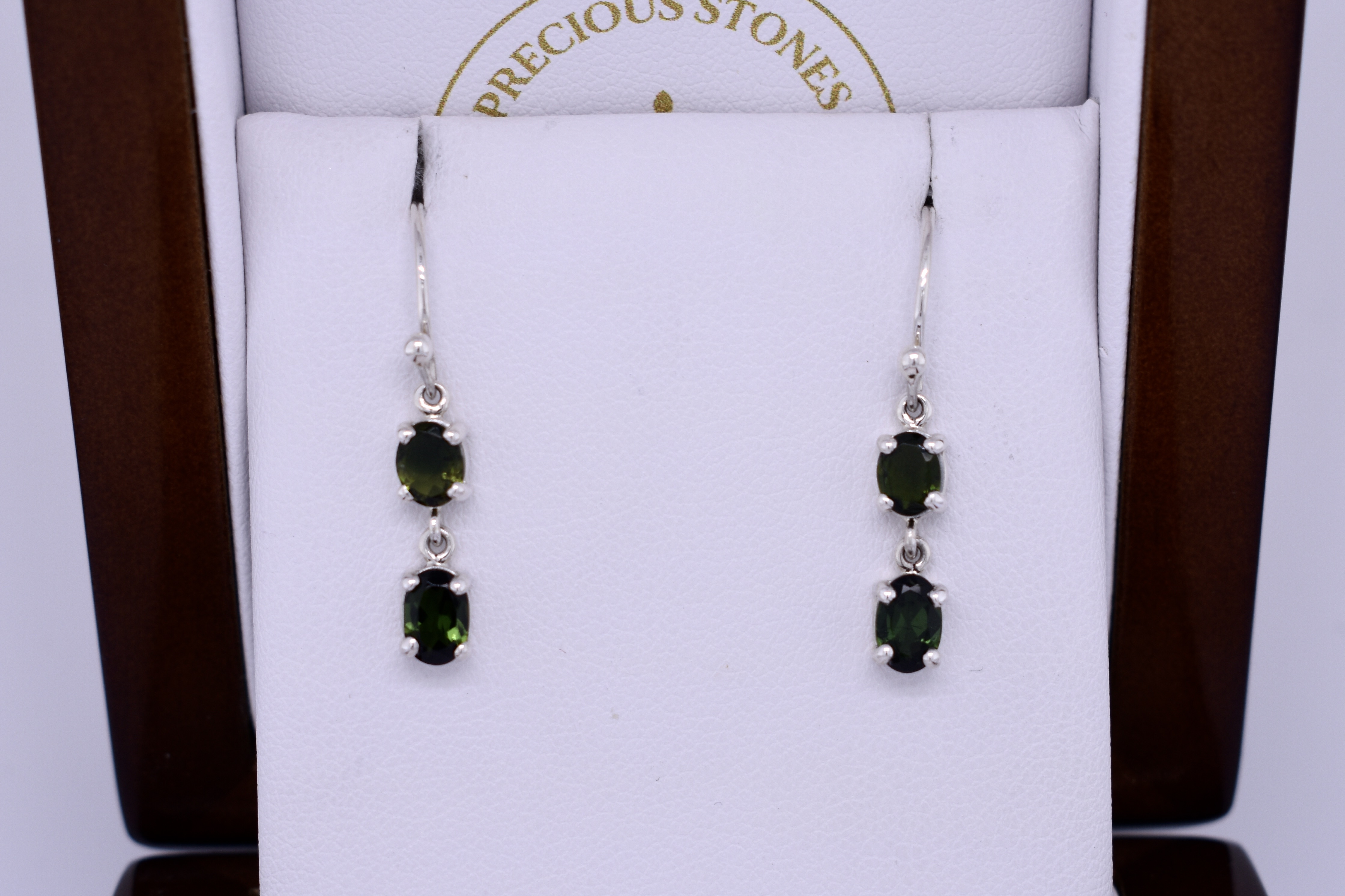 This pair of gorgeous sterling silver double drops featuring two 6x4mm oval green tourmalines suspended from 5x4mm stones, four claw set in a handmade hanging drops with shepherd hook fittings.