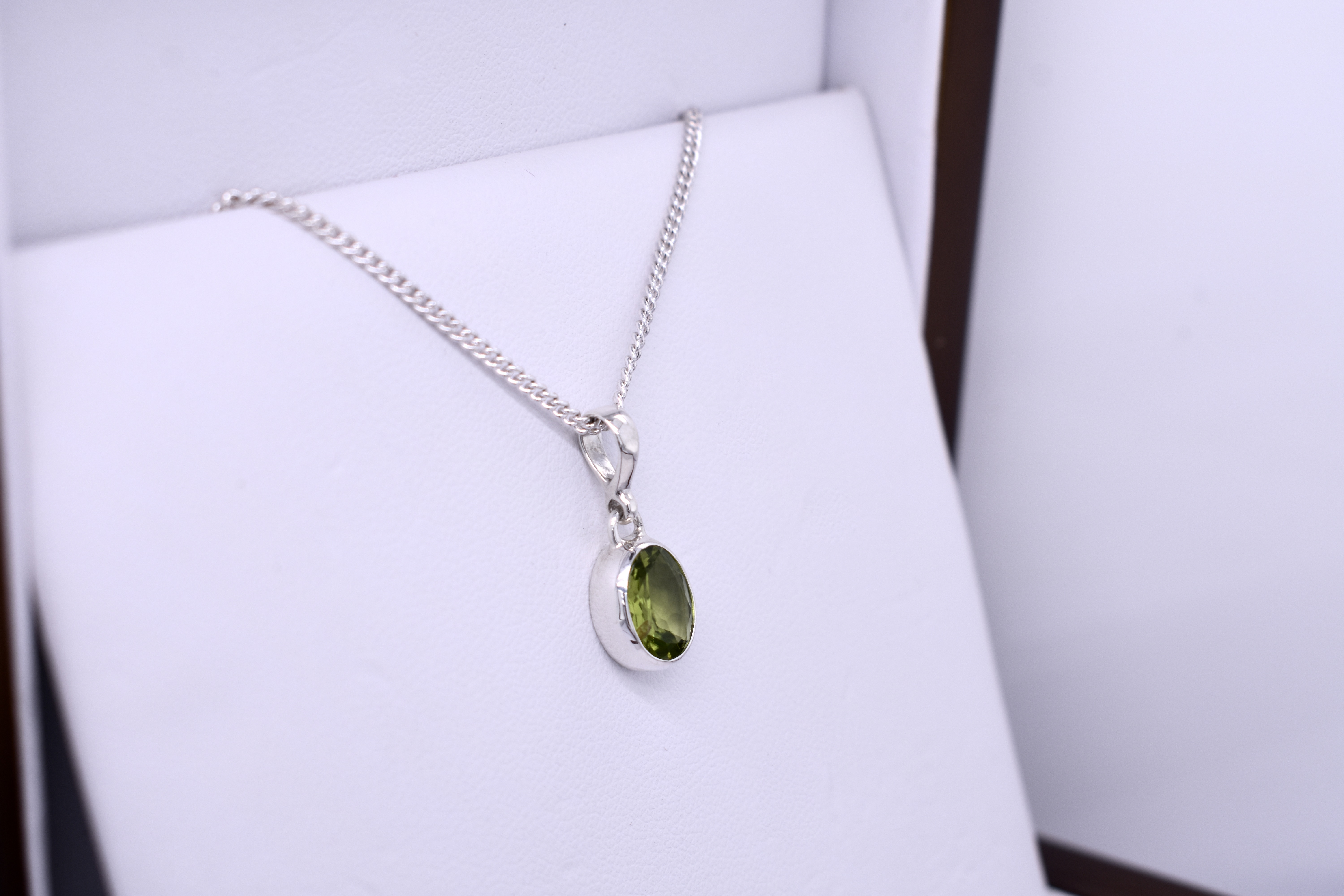 Lovely oval shaped peridot pendant, bezel set in sterling silver. Pendant measures 10.5x8.5mm and is finished with a plain pendant bale. Chains available for separate purchase.