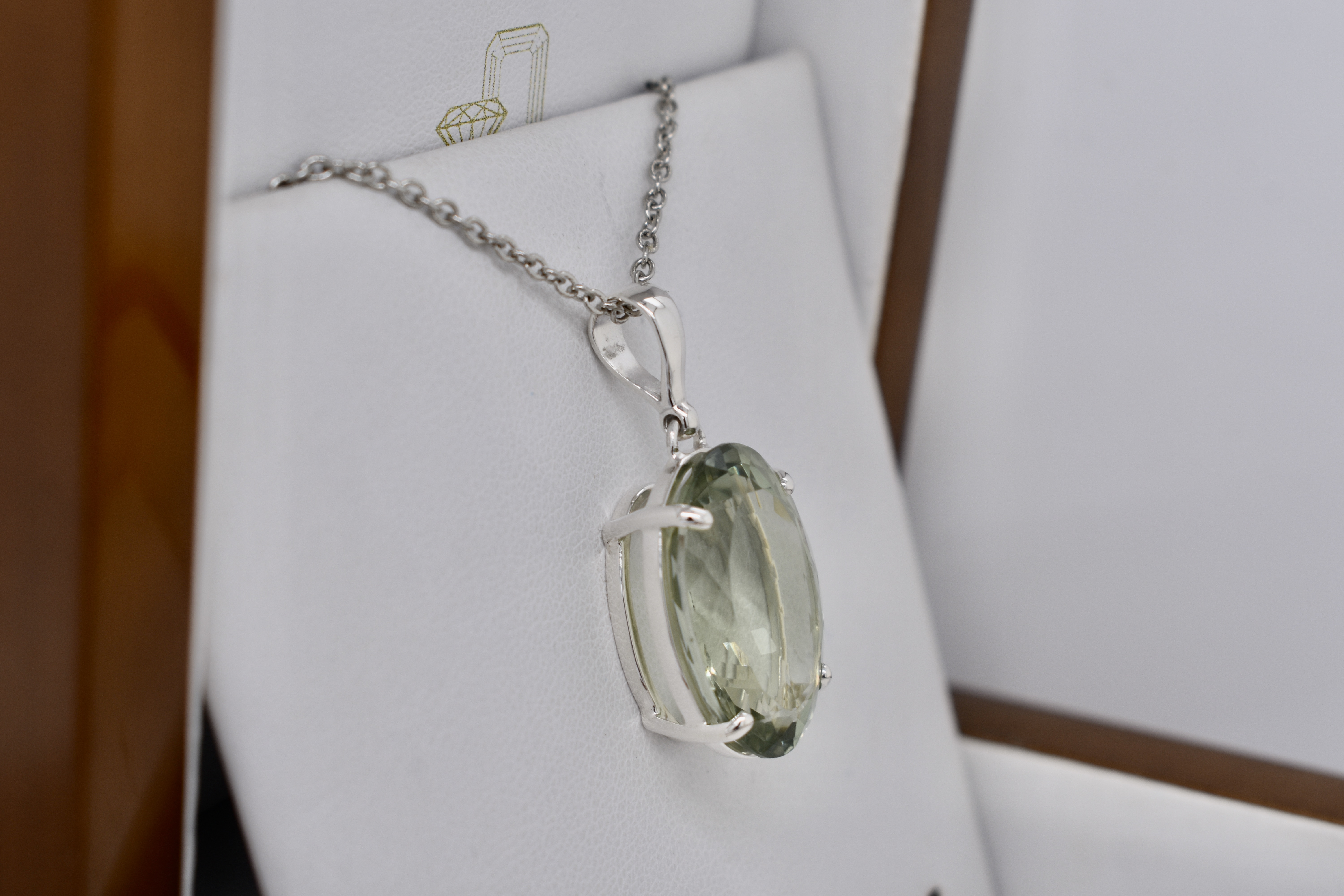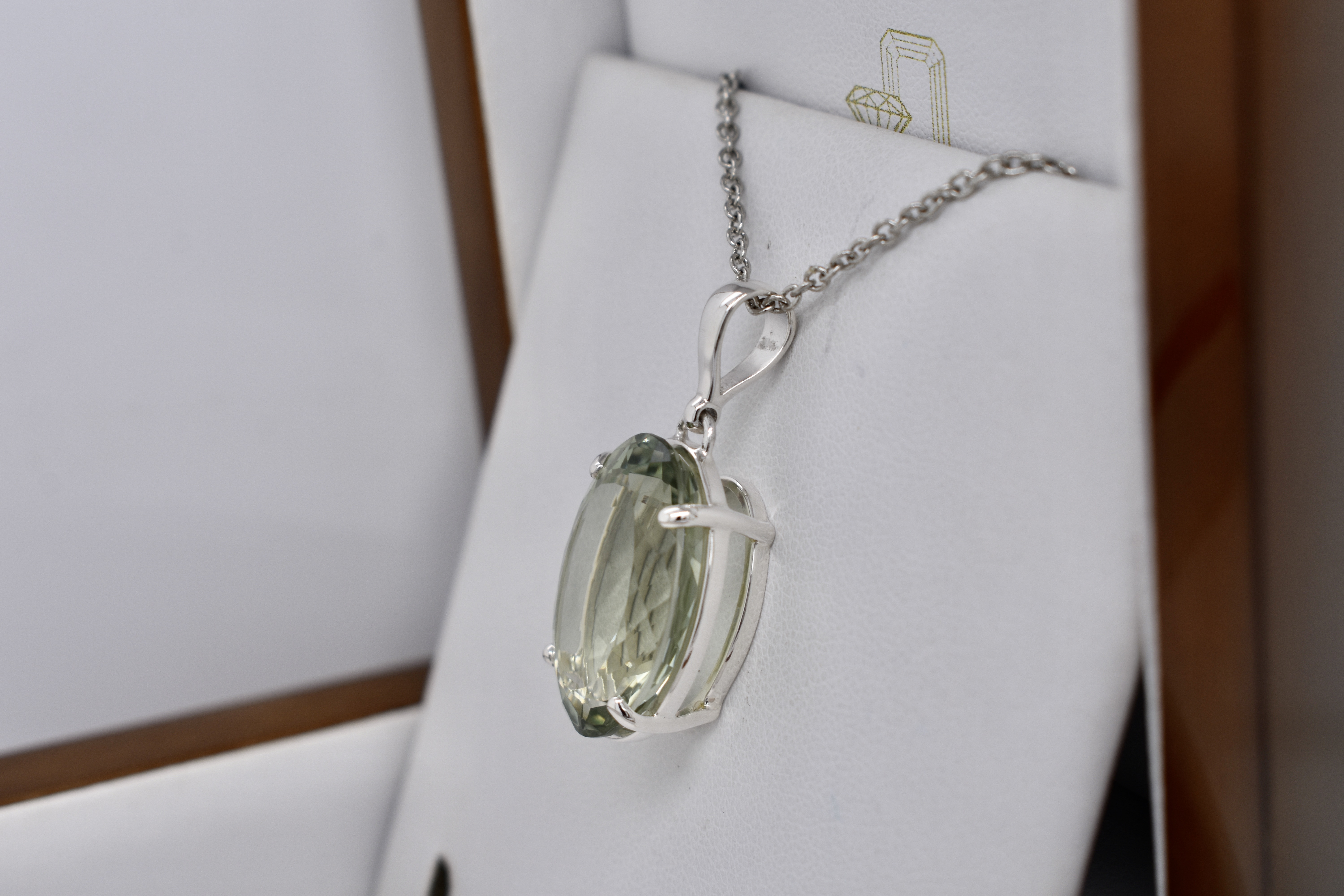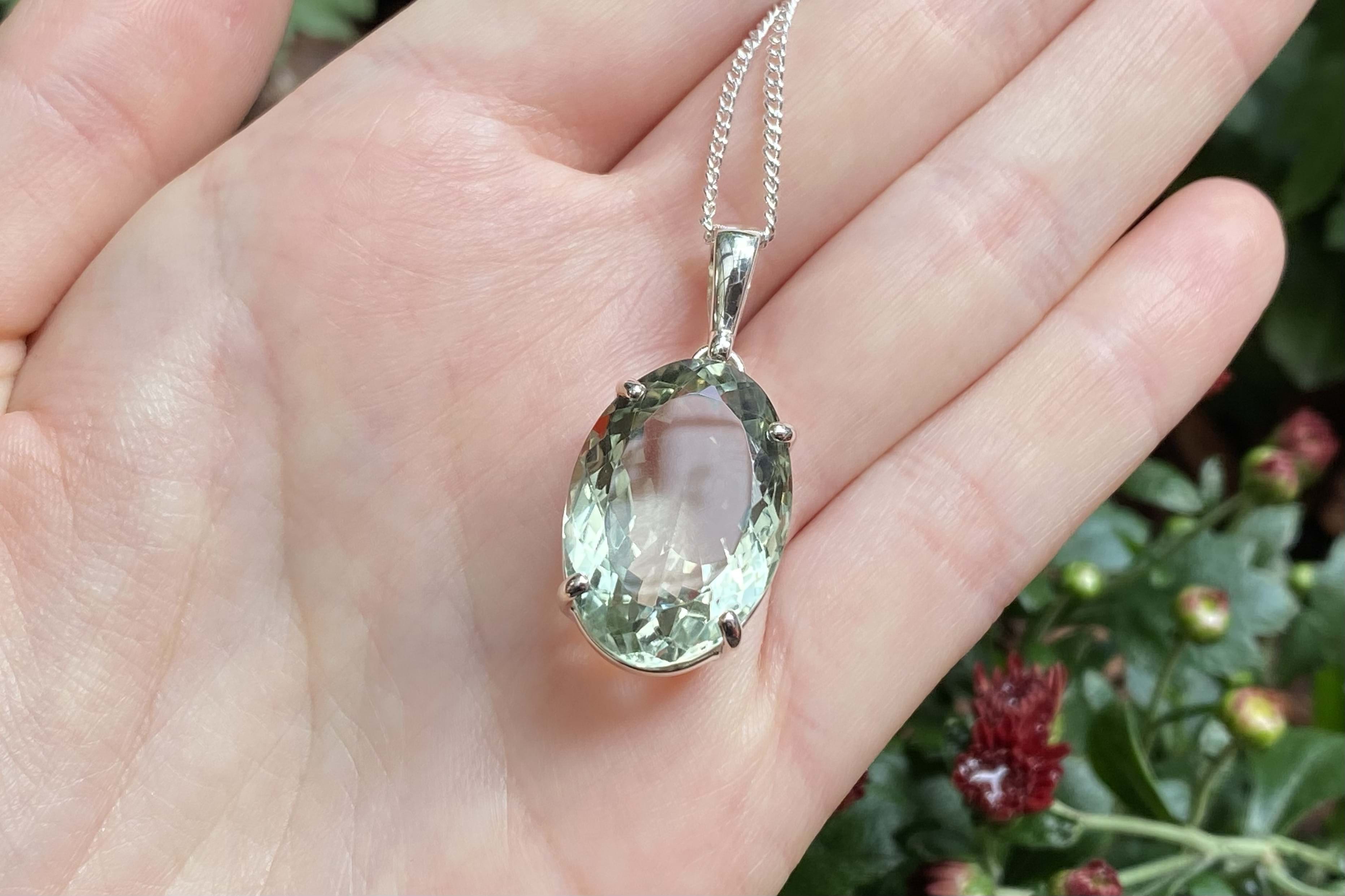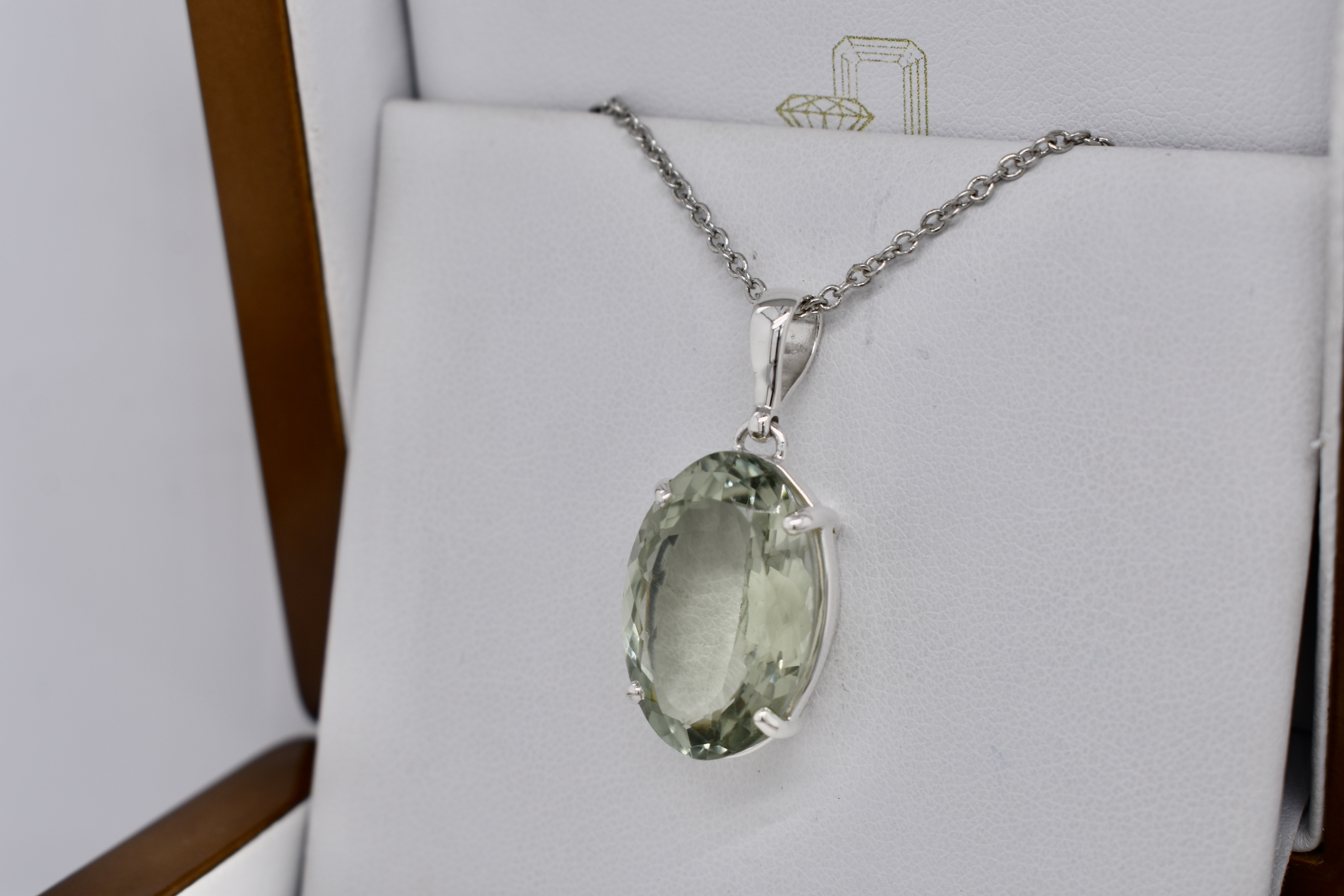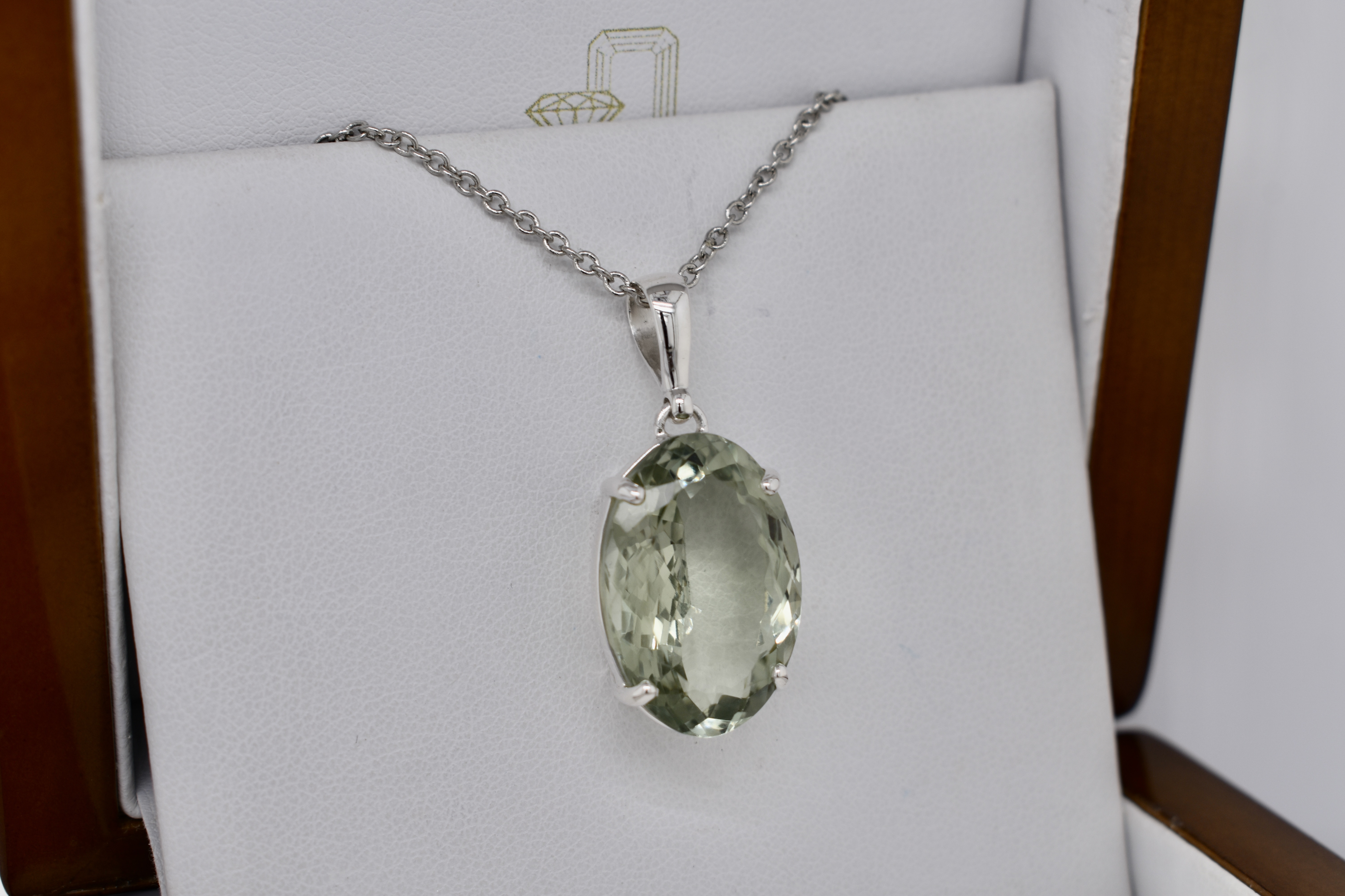 Timeless handmade sterling silver pendant featuring an oval 22.5x15.3mm prasiolite, four claw set, with a plain pendant bale. Chains are available for separate purchase