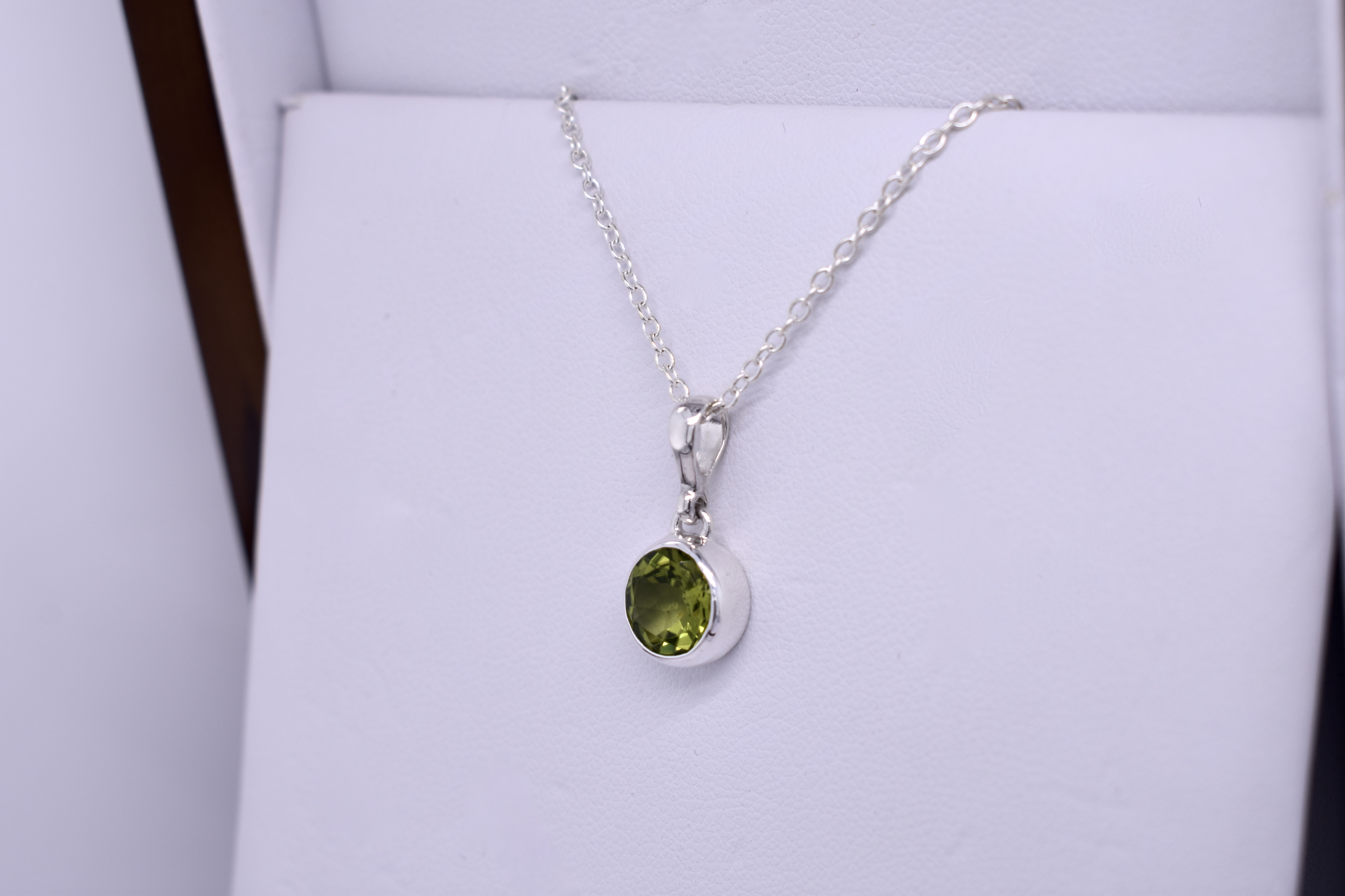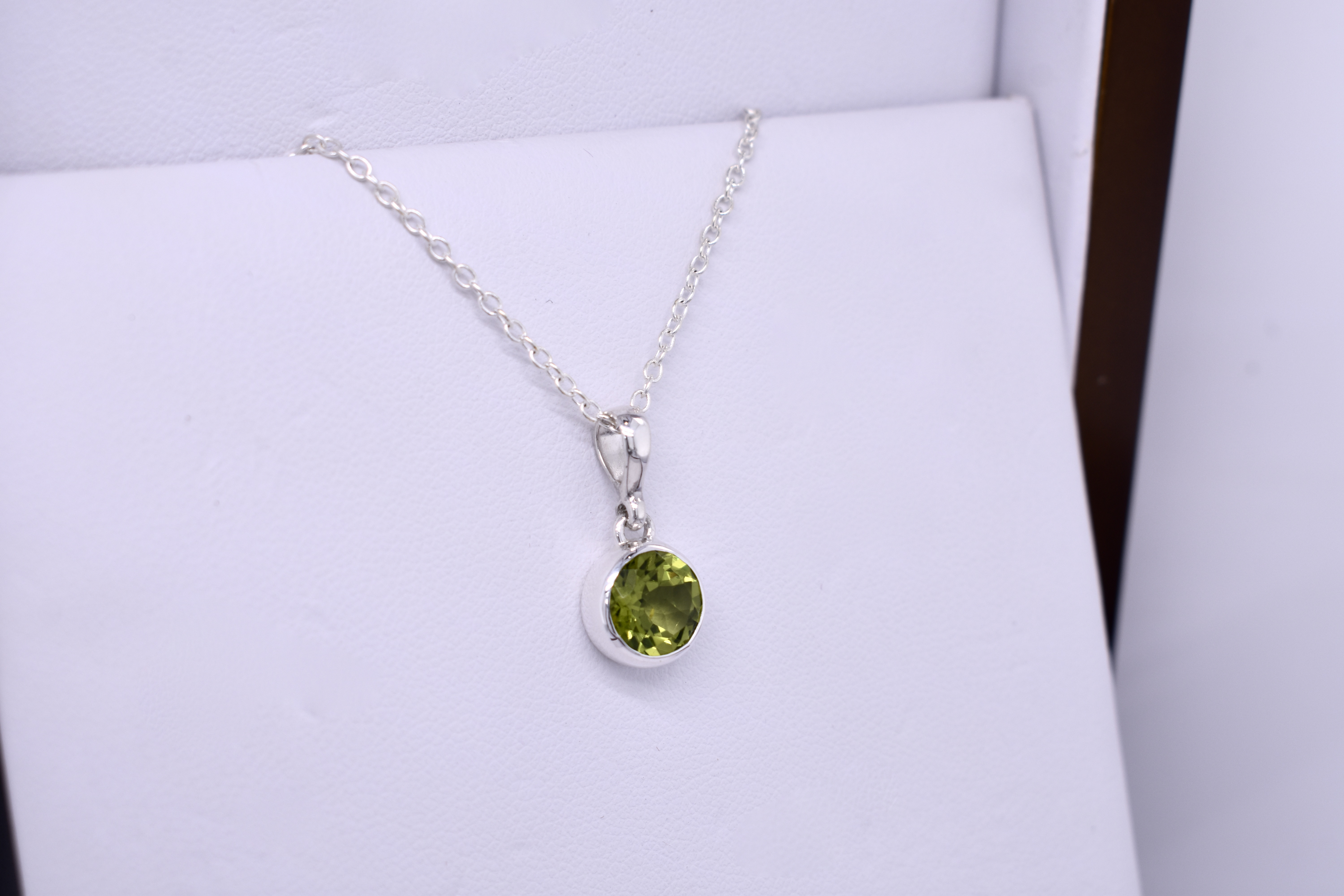 The cutest round shaped peridot pendant, bezel set in sterling silver with a plain bale. Pendant measures 9.8x9.8mm. Chains available for separate purchase.