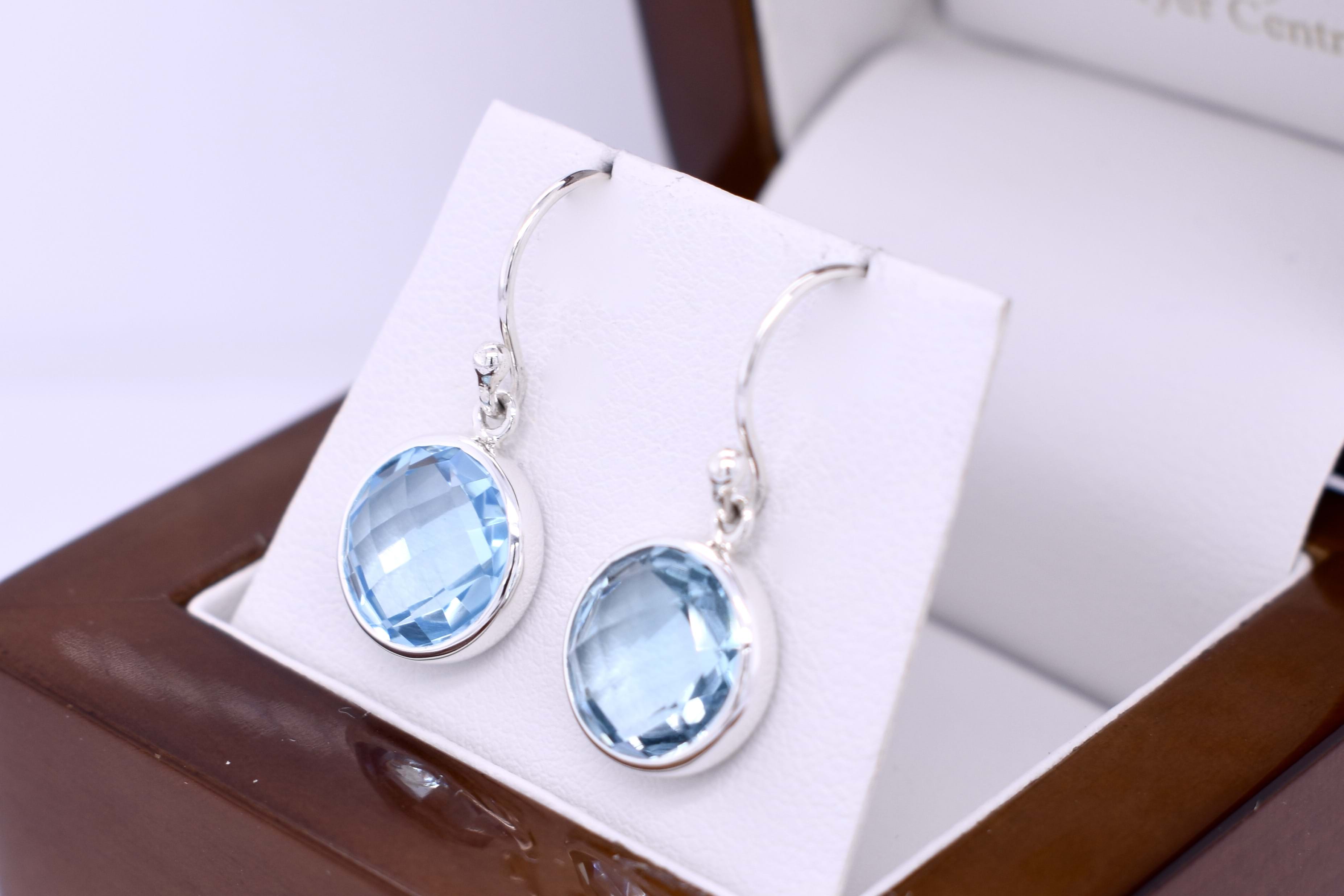 Crafted in sterling silver, these lovely blue drops feature two round sky blue topaz with checkerboard faceting, measuring 10mm, bezel set and suspended from shepherd hook fittings.