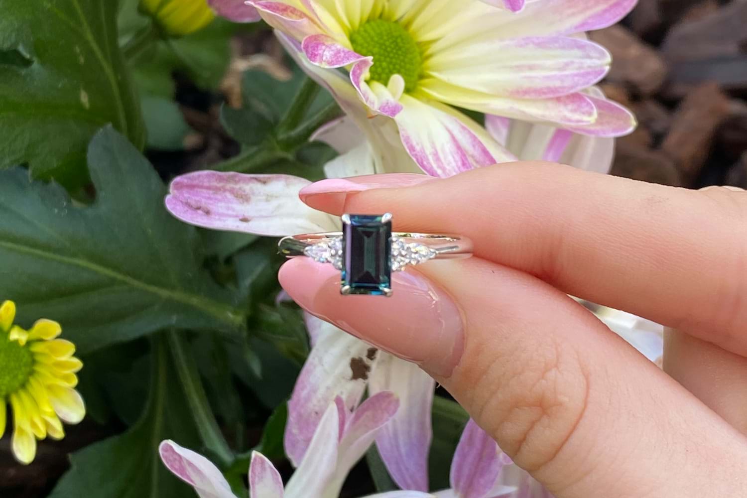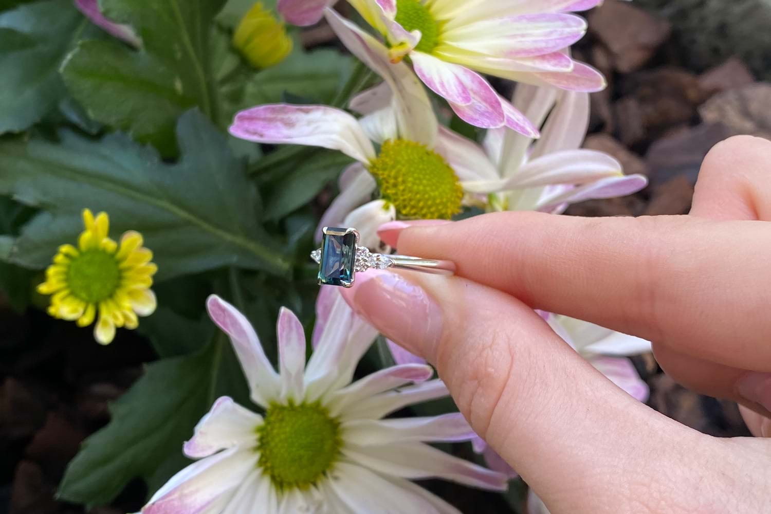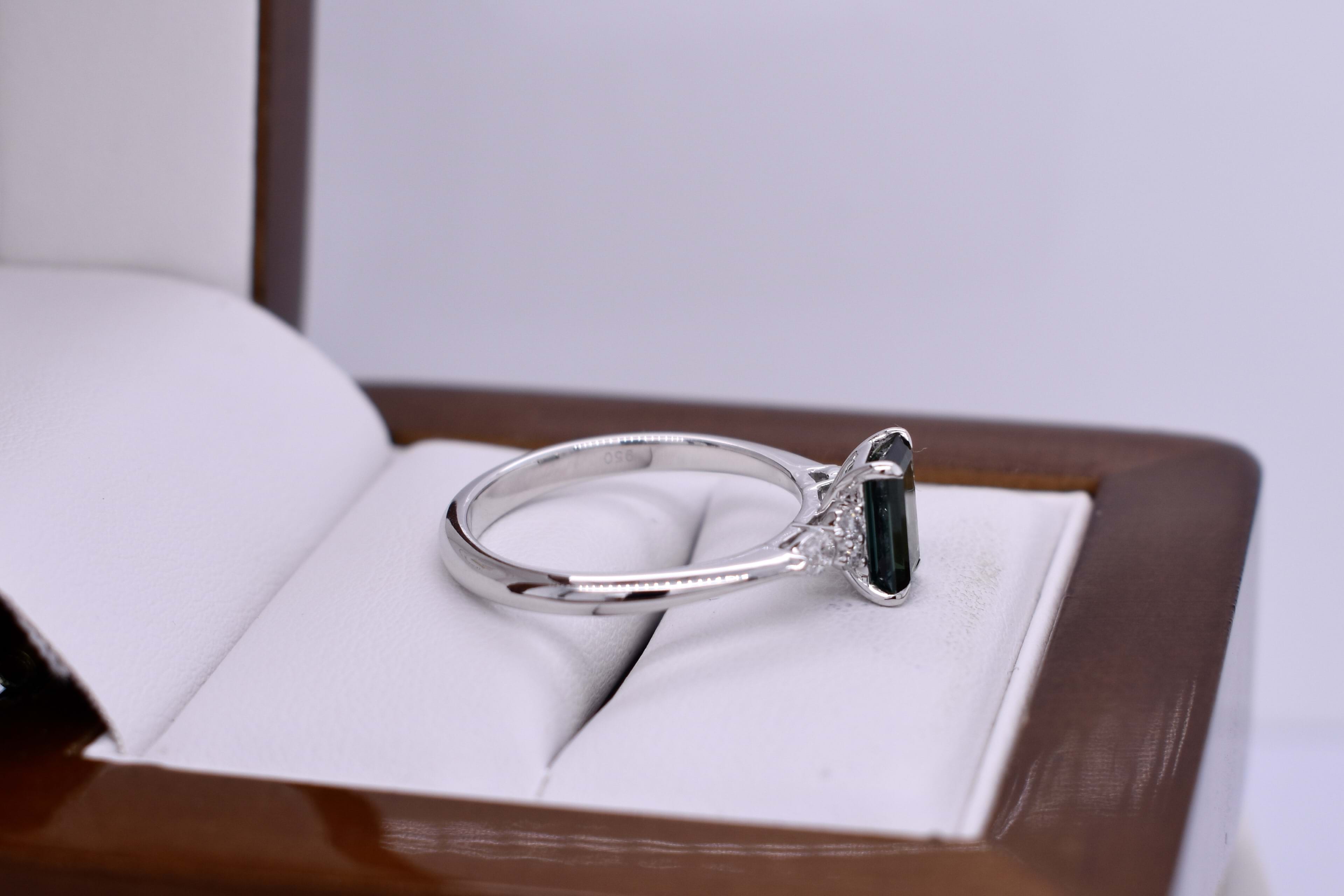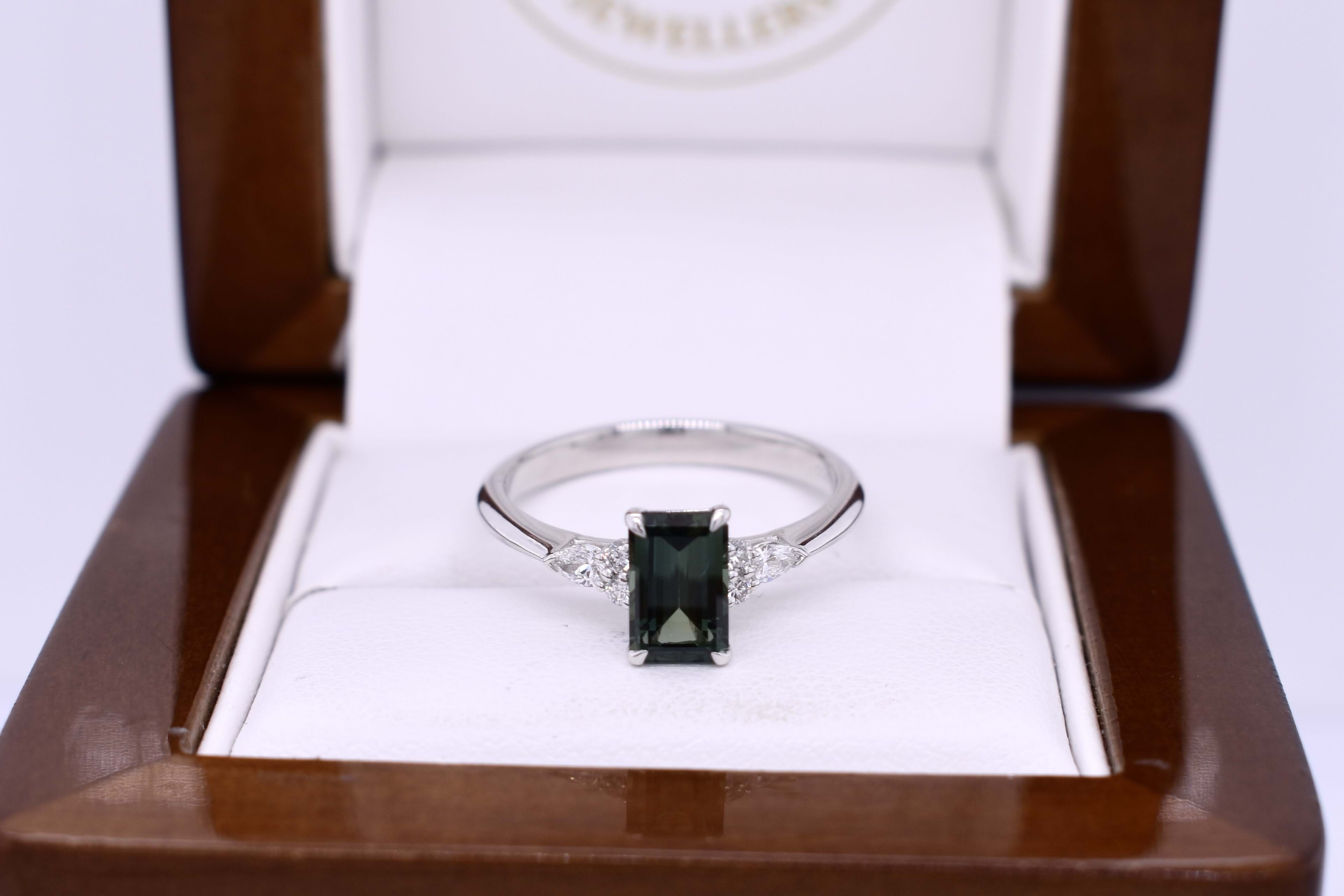 Captivating platinum ring, featuring a centre emerald cut mid blue green Australian sapphire of 1.29ct, measuring 7.60x4.75x3.20mm, four claw set, paired with two round brilliant cut and one pear shaped diamond either side. Total off six diamonds equalling 0.17ct FG VS-SI, four round 1.60mm totalling 0.08ct and 2 pears totalling 0.09ct. Finished on a half round 2.57mm tapered band. Finger size M. Independent Valuation Supplied.