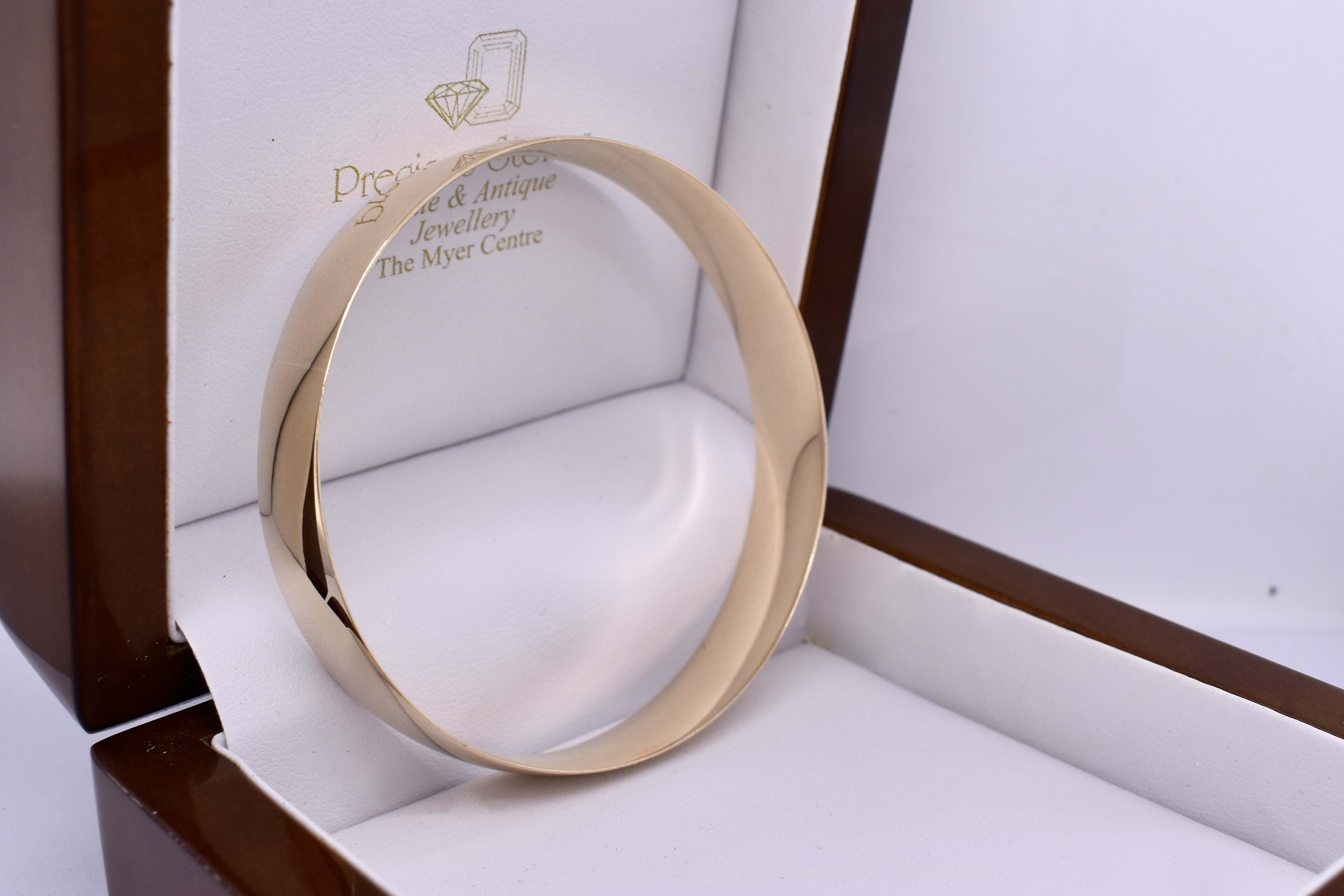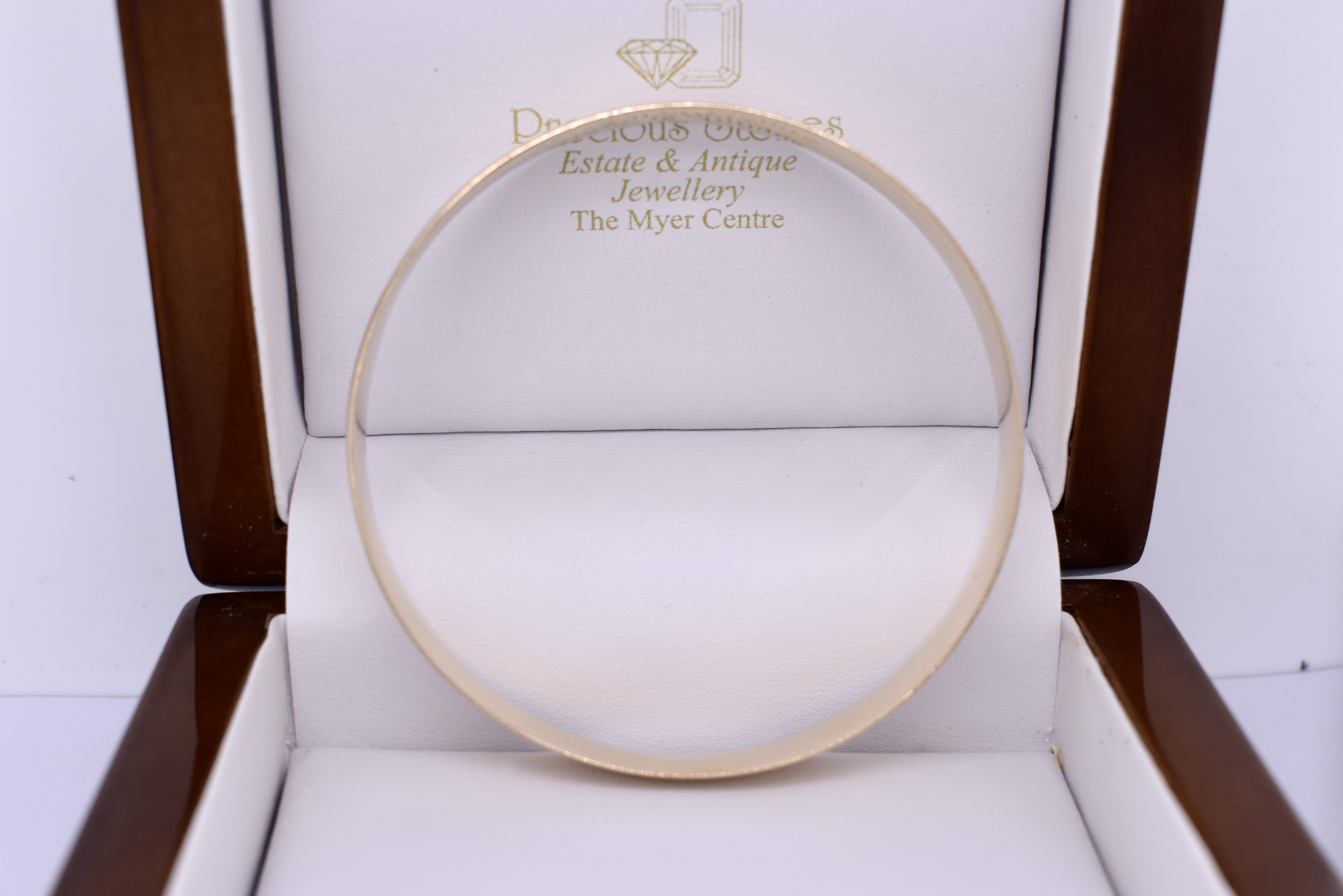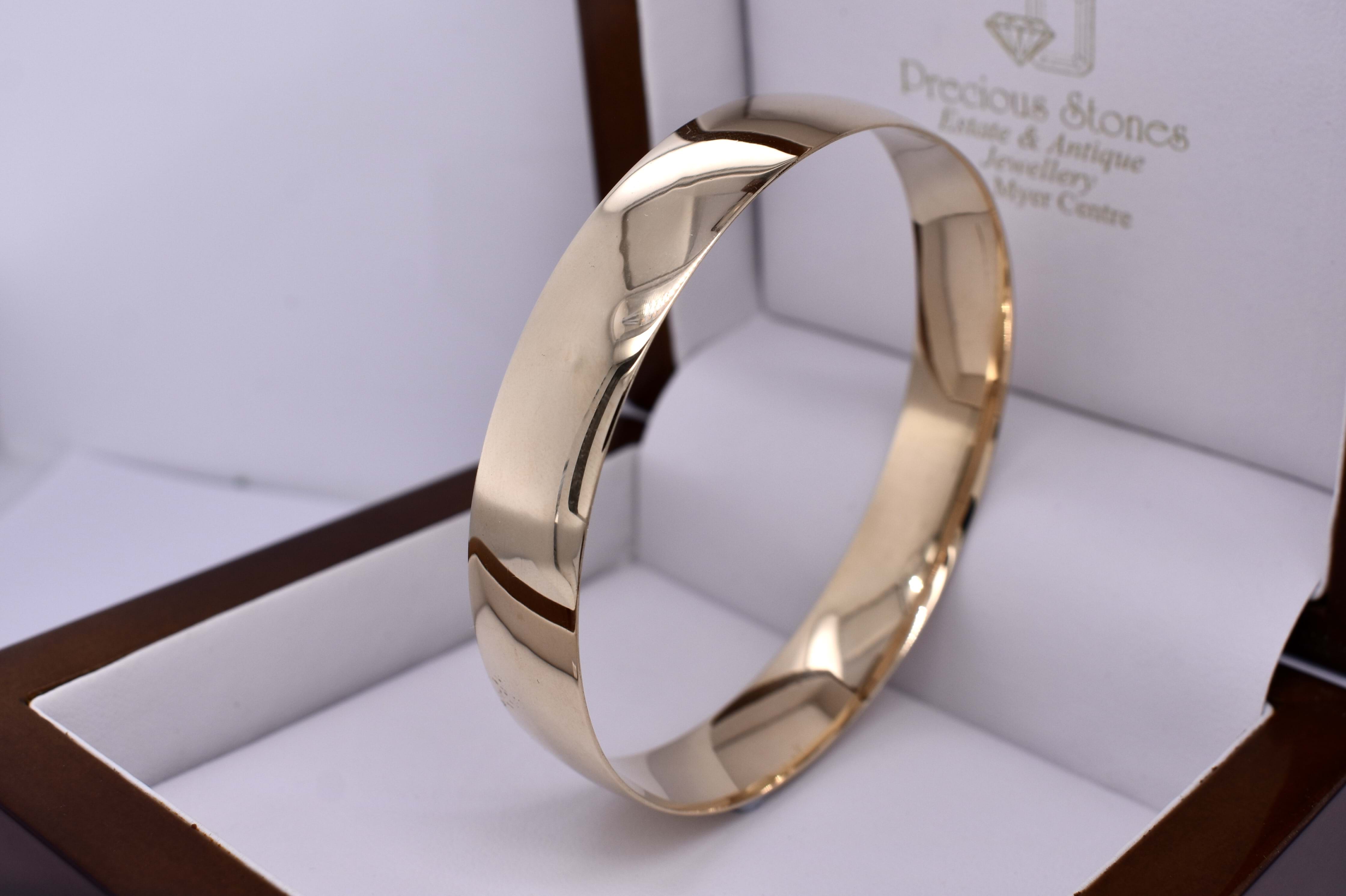 A pretty and timeless jewellery collection staple, this secondhand solid round bangle has been crafted in 9ct yellow gold, with a flat comfort profile and a depth of 17mm. Bangle measures 65mm hand size and 11.7mm wide with a weight of 33.62 grams.