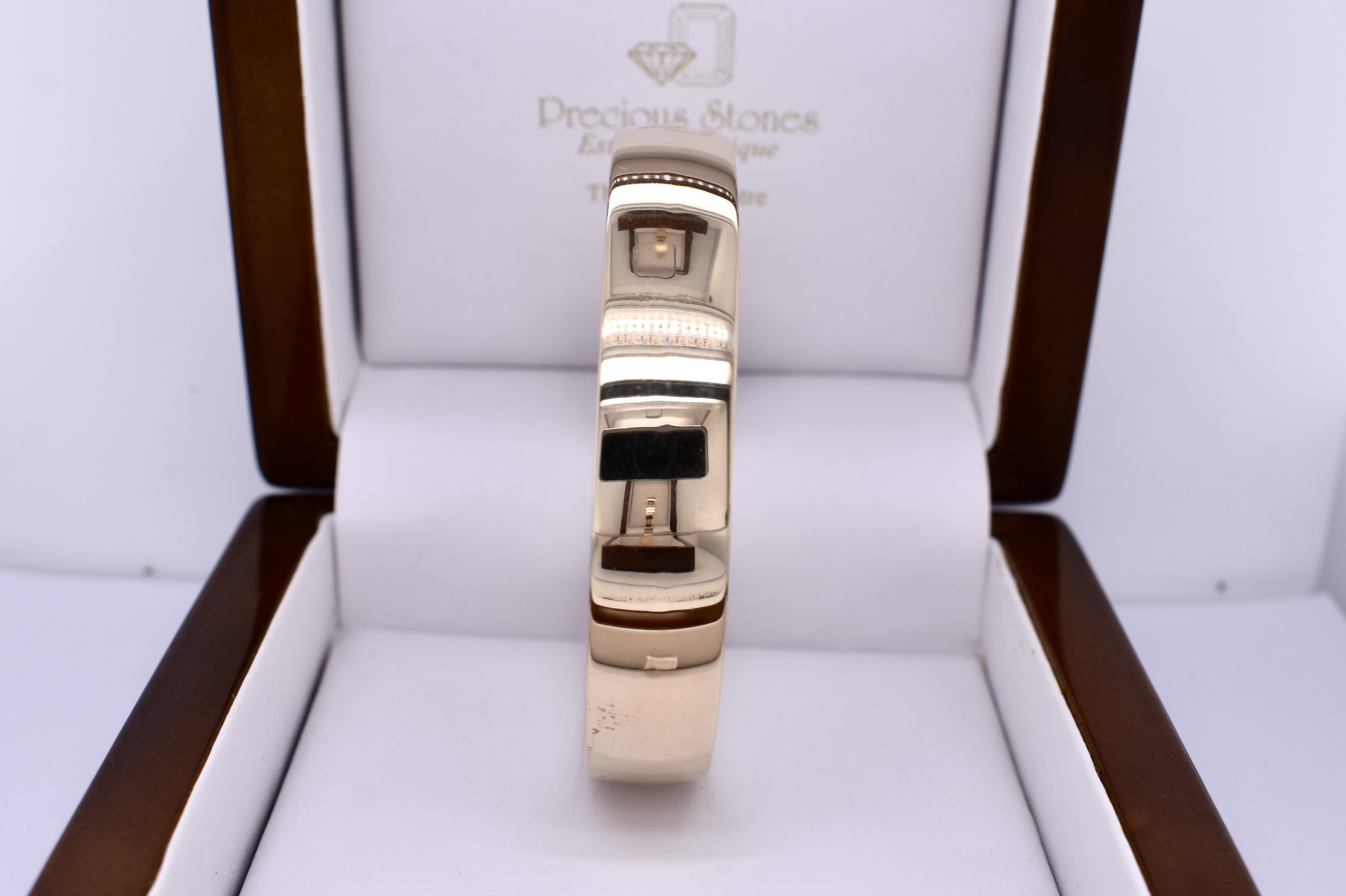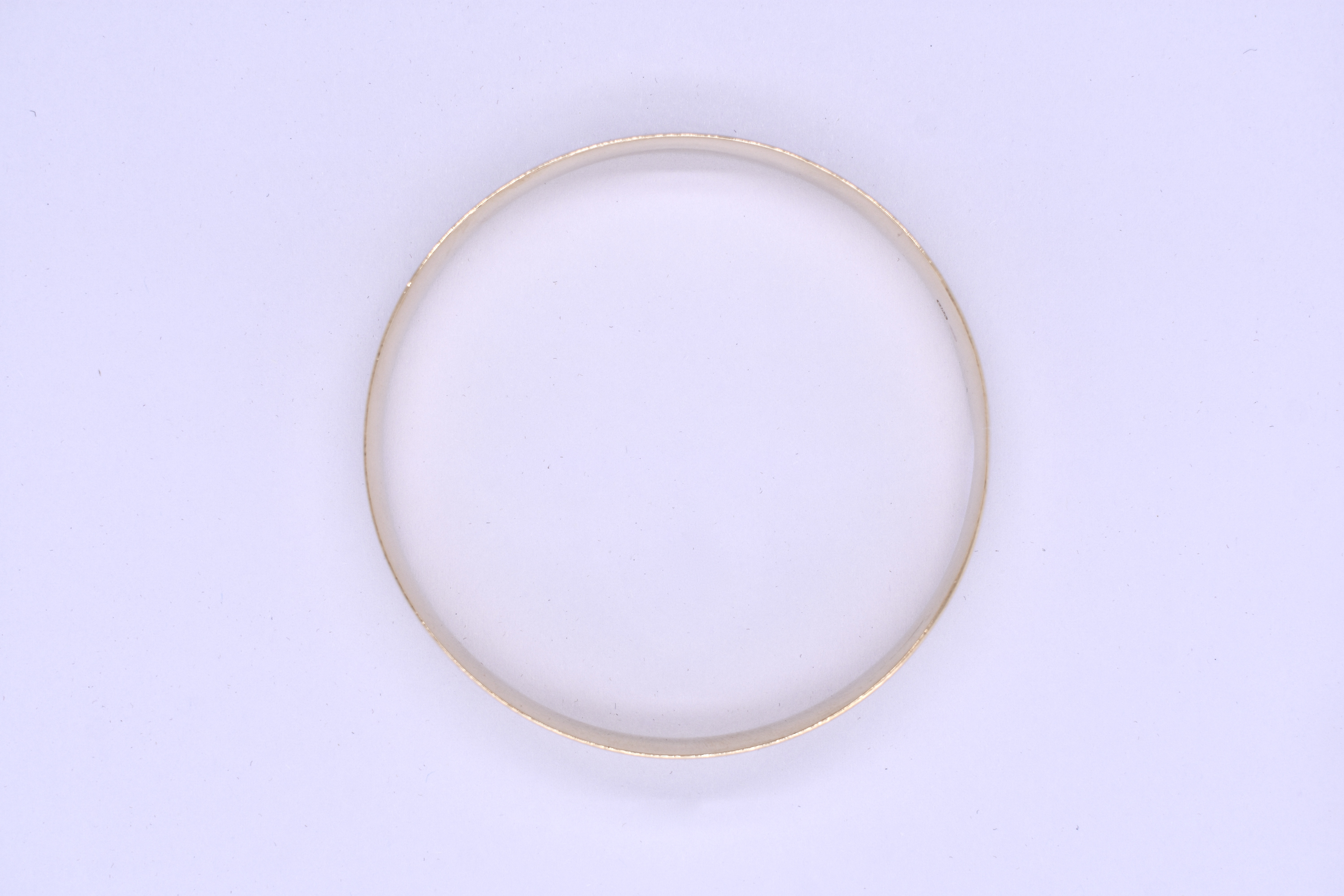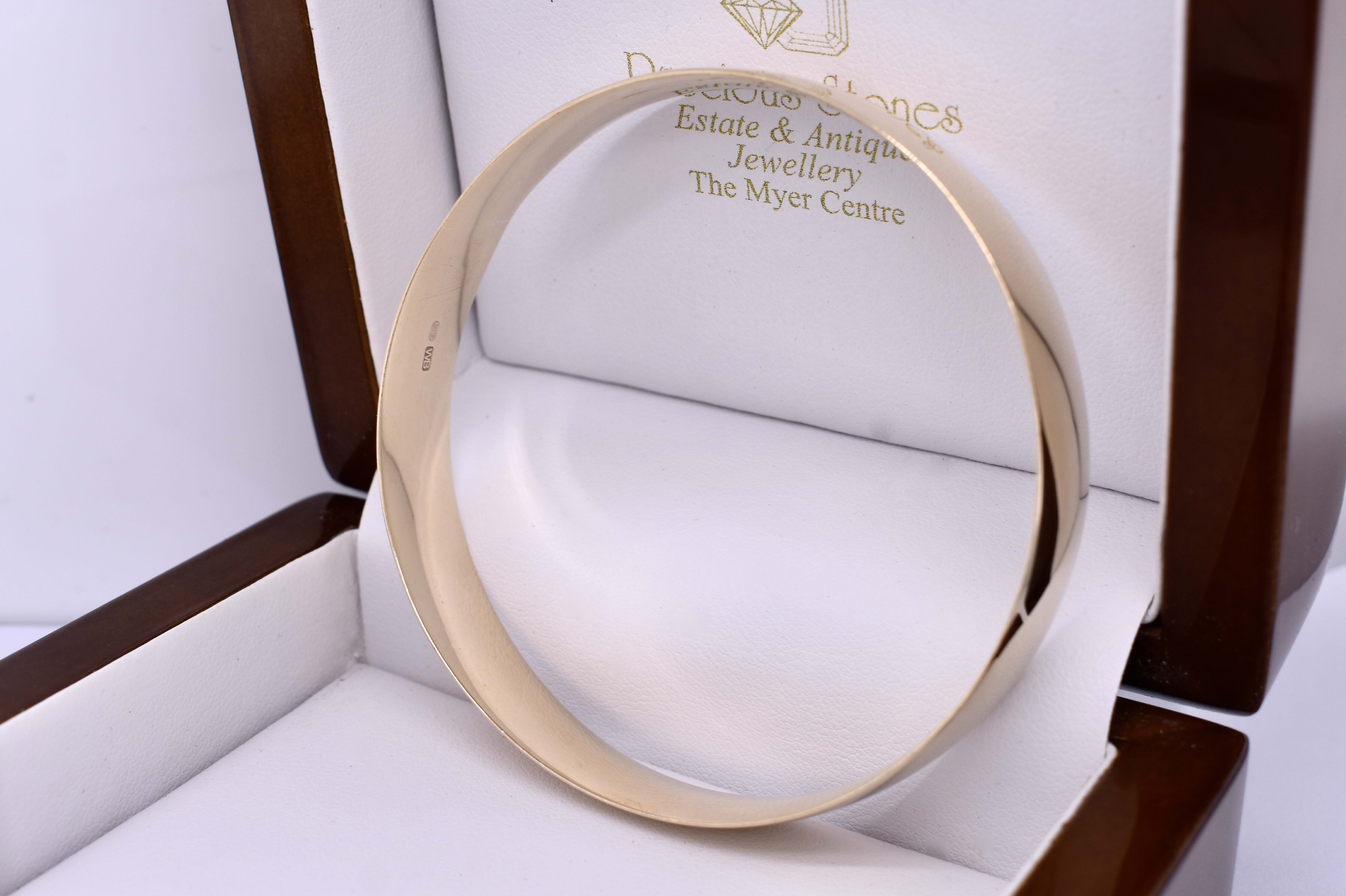 A pretty and timeless jewellery collection staple, this secondhand solid round bangle has been crafted in 9ct yellow gold, with a flat comfort profile and a depth of 17mm. Bangle measures 65mm hand size and 11.7mm wide with a weight of 33.62 grams.