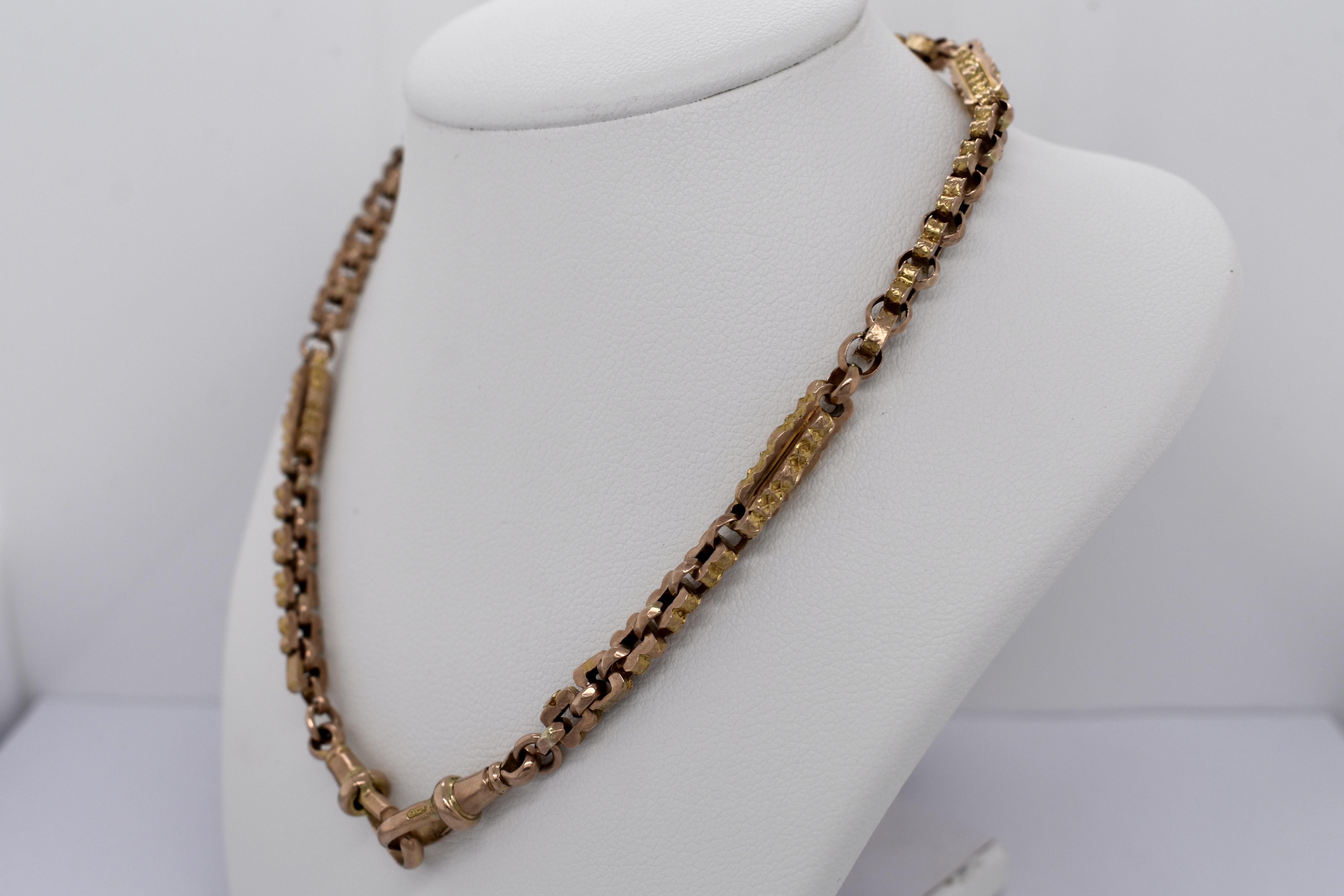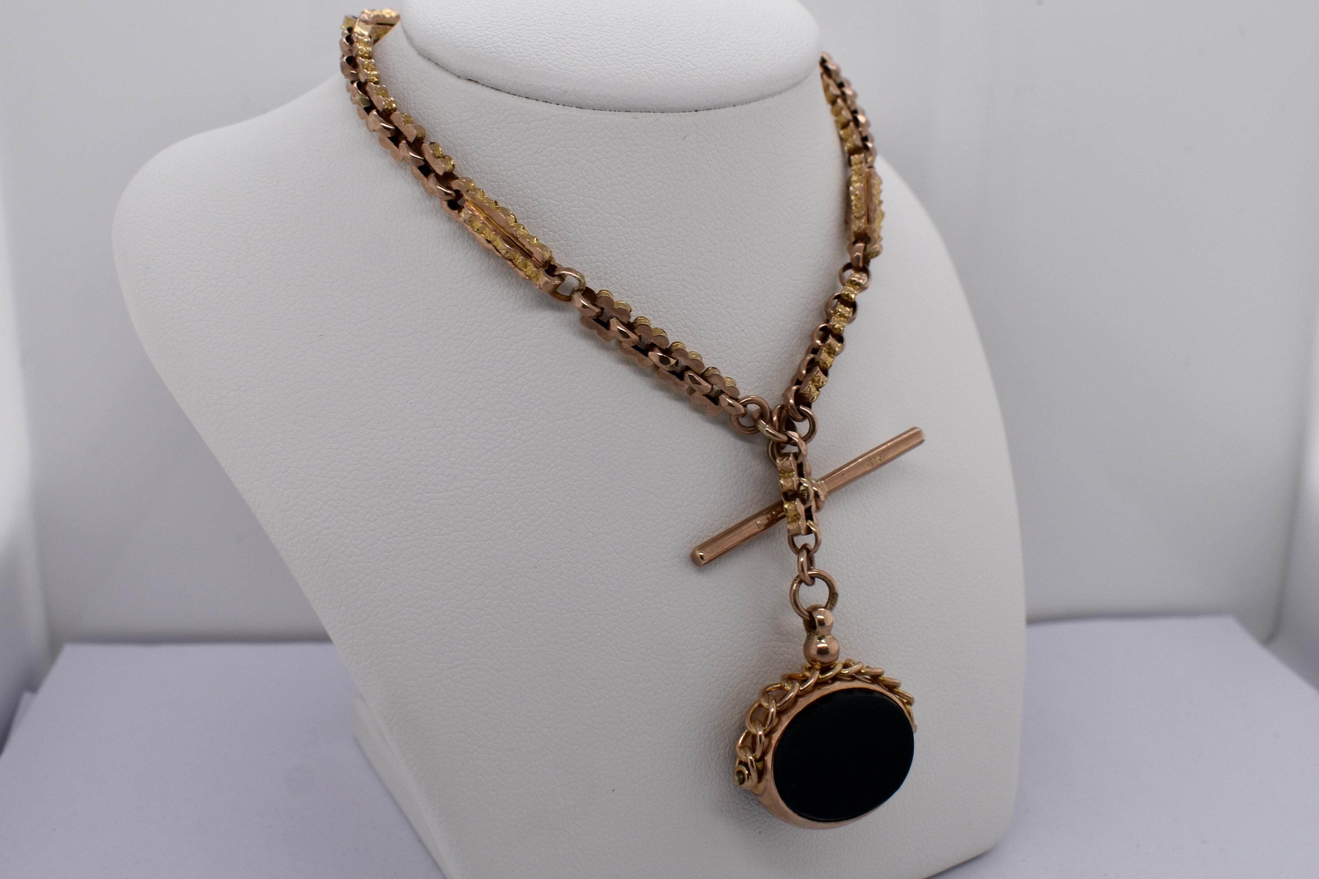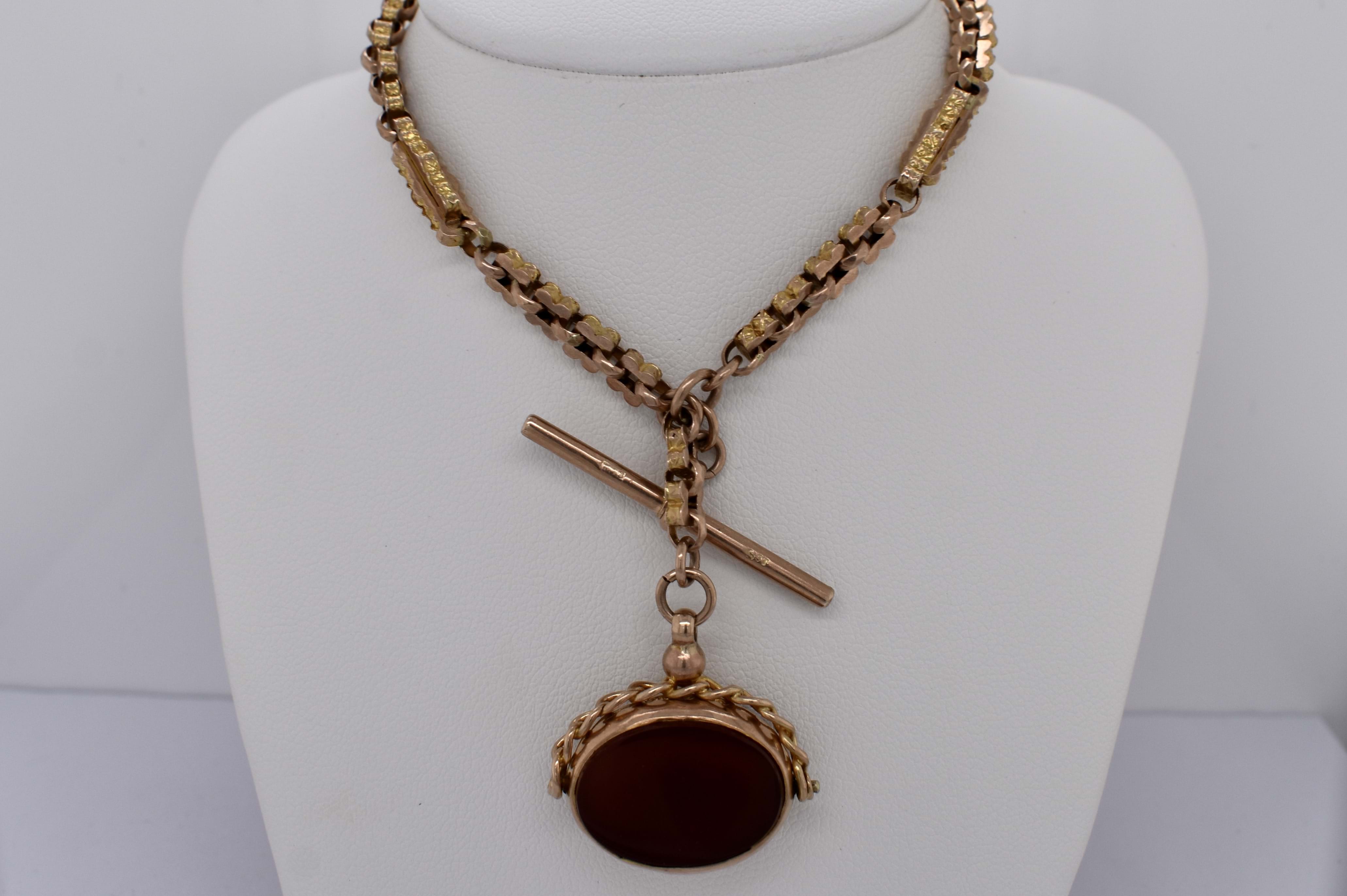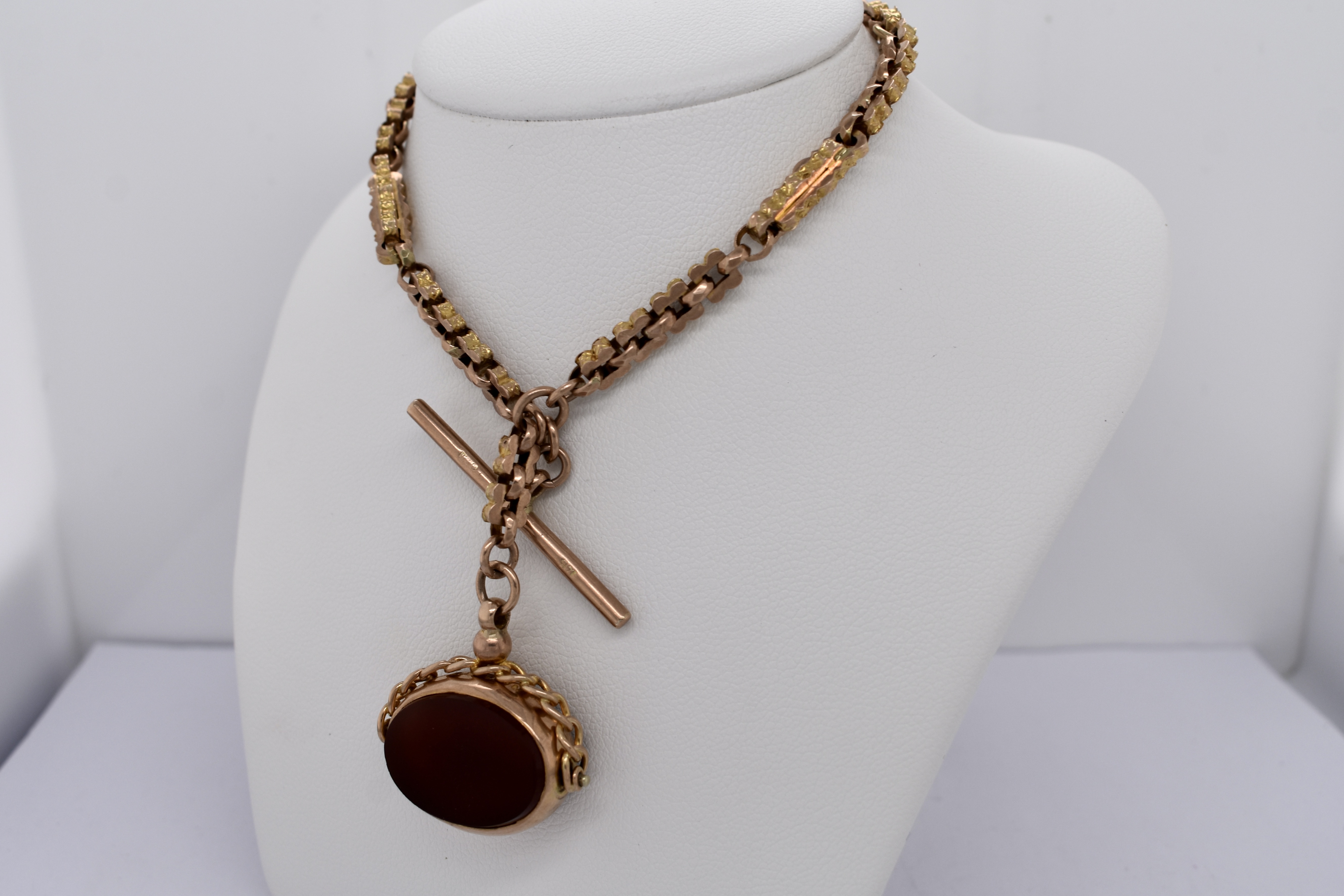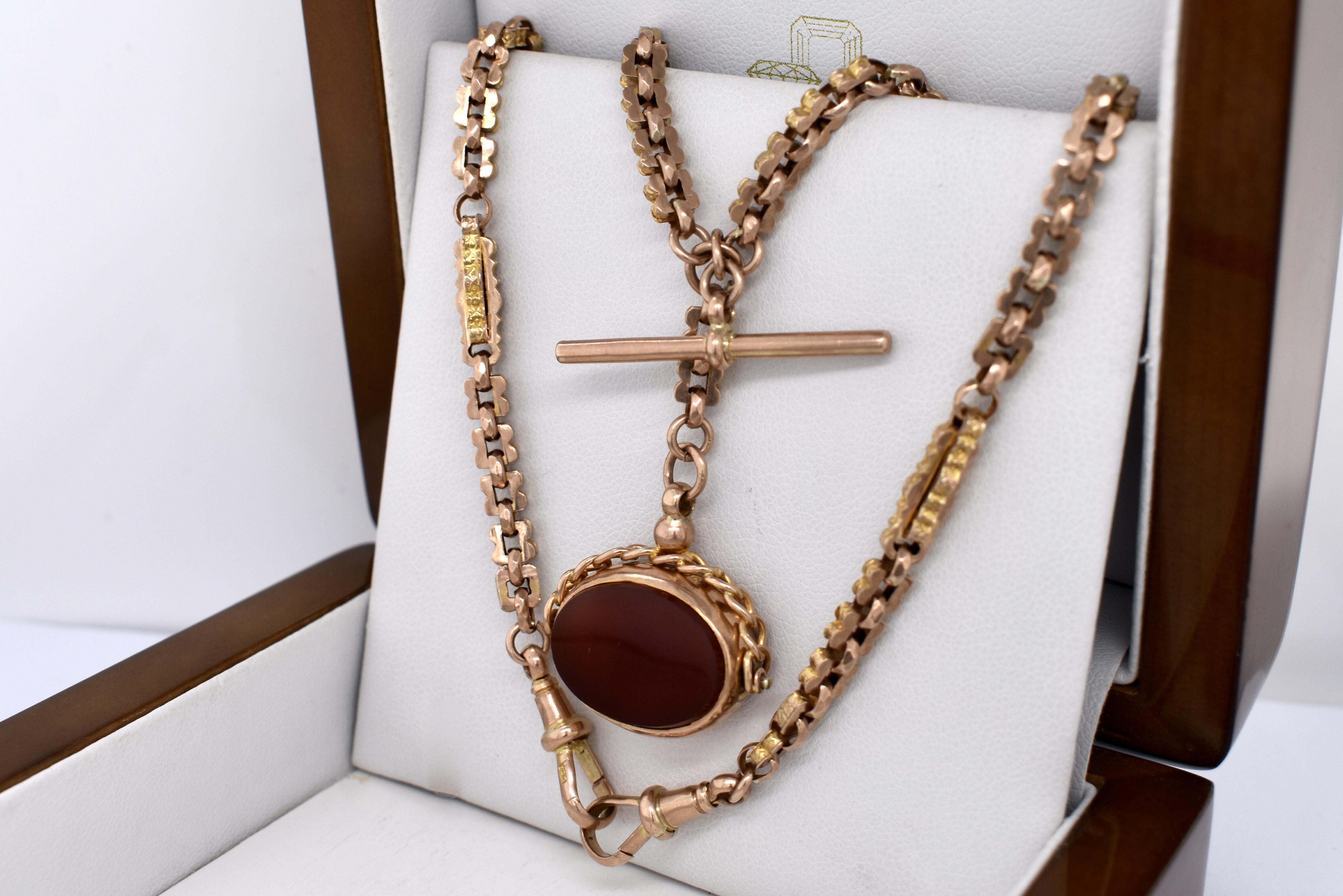This unique 37cm albert chain, is hallmarked Birmingham 1923, with a fancy scalloped and figaro style link. Crafted in 9ct rose gold, this antique chain features a double swivel with a T-bar and bloodstone/carnelian swivel attached. One carnelian measuring 18.30x13.50mm and one bloodstone measuring 18.30x13.50mm on the other side. 18.05 grams. Independent Valuation Supplied.