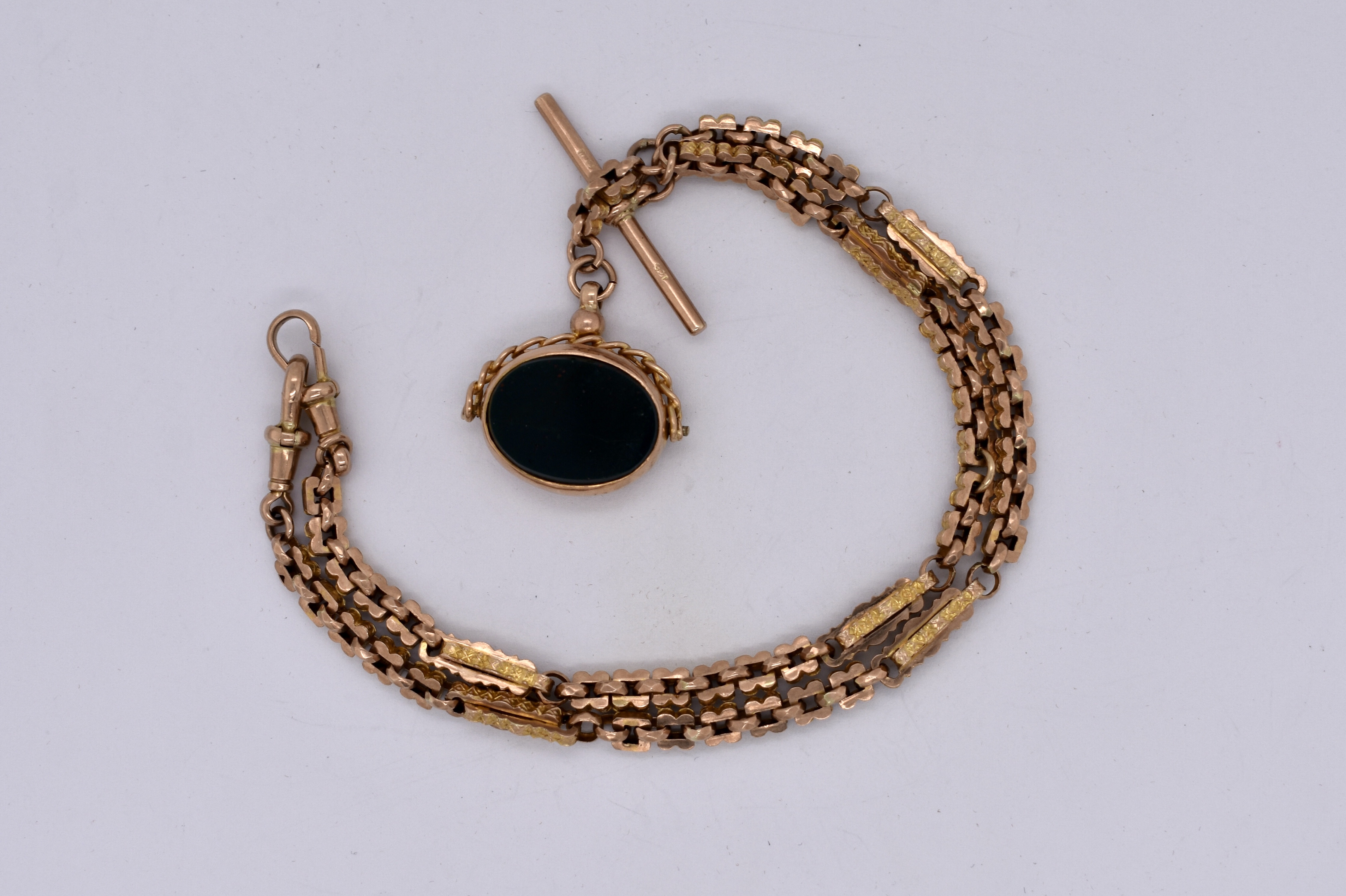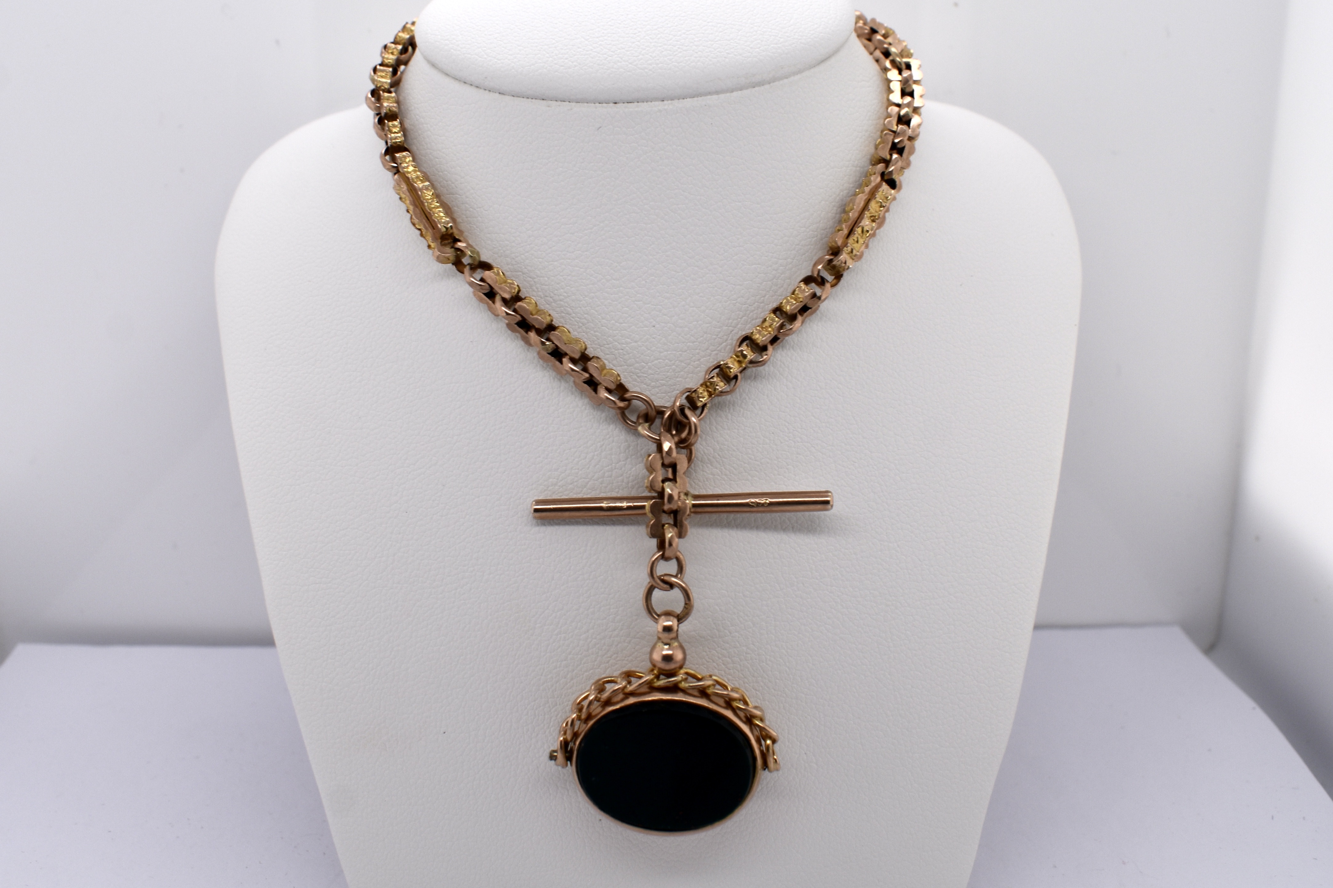 SOLD 9ct Rose Gold Albert Chain 37cm Birmingham 1923 with T-bar, Bloodstone & Carnelian Spinner