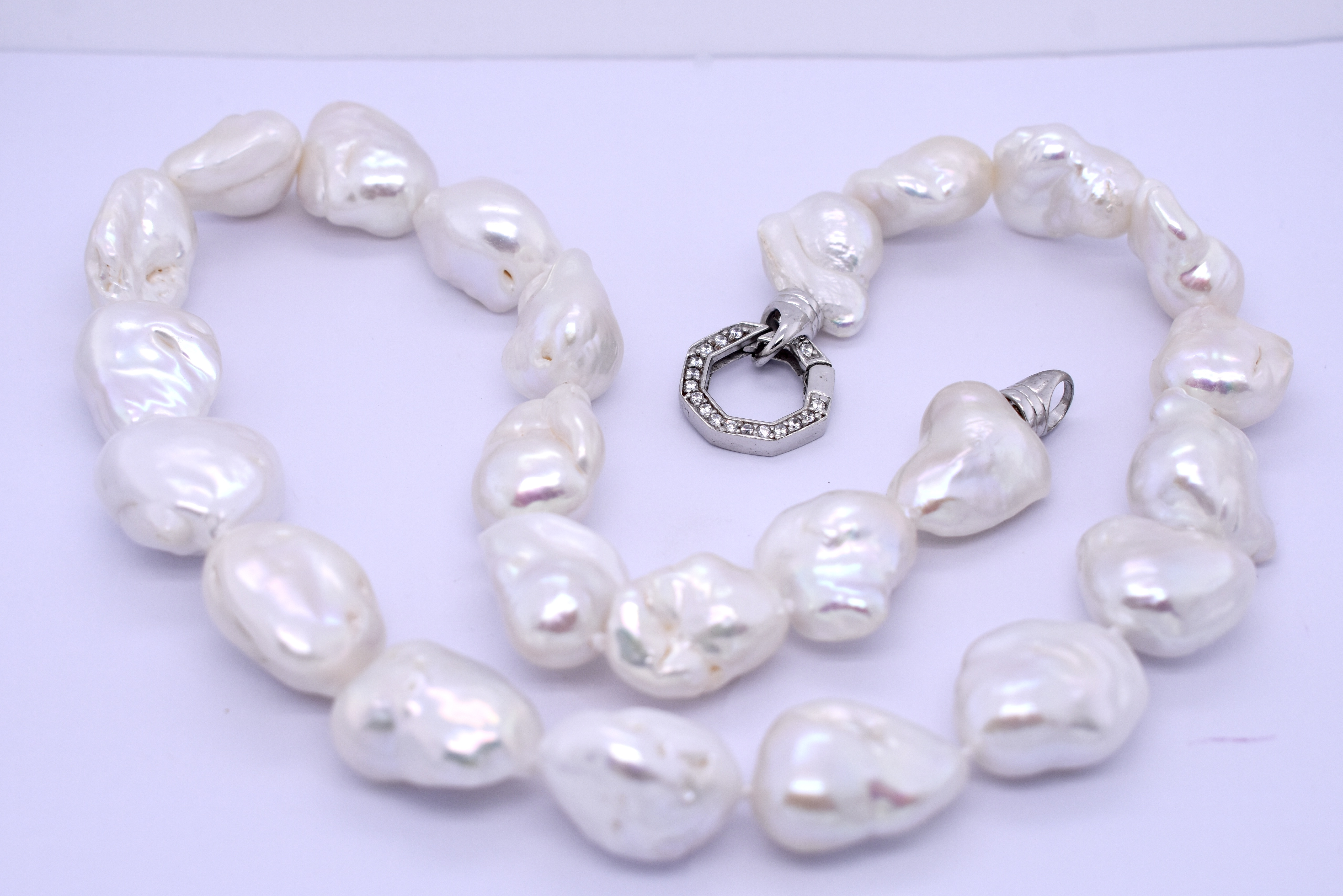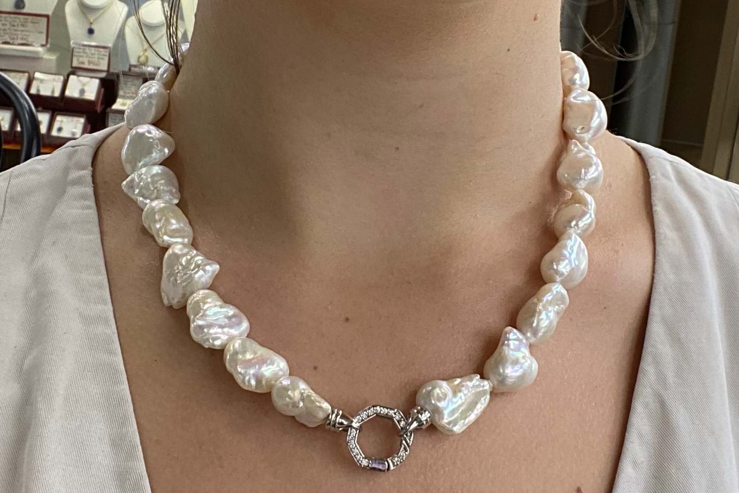 Lustrous strand of 16-16.5mm baroque freshwater pearls with sterling silver loop ends measuring 48.5cm, with a sterling silver CZ hex clasp.
