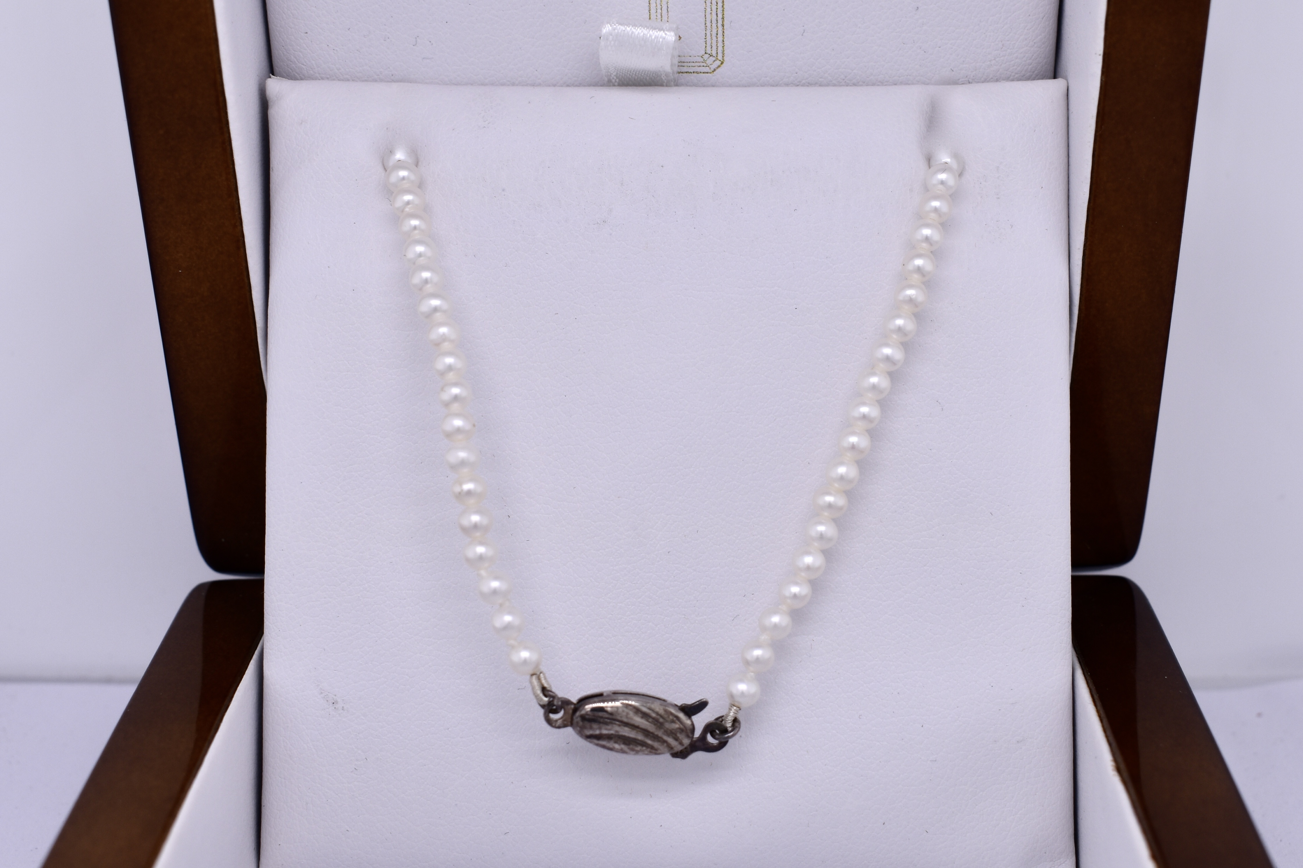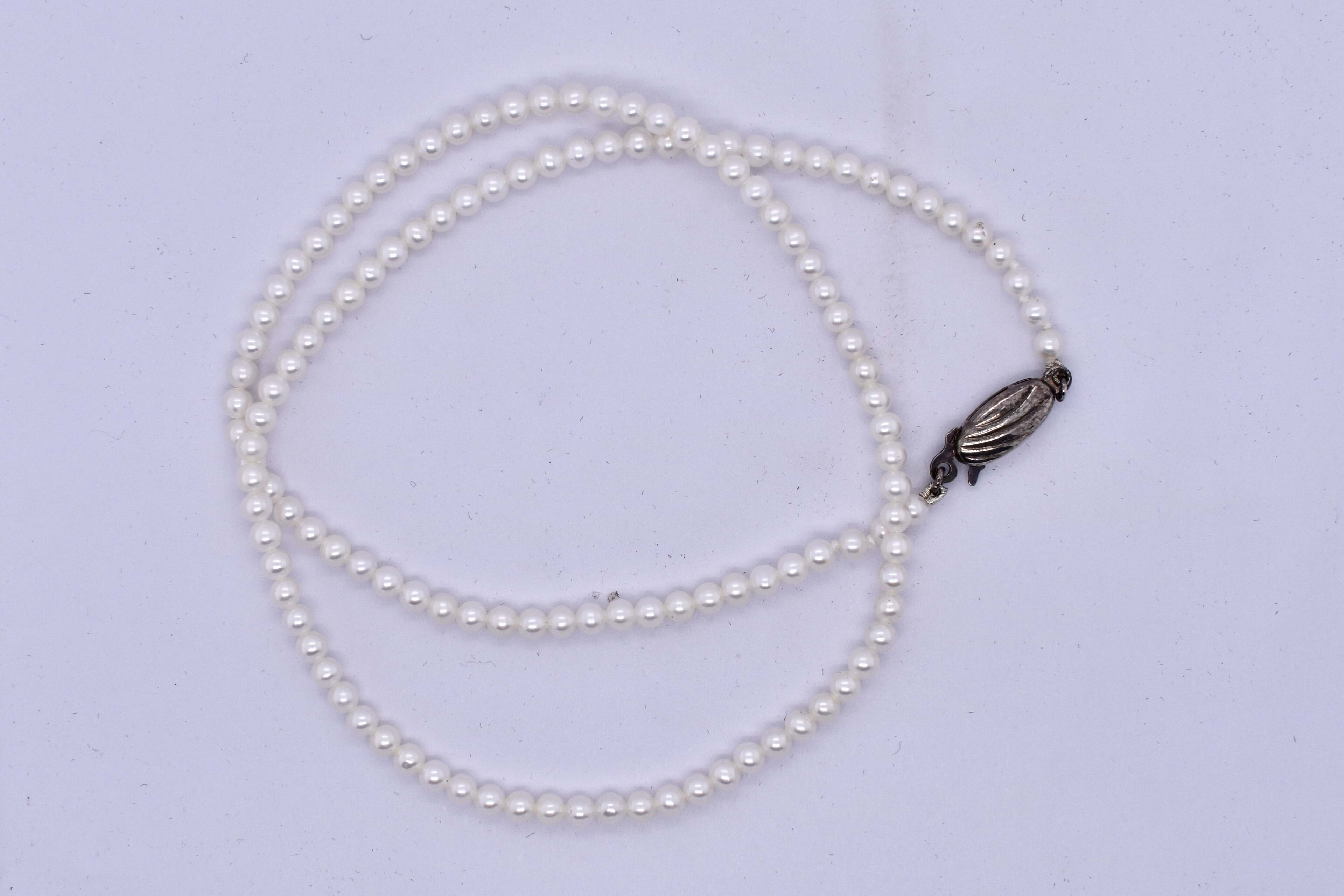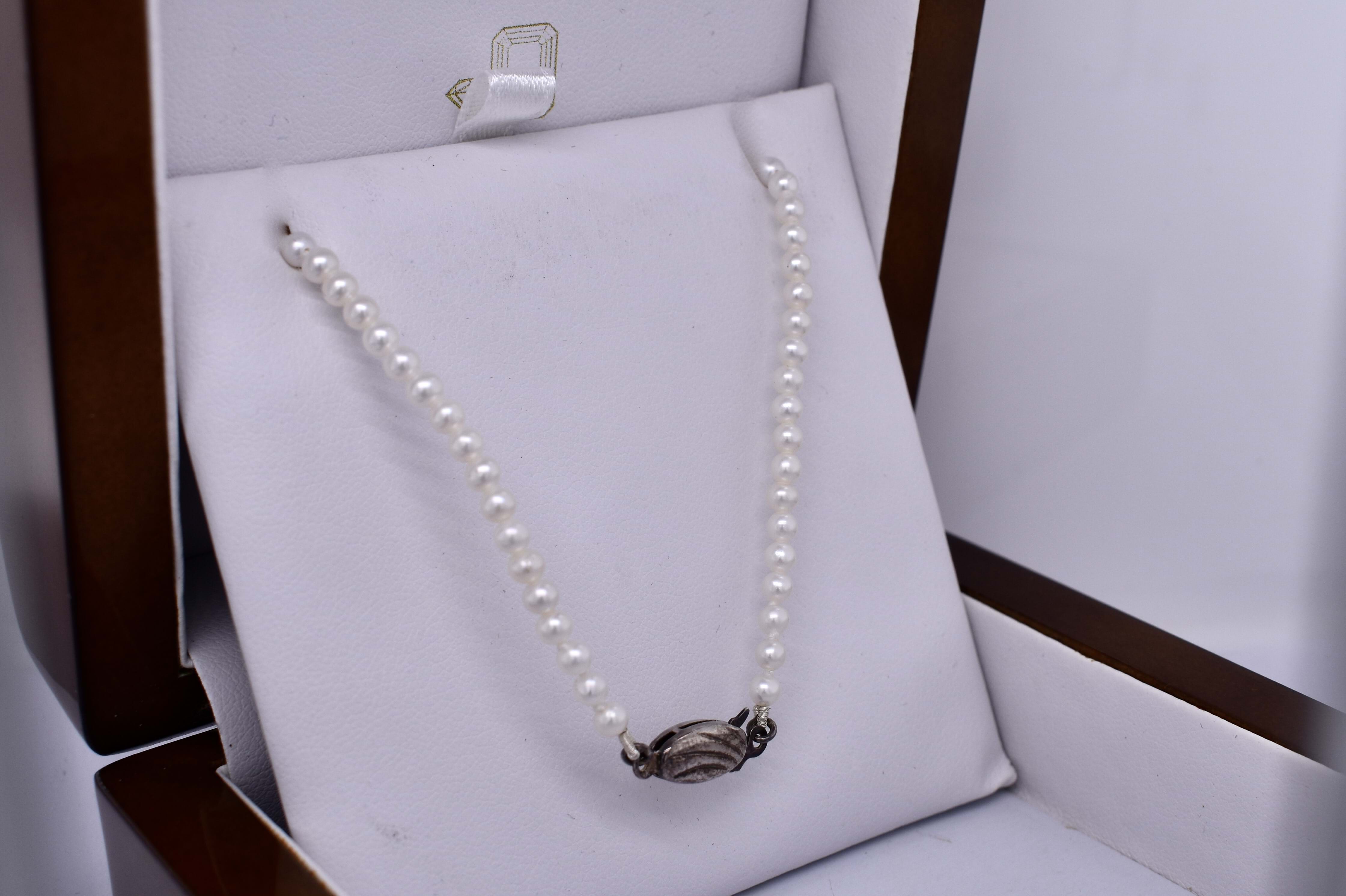 Lovely strand of freshwater seed pearls measuring 3-3.5mm hand strung on silver with a sterling silver pearl clasp. This strand measures 42cm and is pretty worn as is or with a pendant or enhancer suspended from it.