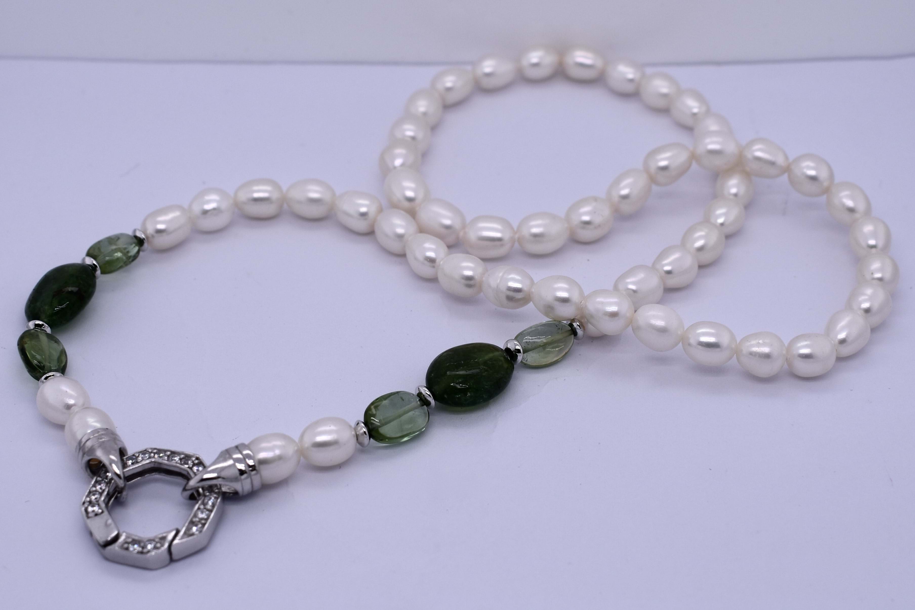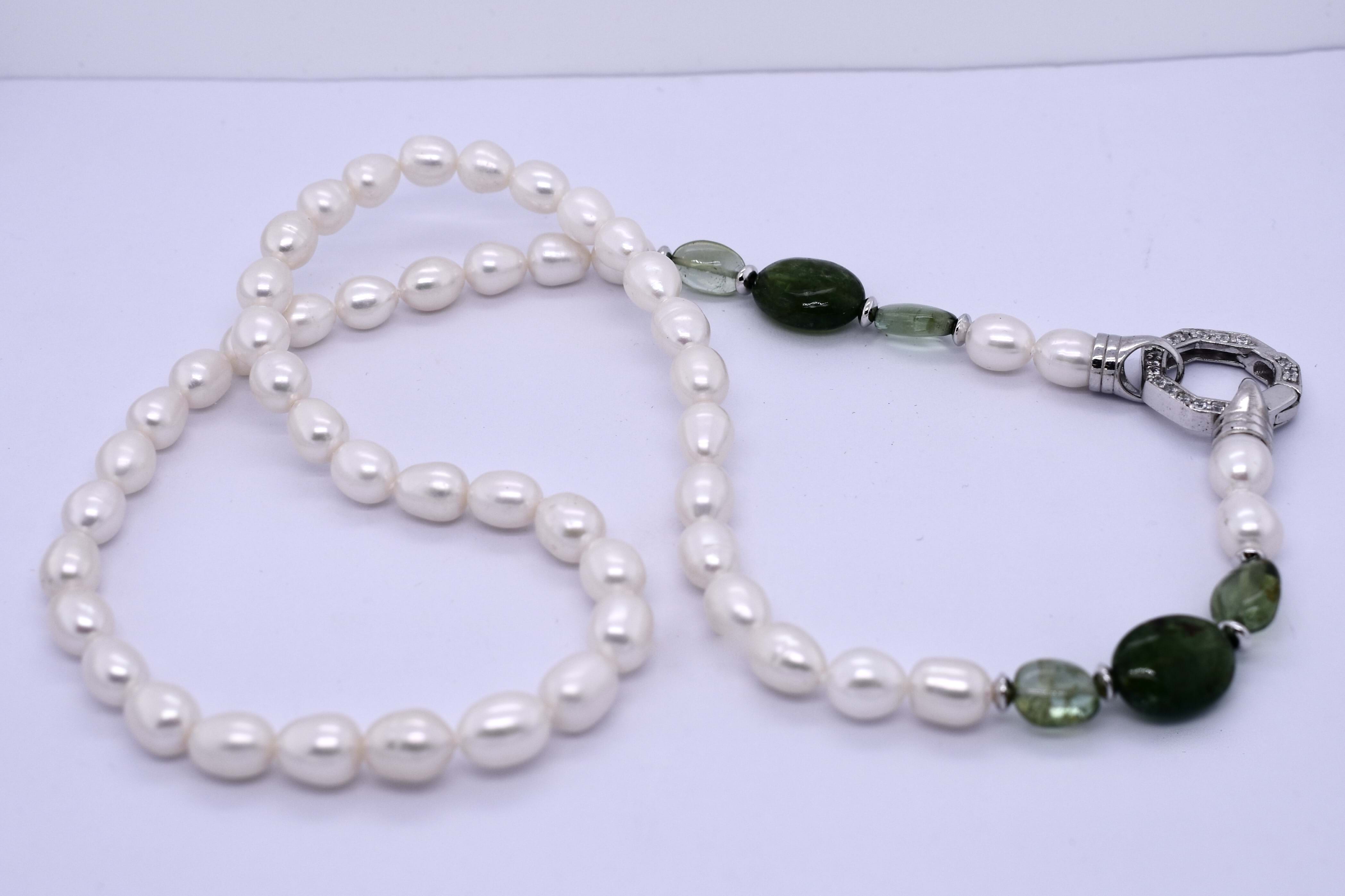 Stunning strand of 6x7mm freshwater pearls & six tumbled green tourmaline with sterling silver loop ends measuring 49.5cm, with a sterling silver CZ encrusted hex clasp.