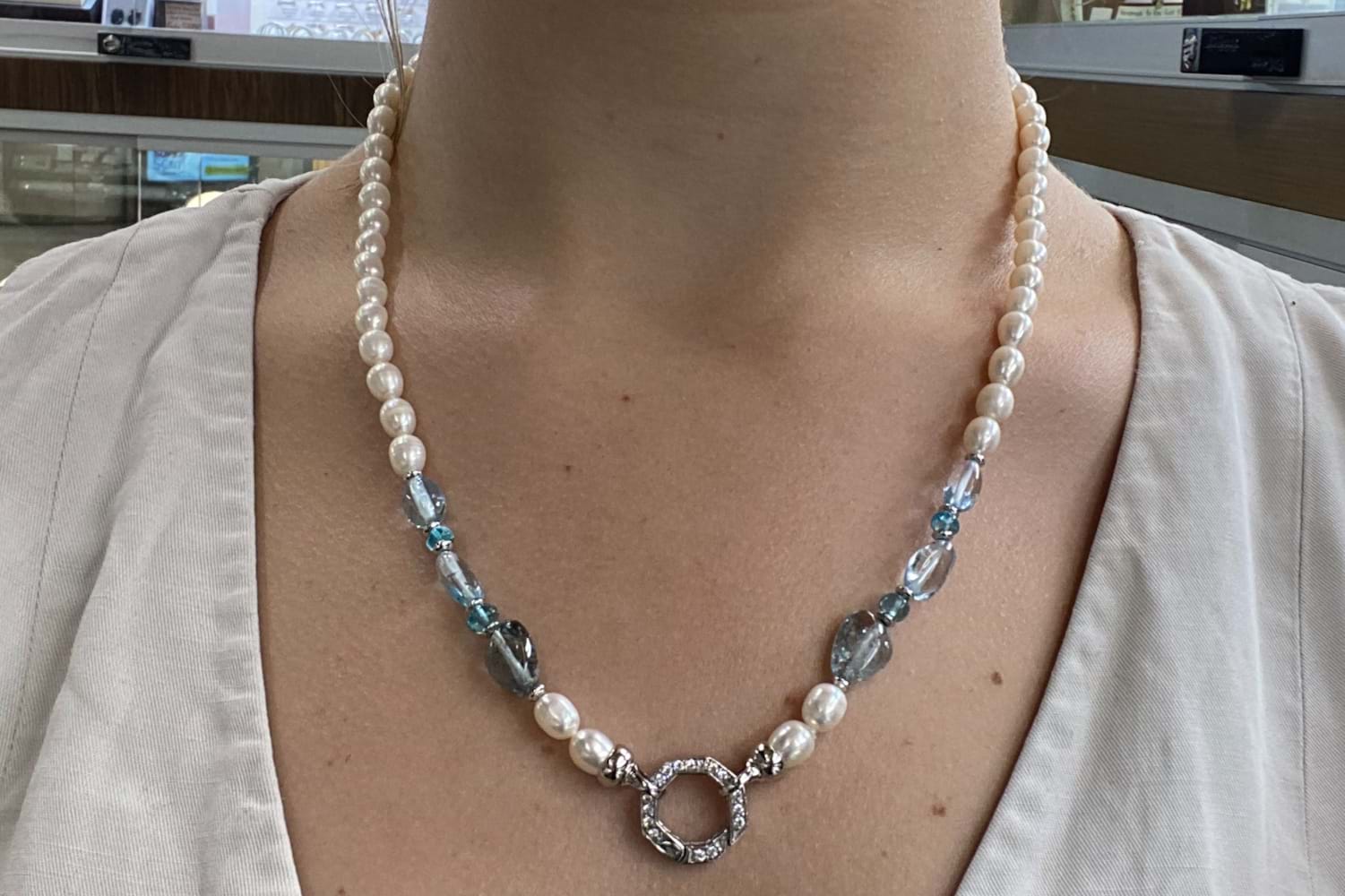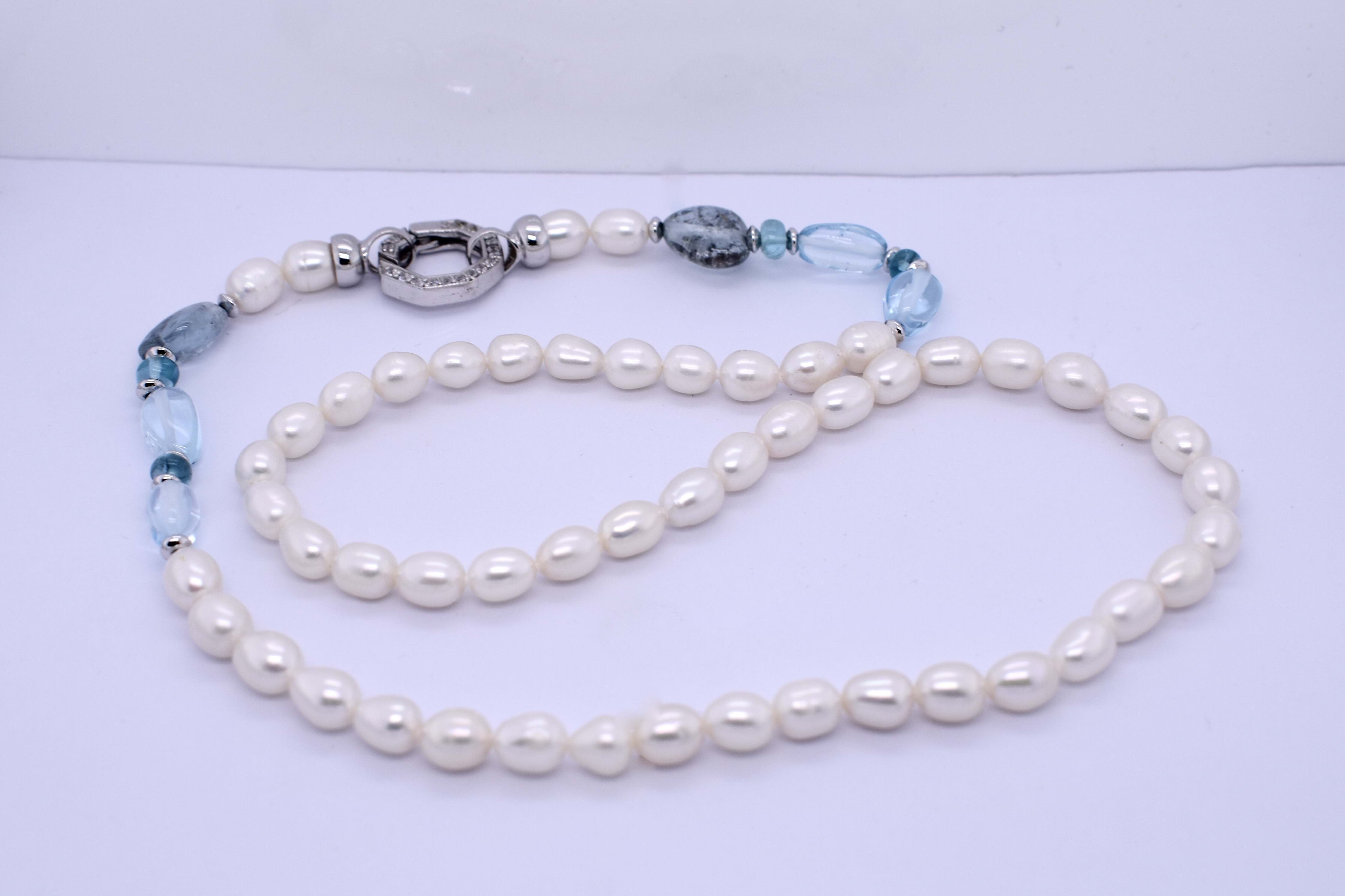 Sterling Silver 7x5mm Freshwater Pearl & Apatite Strand 53cm with CZ Hex Clasp