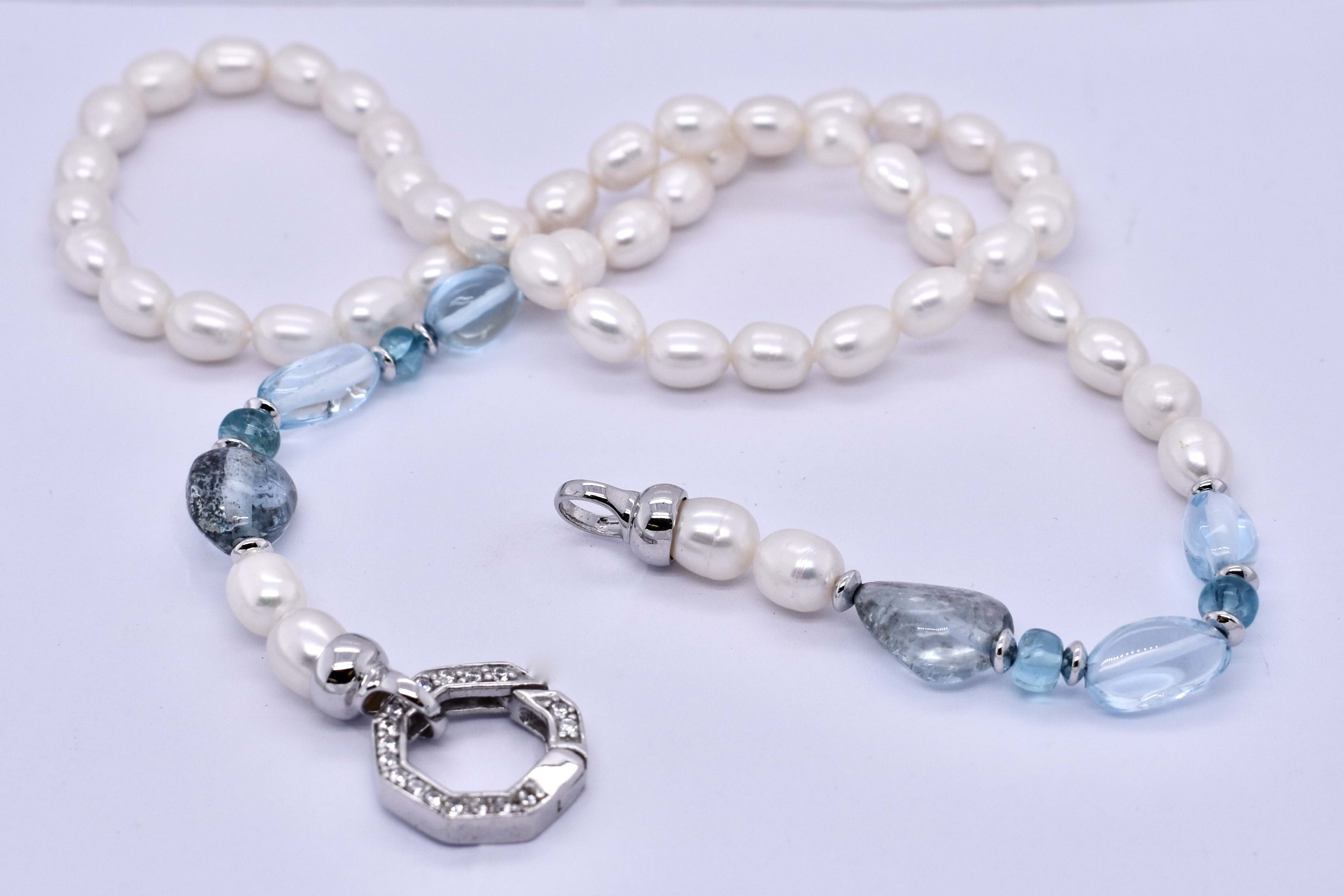 Gorgeous and bright strand of 7x5mm freshwater pearls & 10 tumbled apatite with sterling silver loop ends measuring 53cm, with a sterling silver CZ encrusted hex clasp.