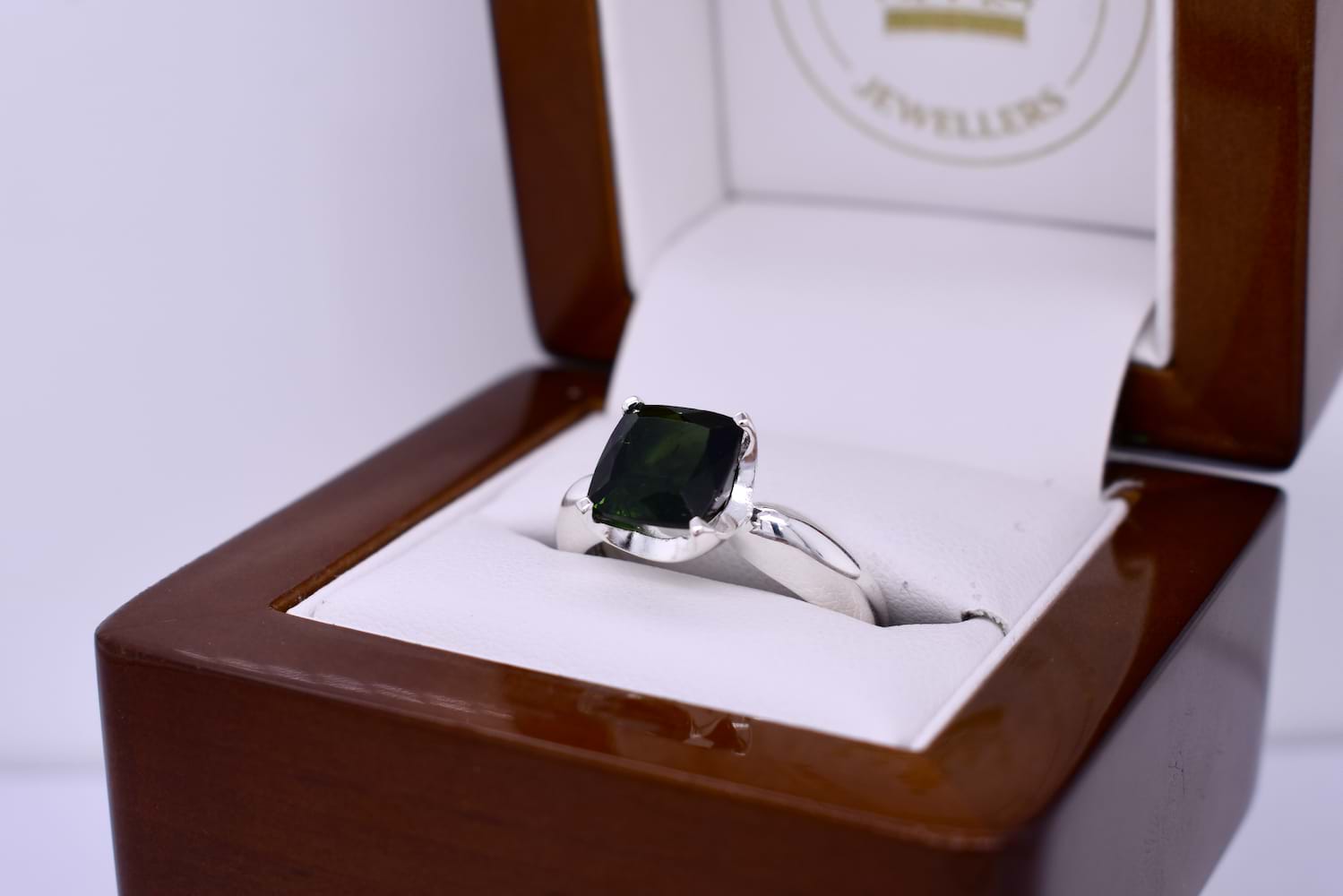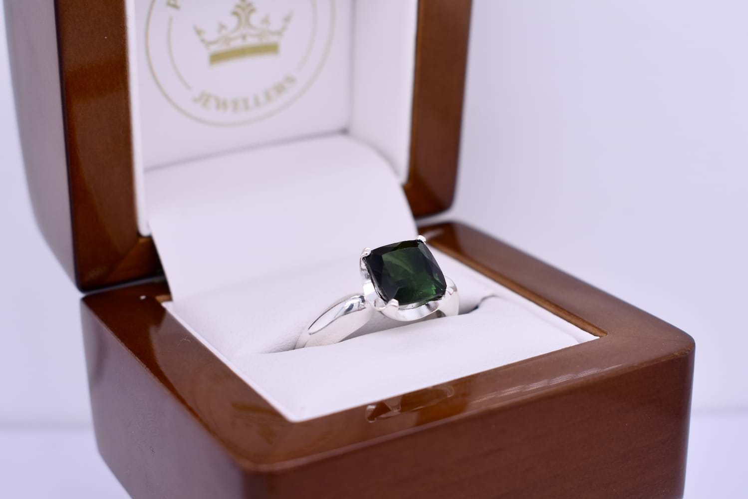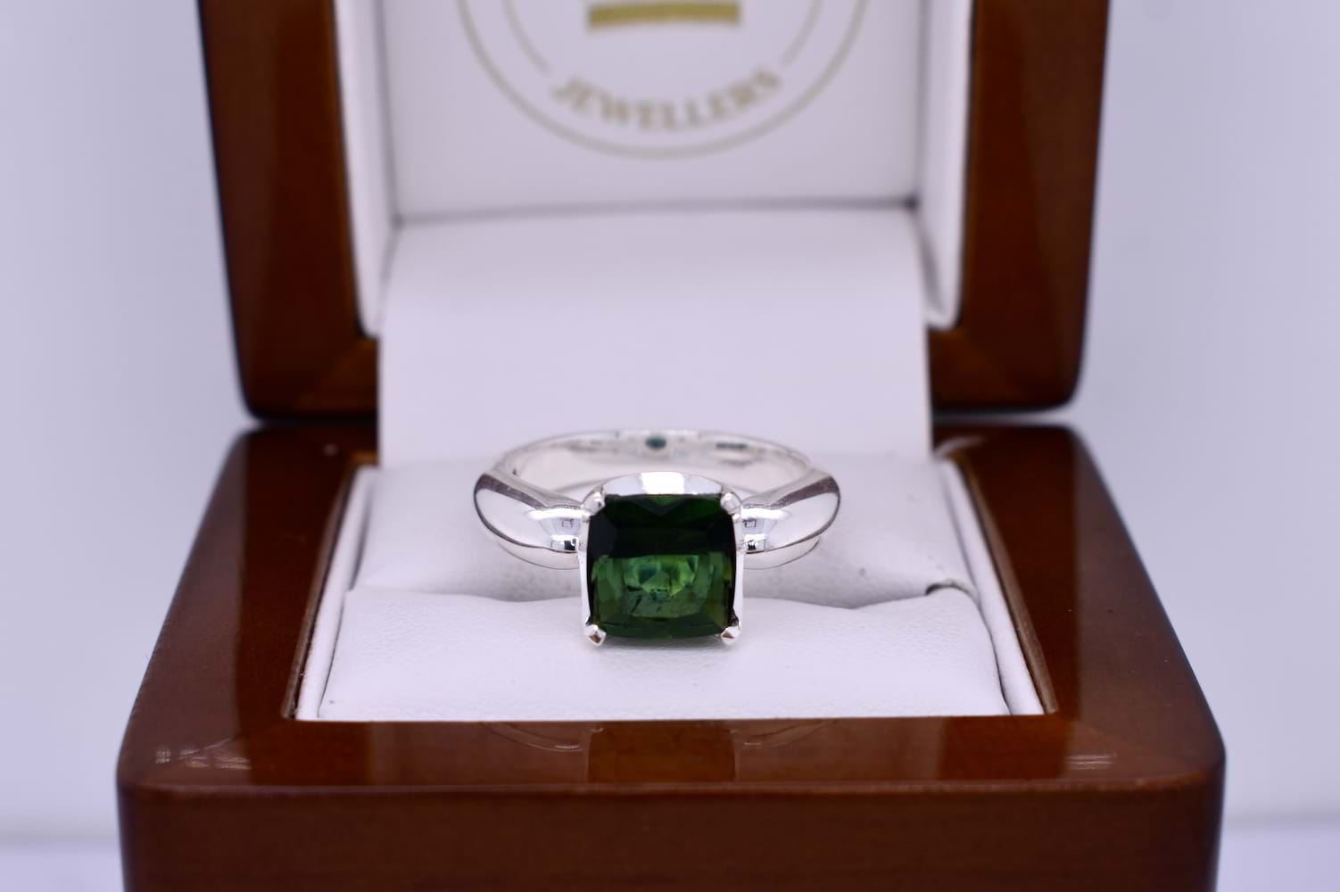 Classic and simple, this sterling silver ring features a square shaped 8.7mm green tourmaline, four claw set with a pinched rounded band. Finger size P+.