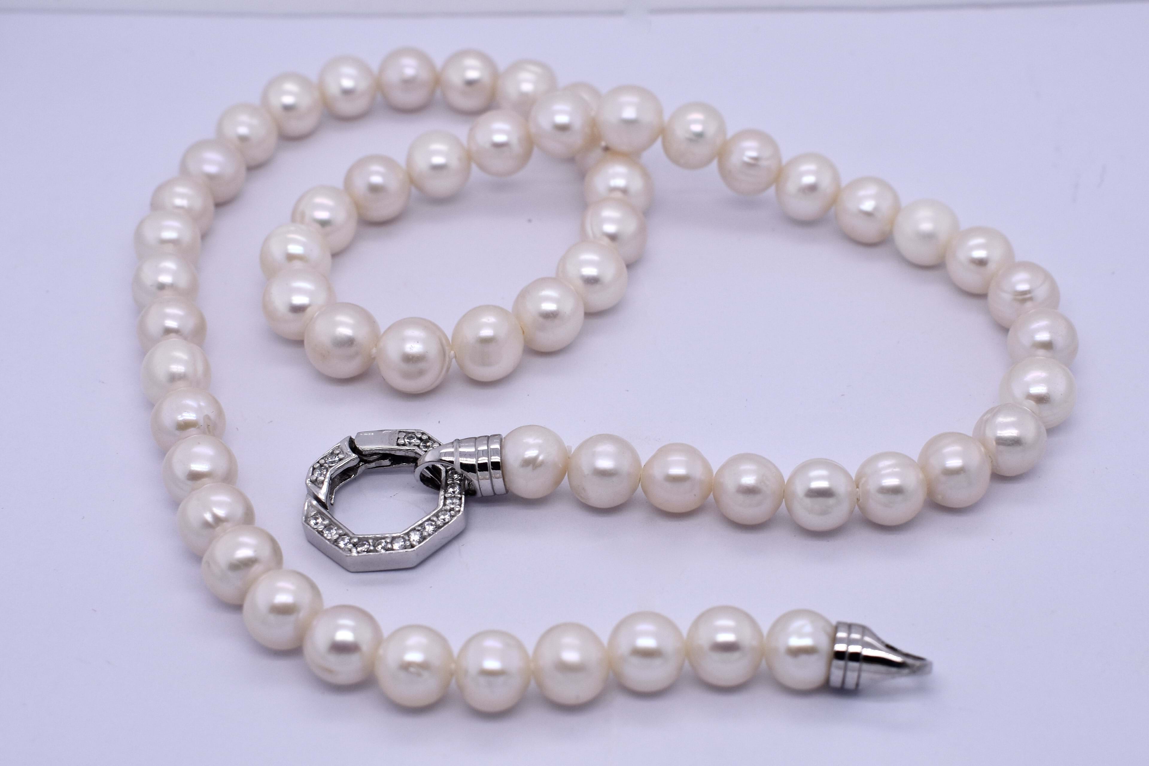 Lustrous strand of 8mm freshwater pearls measuring 48cm, with sterling silver loop ends and a CZ encrusted hex clasp.