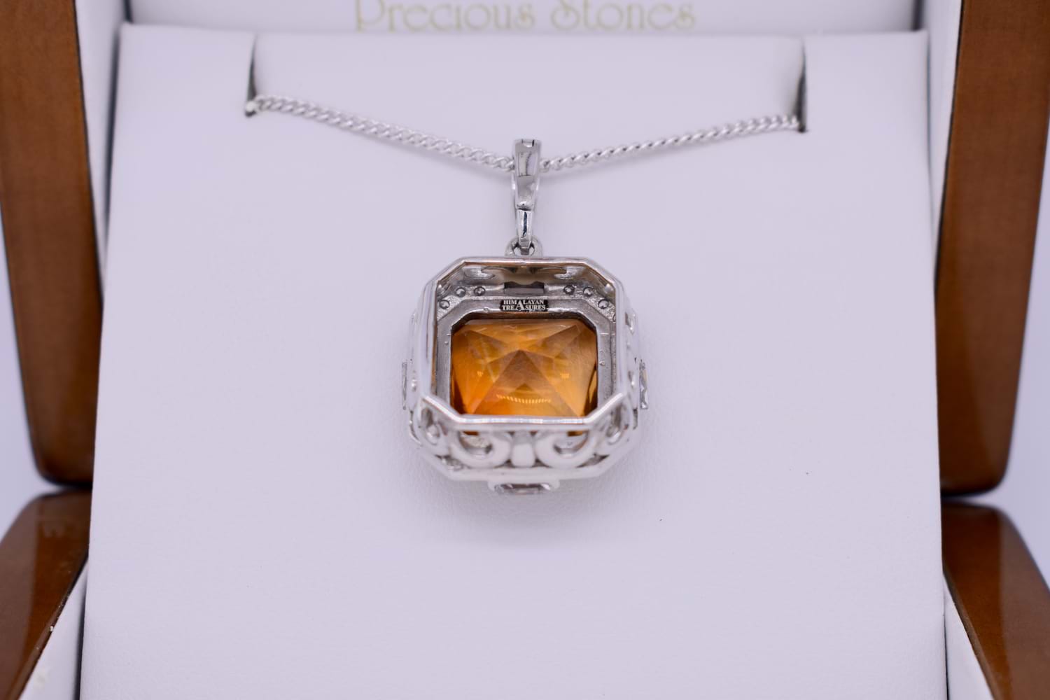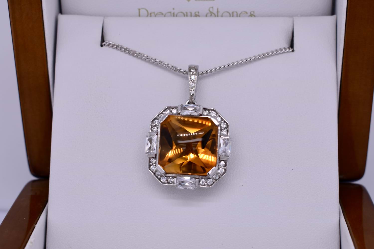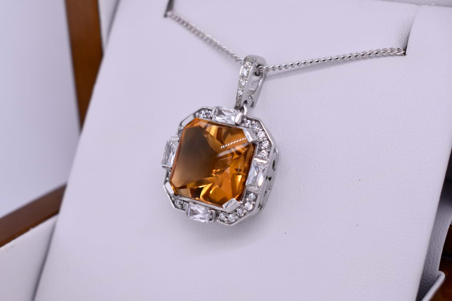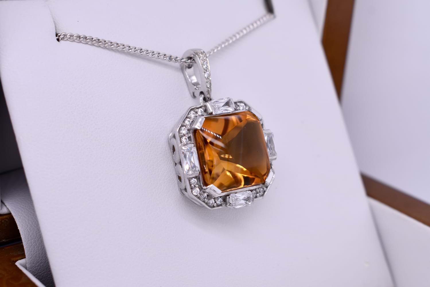 This fiery orange pendant features a cabochon citrine measuring approx. 34x11mm, square claw set in sterling silver and surrounded by a sparkling, geometric CZ halo. The enhancer bale is also encrusted with CZ's. The enhancer bale allows the piece to be worn on a fine chain as well as being clipped onto pearls, bolt rings and heavier link chains. Chains are available for separate purchase.
