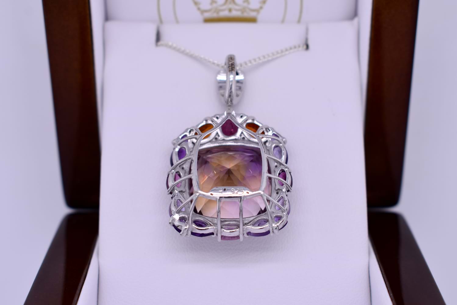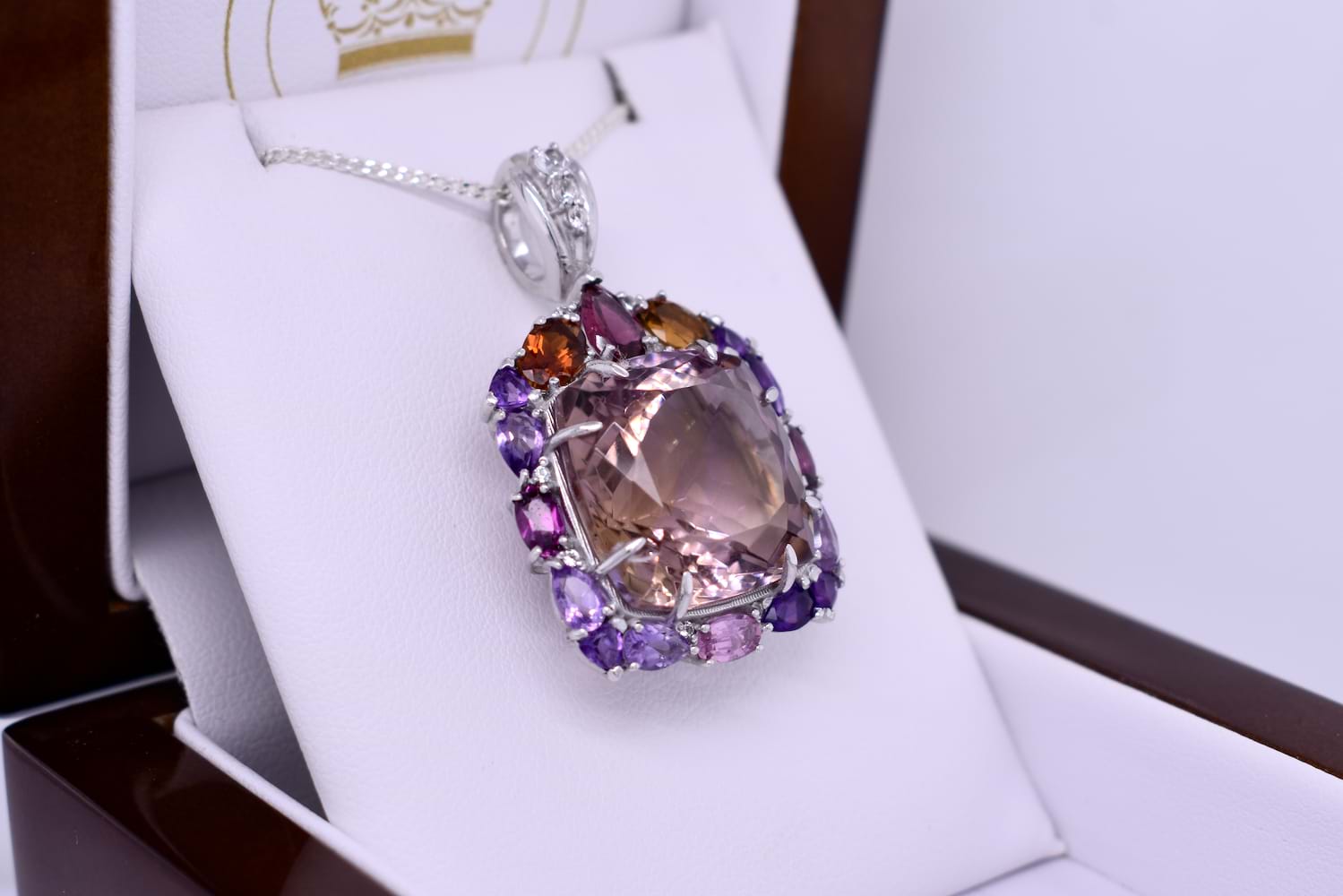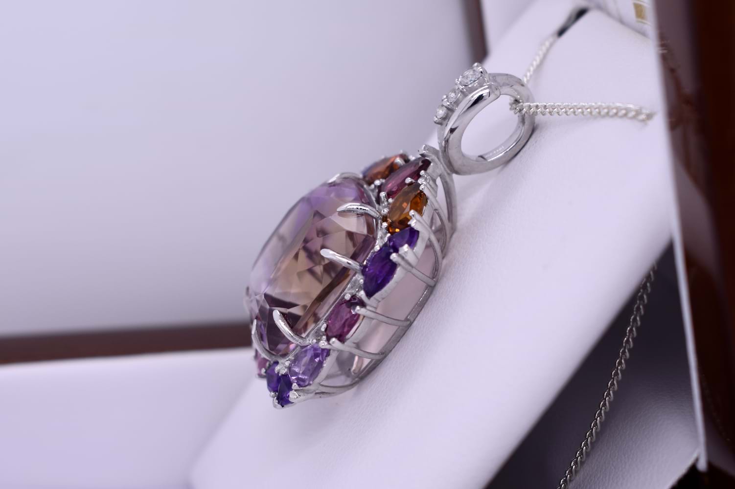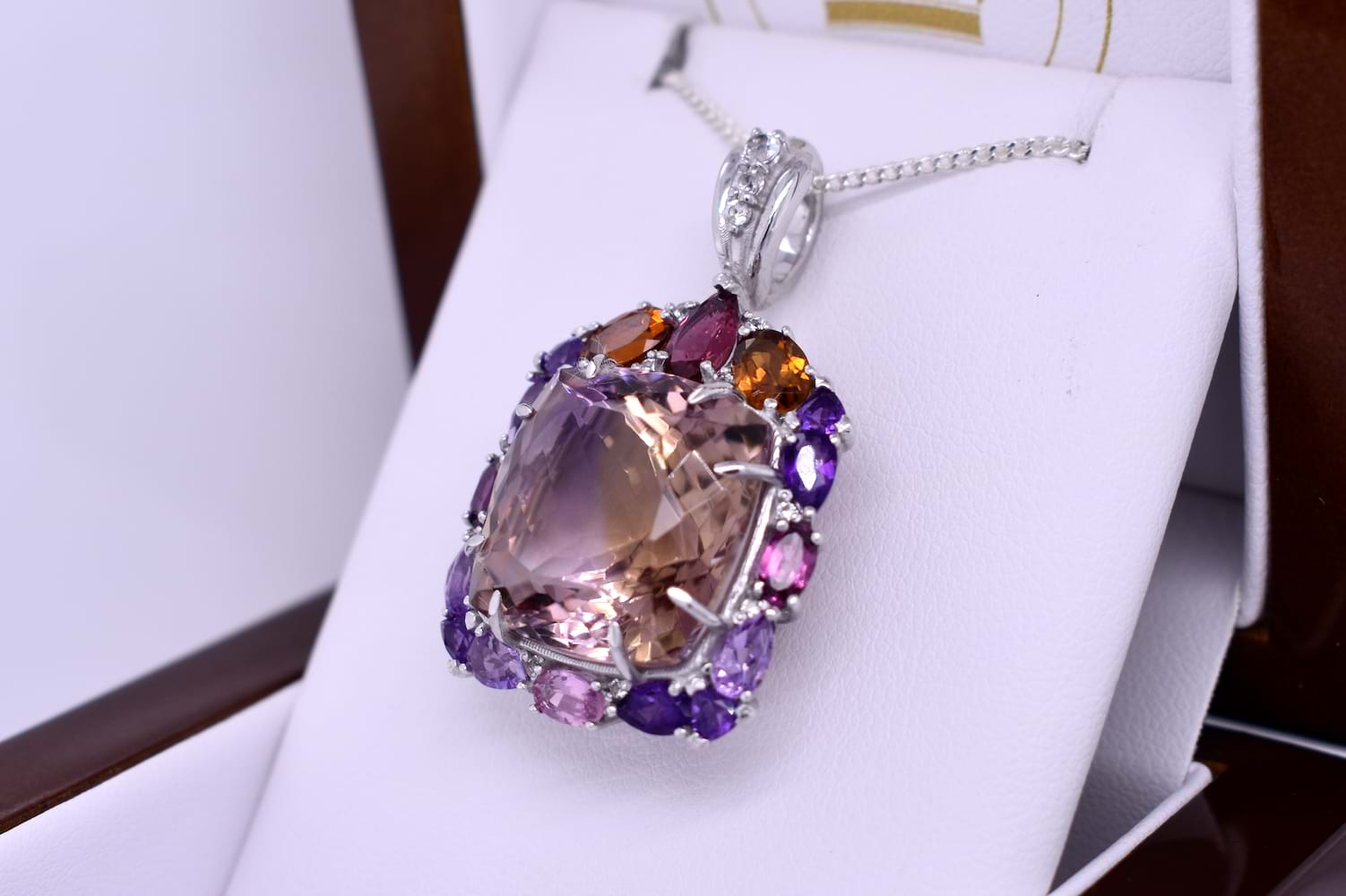 Absolutely fabulous, this sterling silver pendant has a cushion cut 17x17mm ametrine in the centre, eight claw set with a multicoloured halo of amethysts, citrines and tourmalines. Finished with a CZ set tapered bale. Pendant measures 28x24mm. Chains available for separate purchase.