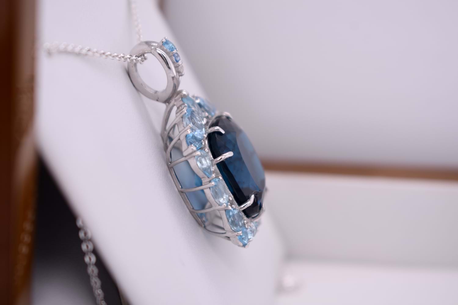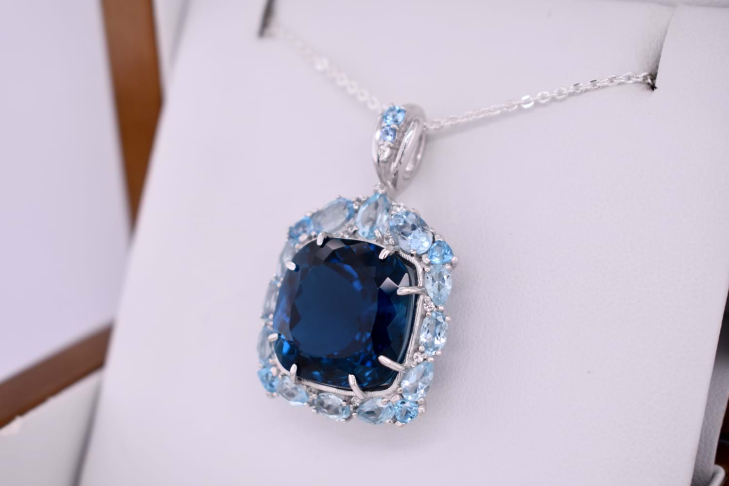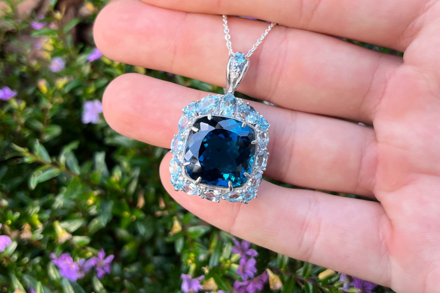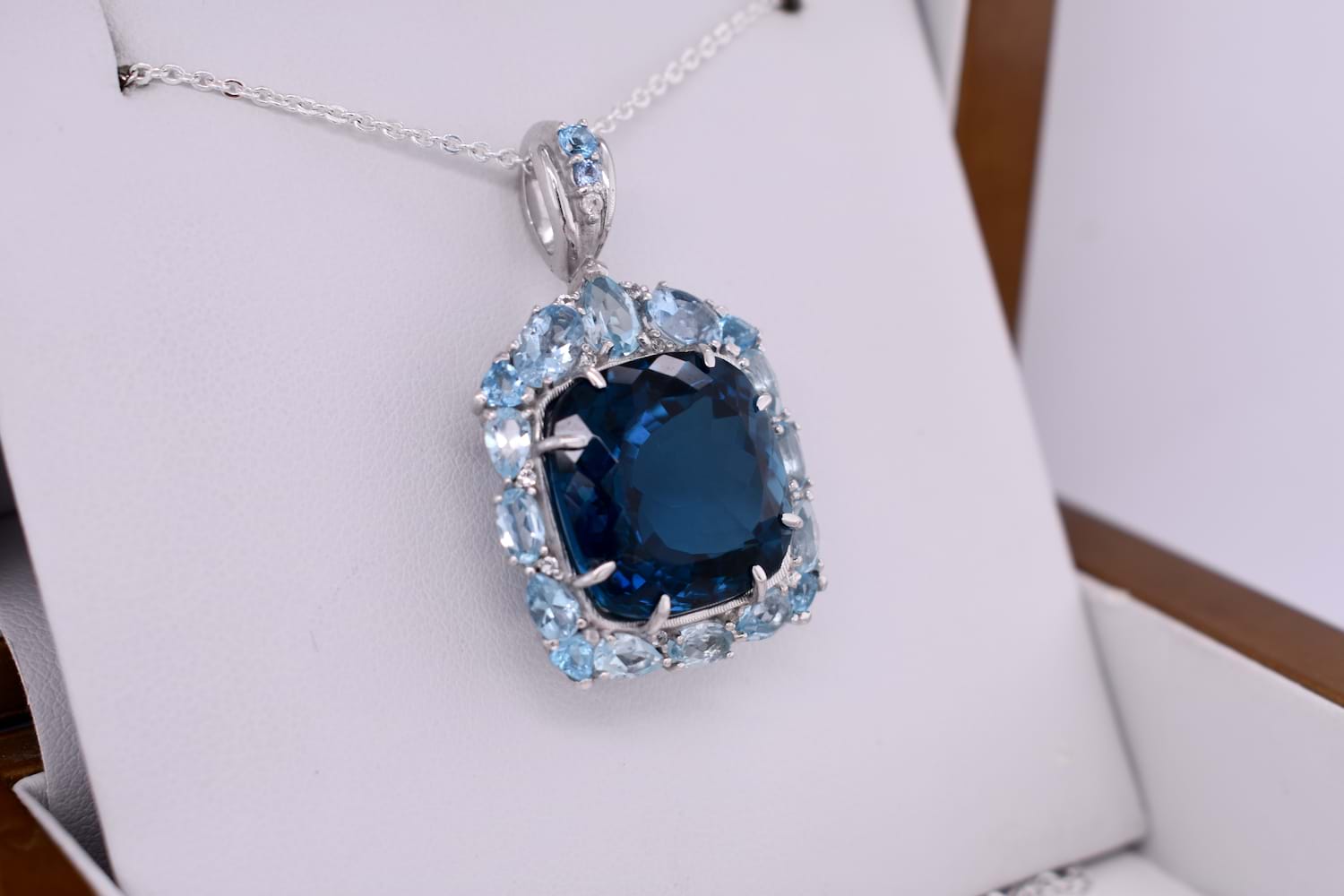 This dazzling pendant features a bright, vibrant, clean and well cut London Blue Topaz measuring approx. 16.8x16.8mm, 8 claw set into sterling silver. Complimented with a geometric halo consisting of 18 sky blue topaz & 11 colourless sapphires. Finished with a gemstone set tapered bale. Independent valuation supplied. Chains are available for separate purchase.