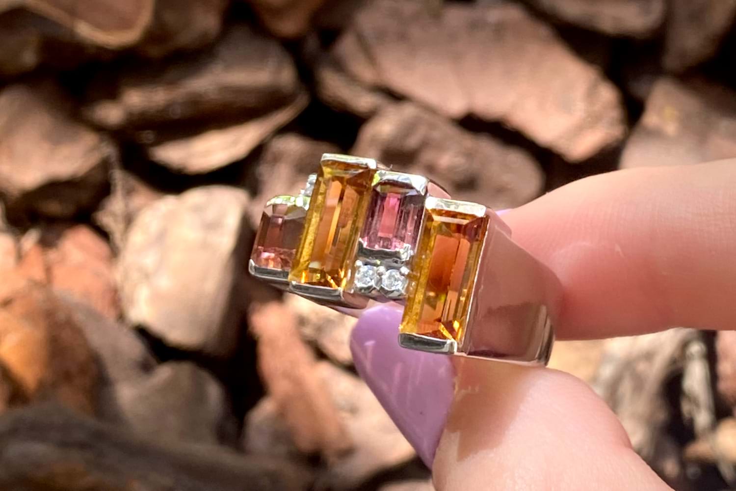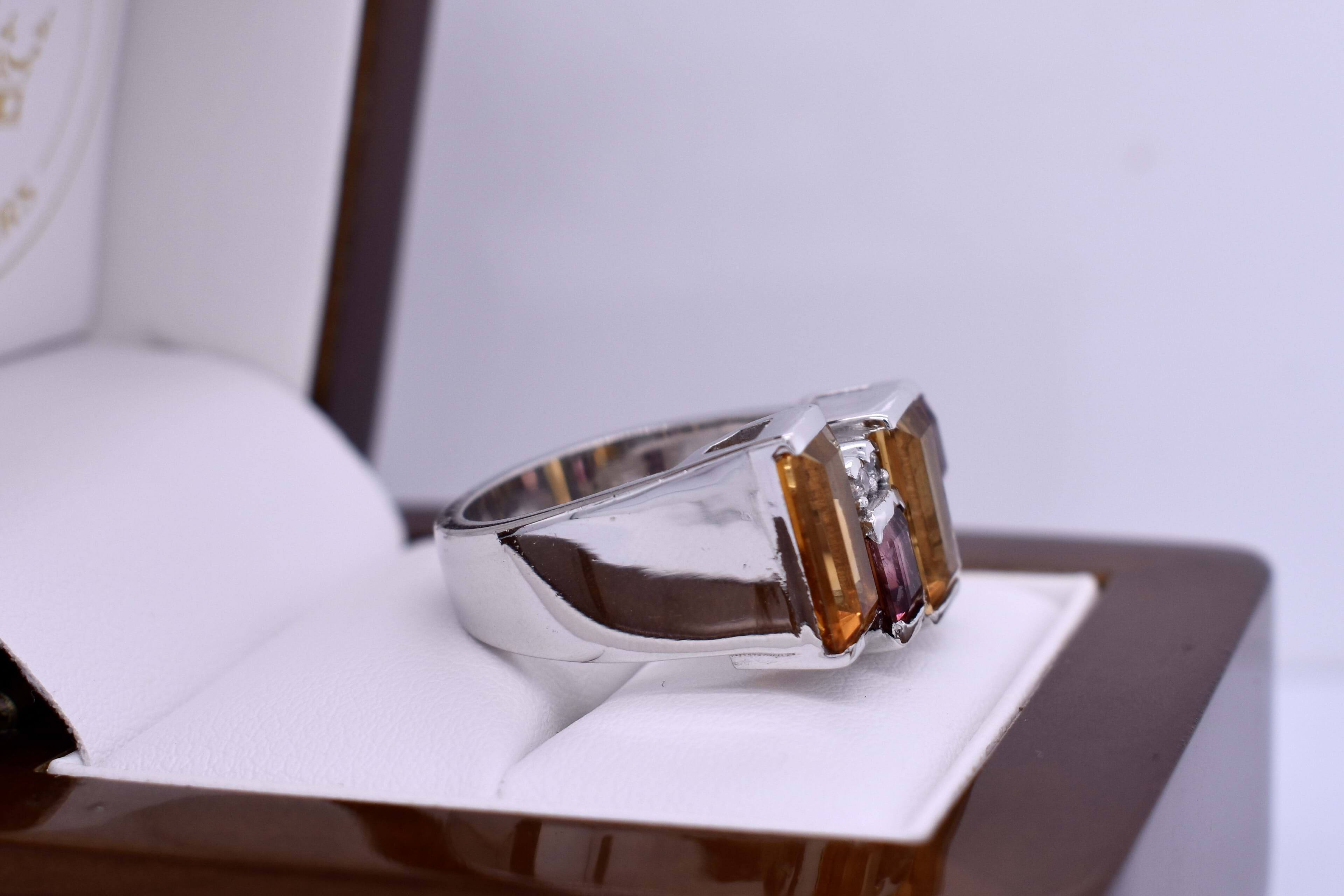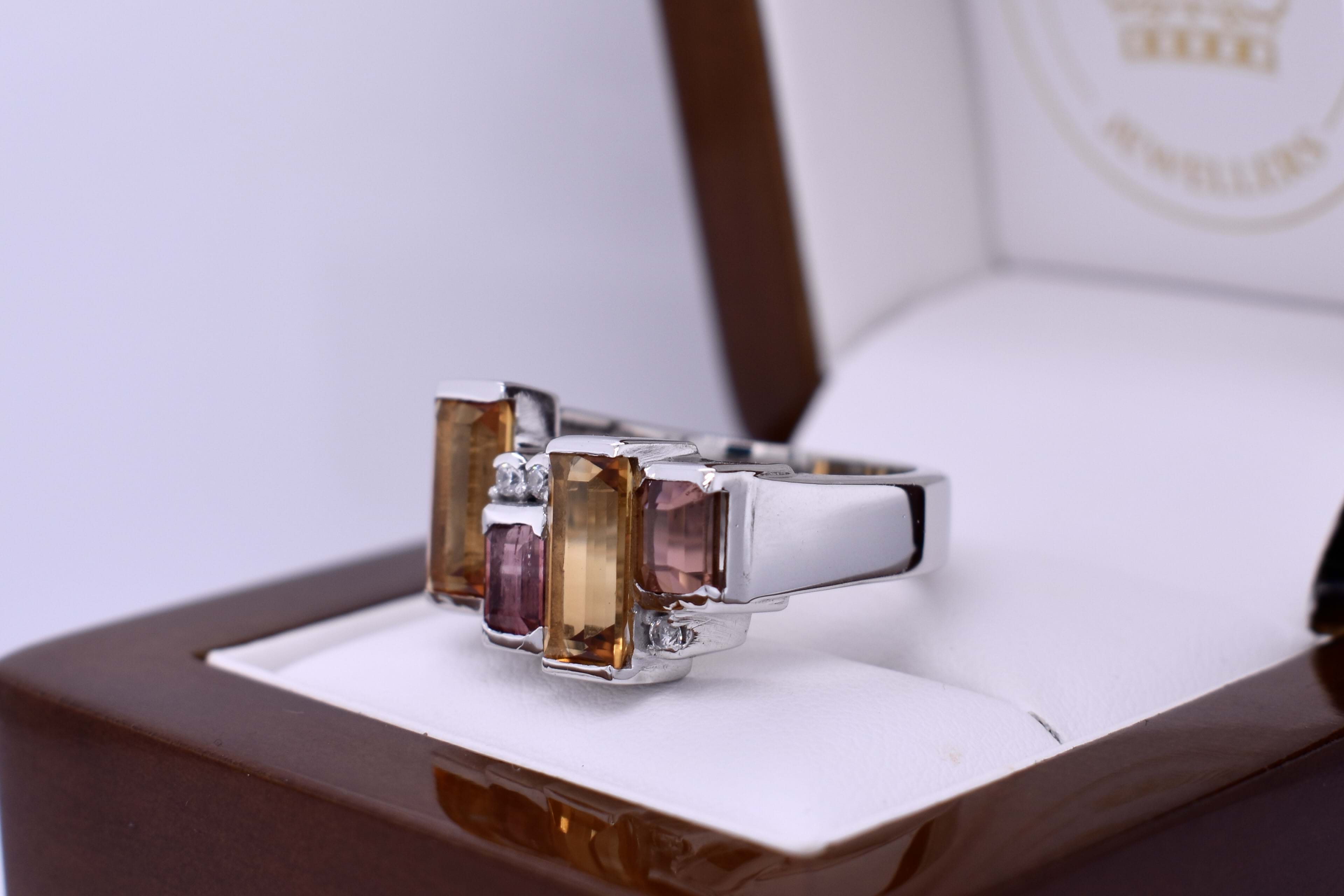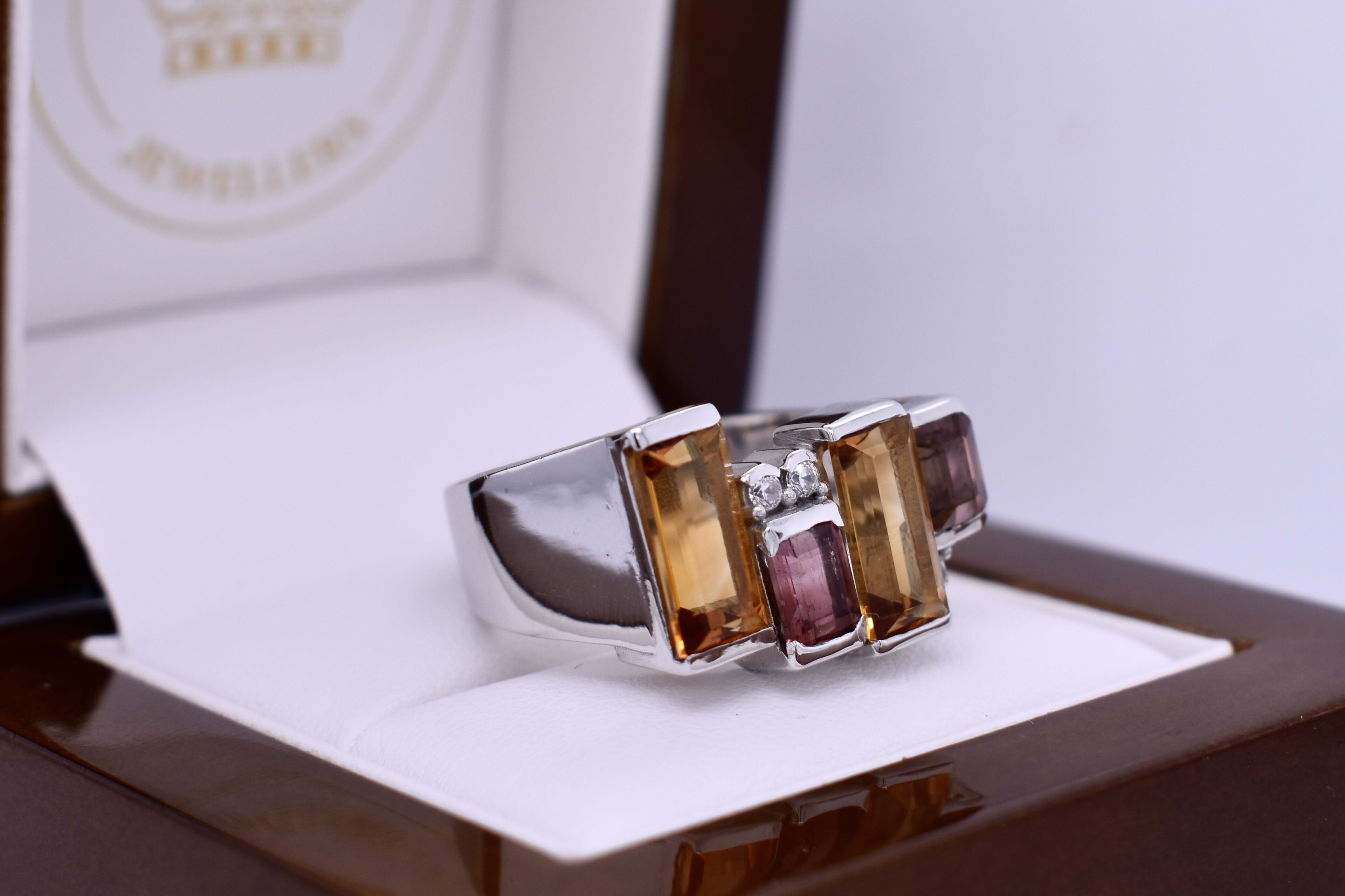This unique ring features CZ, citrines and tourmaline on a geometric flat top ring. The two citrine measure approx. 10.8x5mm and the two pink tourmaline measure 5.5x5mm. All gemstones are semi bezel set in sterling silver with partial CZ accents. Finished on a plain, flat band. Finger size Q
