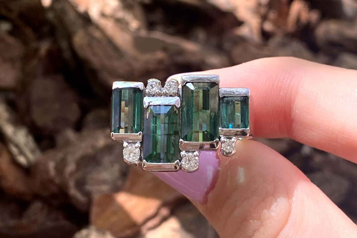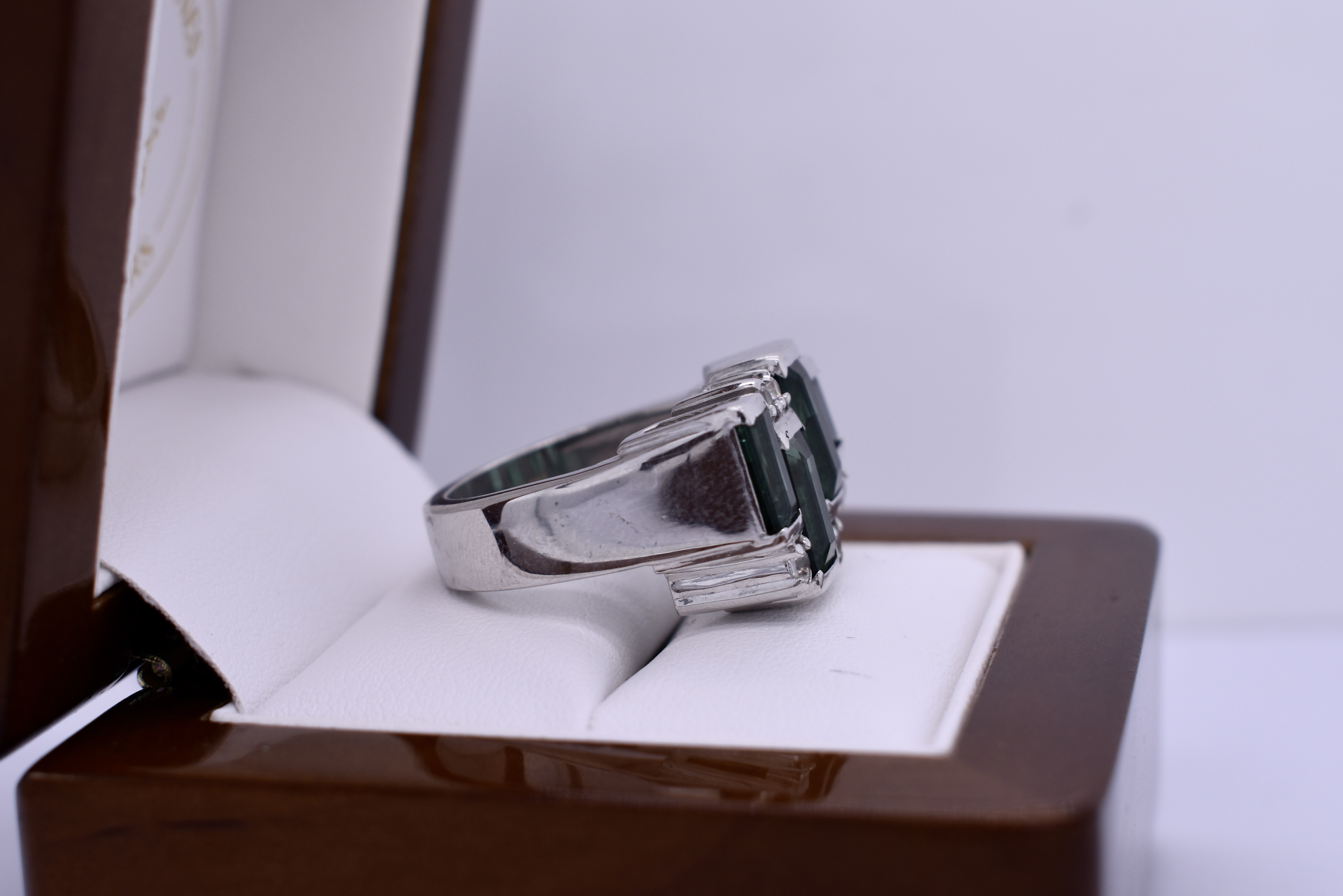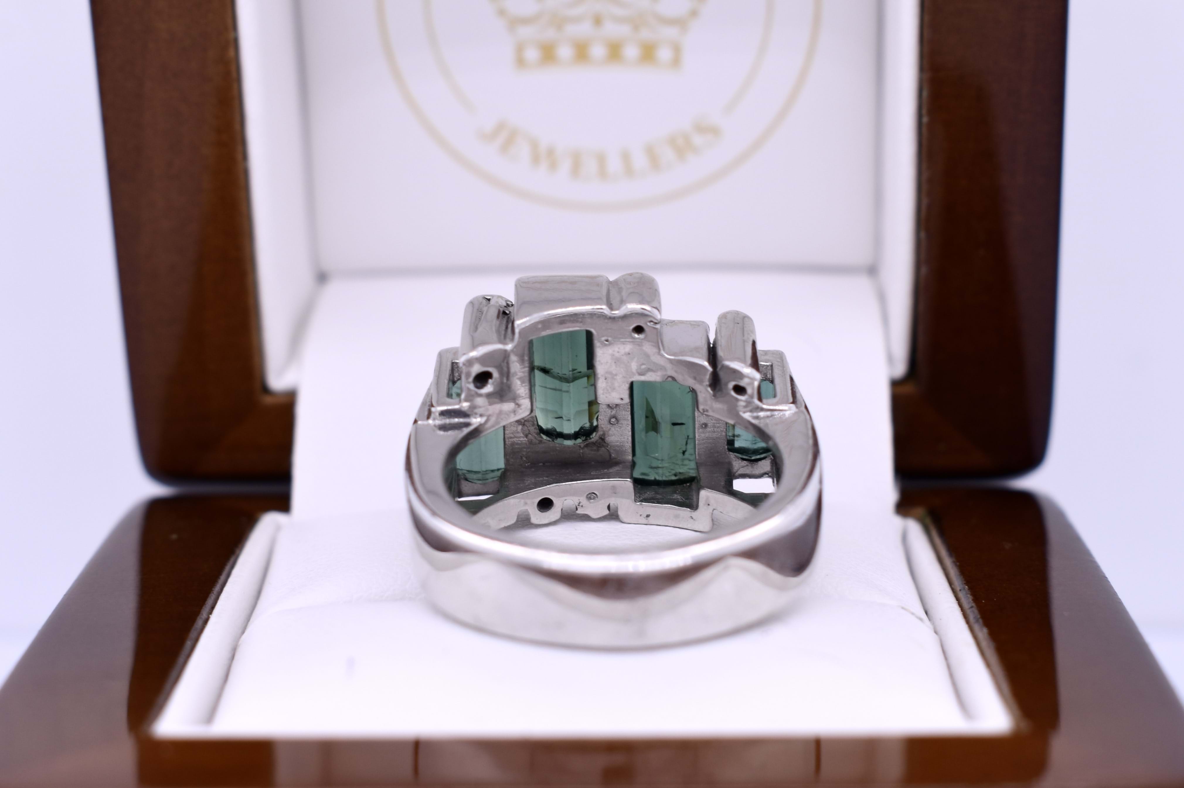 This striking geometric flat top ring features a four-stone arrangement of emerald cut green tourmalines, highlighted with cubic zirconia accents. The four tourmalines measure approximately 4.8x4mm to 8.6x5.1mm and are semi bezel set in sterling silver. Finished with a plain, flat band. Finger size P.