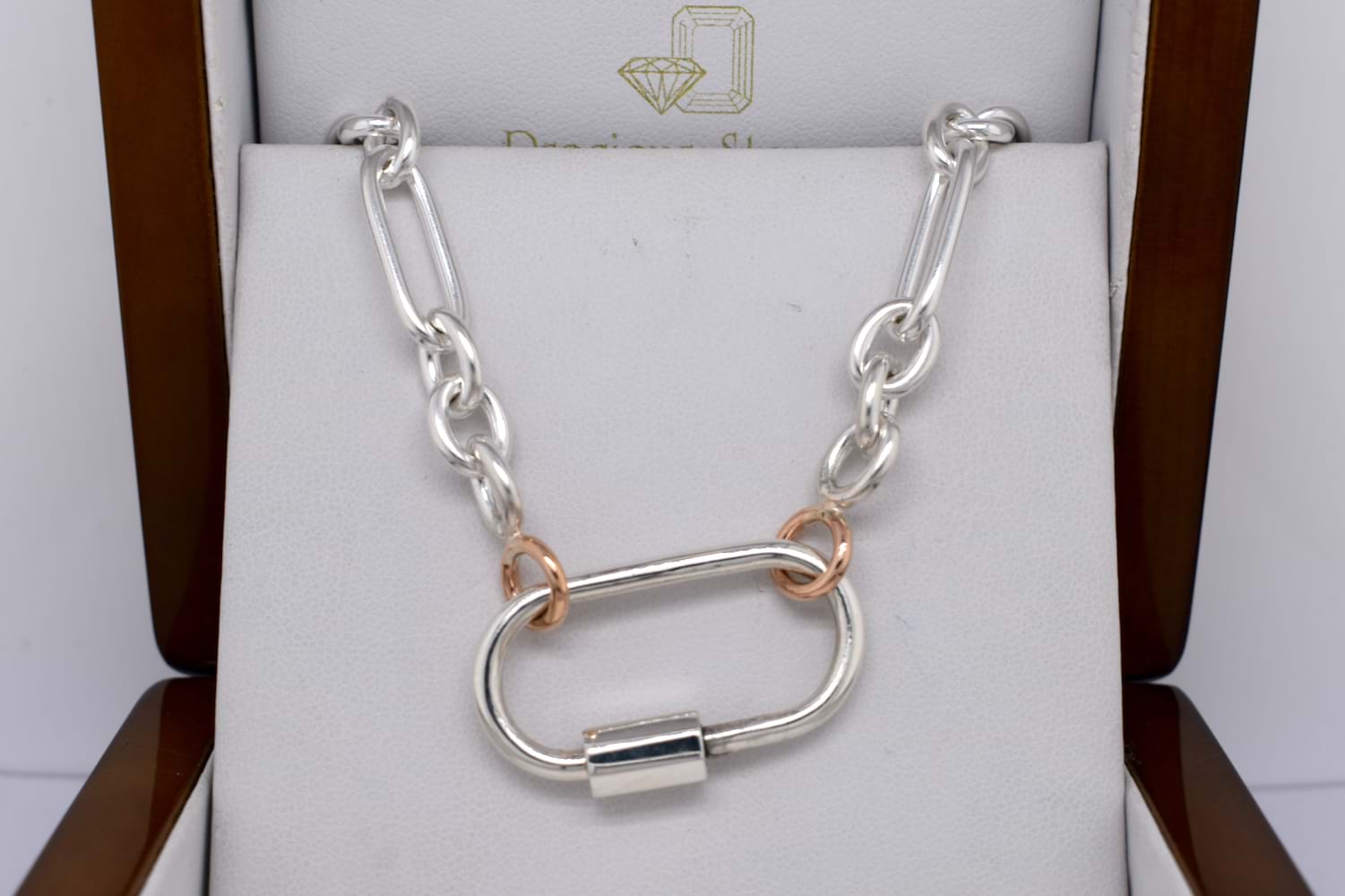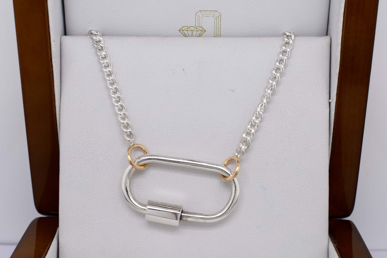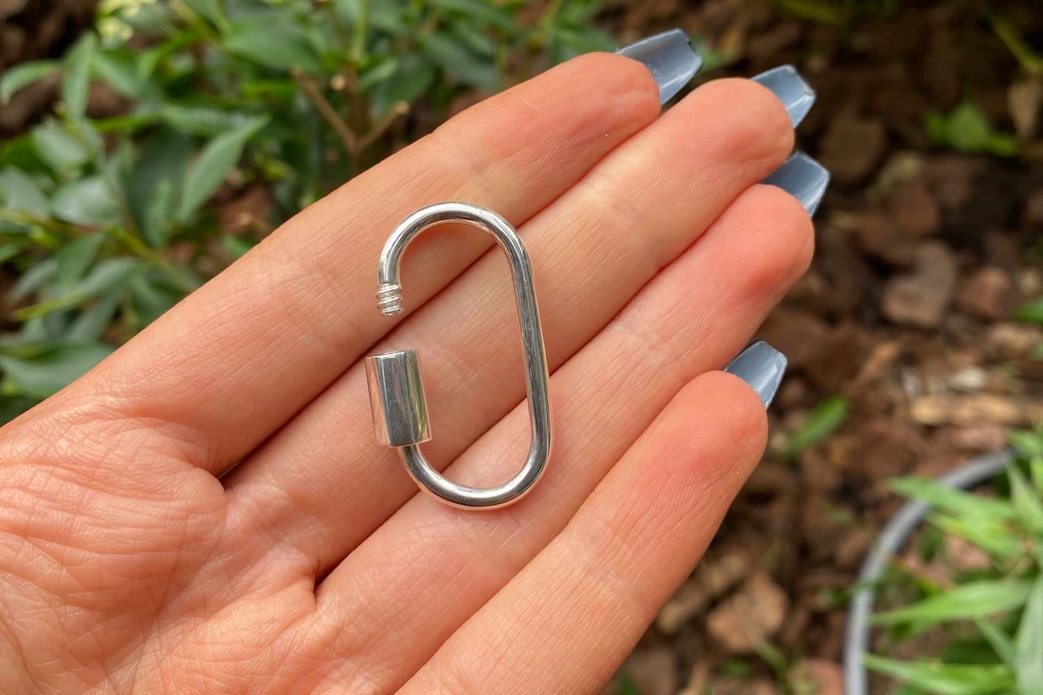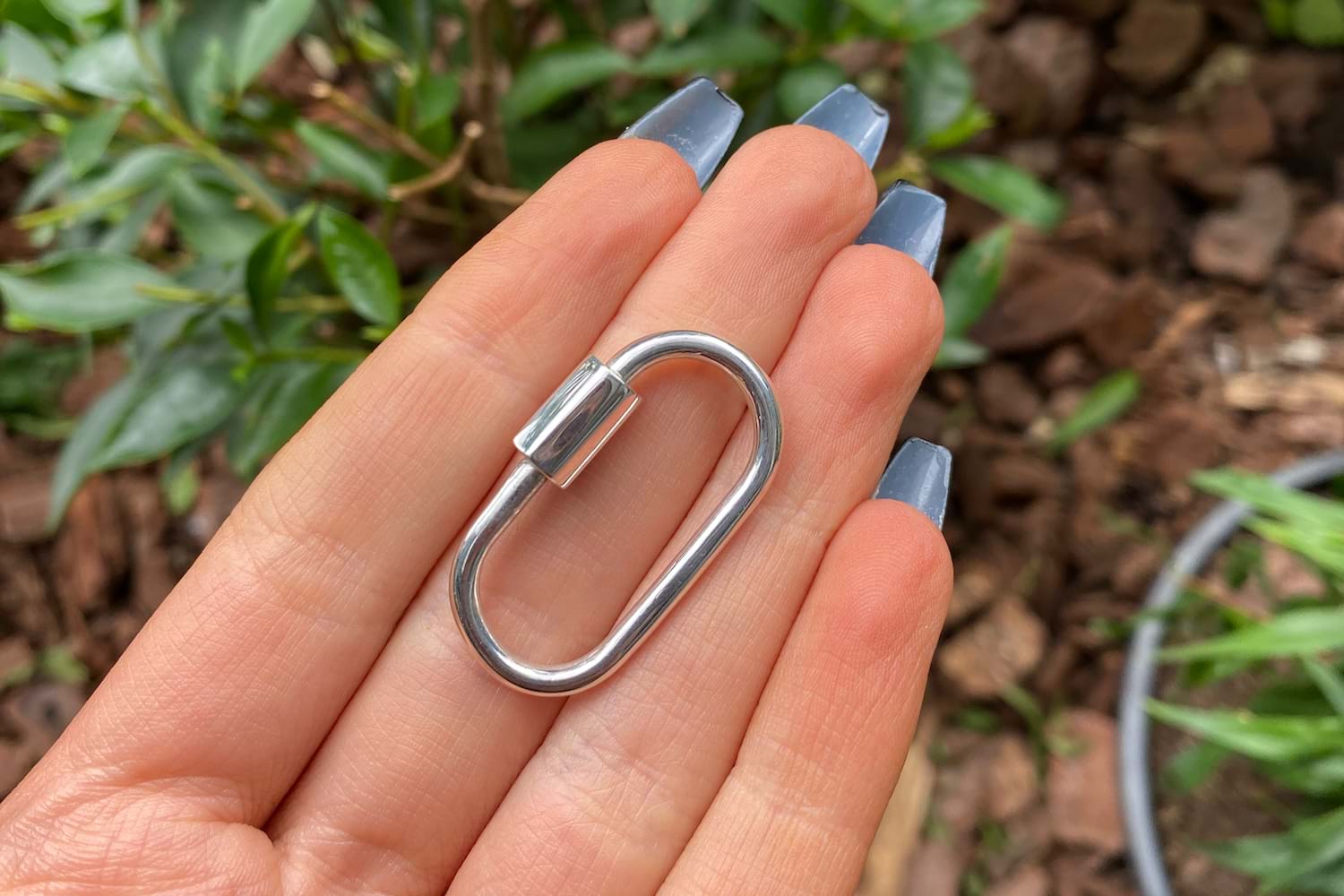We have upscaled a customer favourite of ours! This large oval carabiner is crafted in Sterling Silver and has been designed as a multipurpose piece which can act primarily as a clasp but also as a linking or extending accessory; to hang a pendant or enhancer from or even be a pendant itself. Pair it with a gold chain for continuity or rose gold for a bold contrast. Chains are available for separate purchase. Carabiner measures approx. 34x20mm