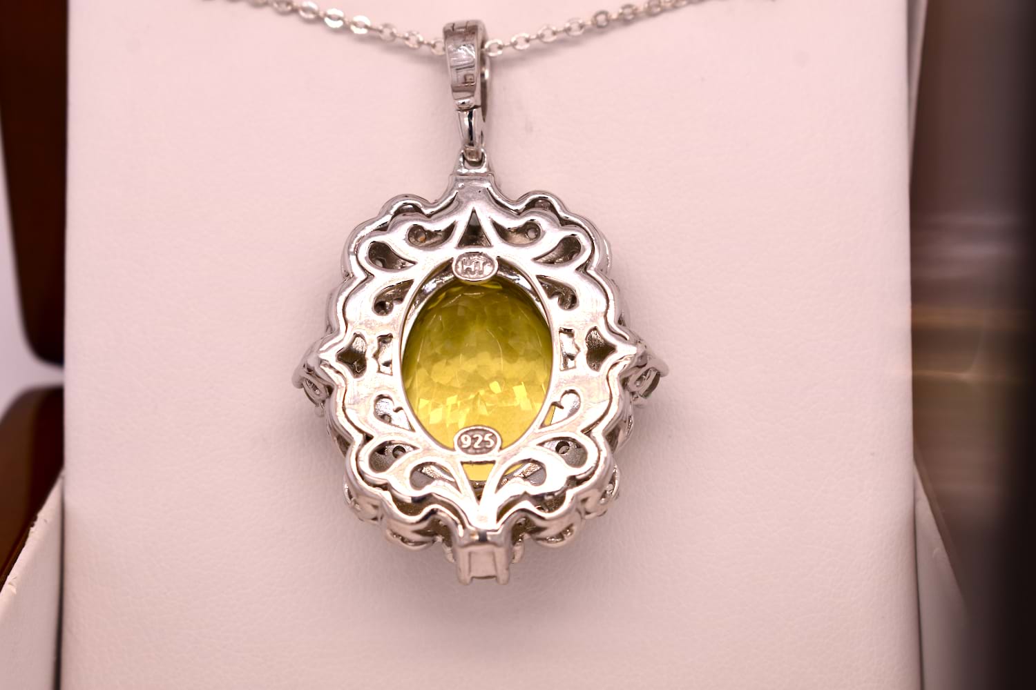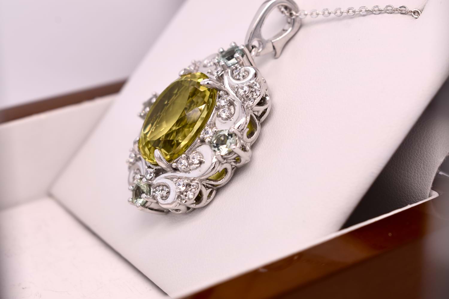This pretty pendant catches your eye with a beautifully bright yellow lemon quartz measuring approximately 20x15mm four claw set into sterling silver, surrounded by a beautiful plain sterling silver scroll edge design with scattered CZ's and four round prasiolites. The enhancer bale allows the piece to be worn on a fine chain as well as being clipped onto pearls, bolt rings and heavier link chains. Chains are available for separate purchase.