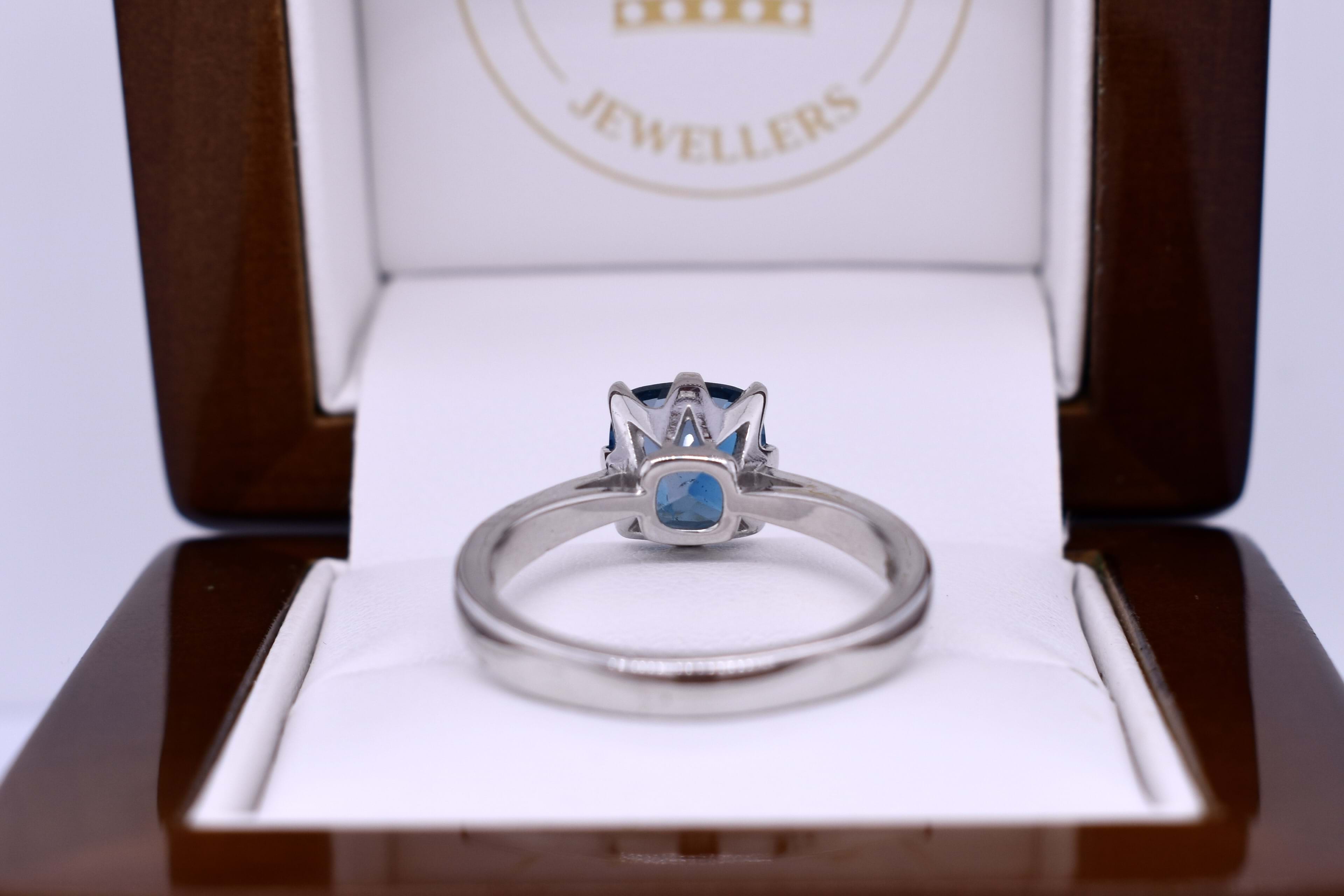 This simplistic but stunning ring is crafted in sterling silver and features a 7.6x7.7mm cushion shaped London Blue Topaz, set in a unique 8 claw setting, finished on a plain band. Finger size R. Photographed in natural light with other pieces.