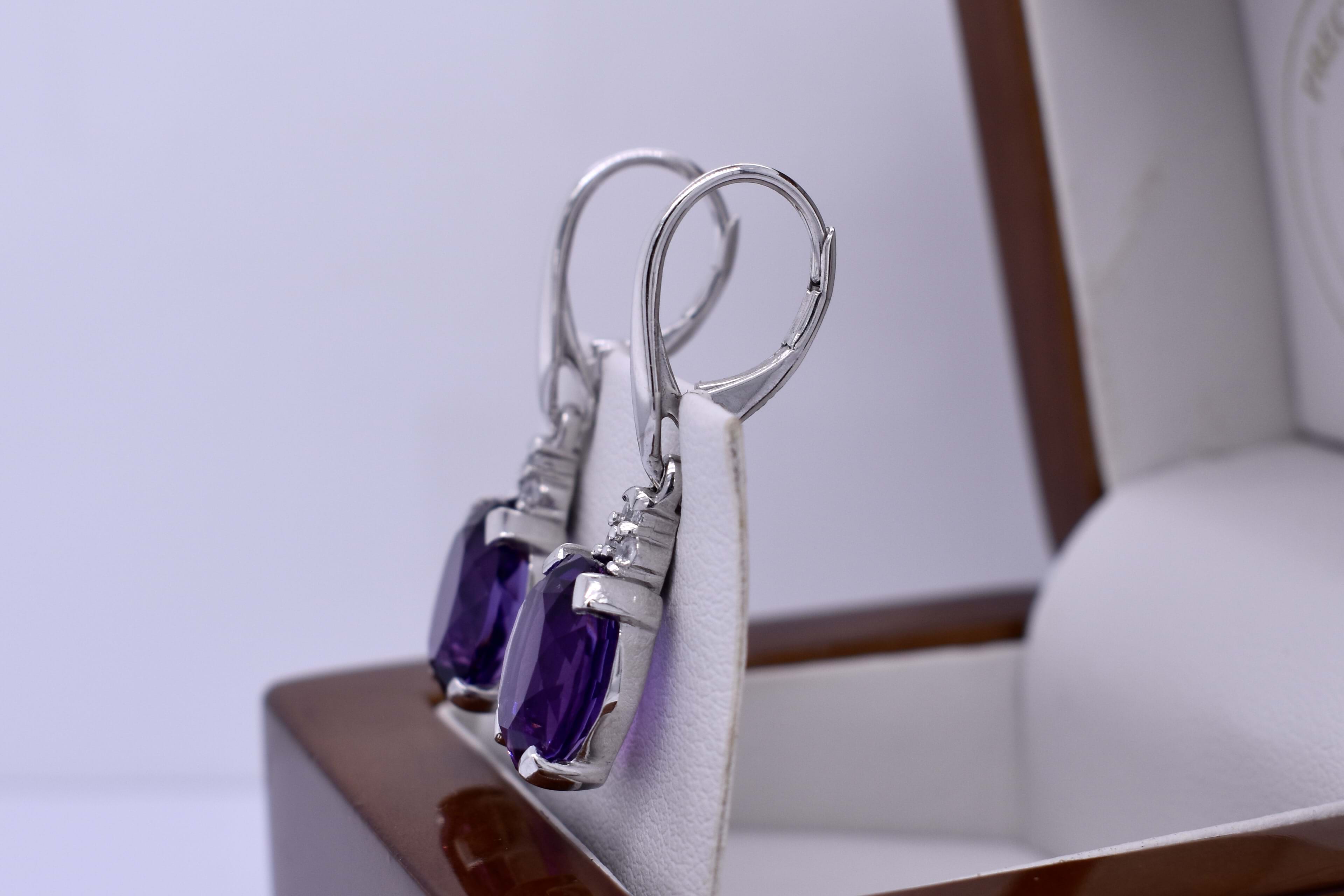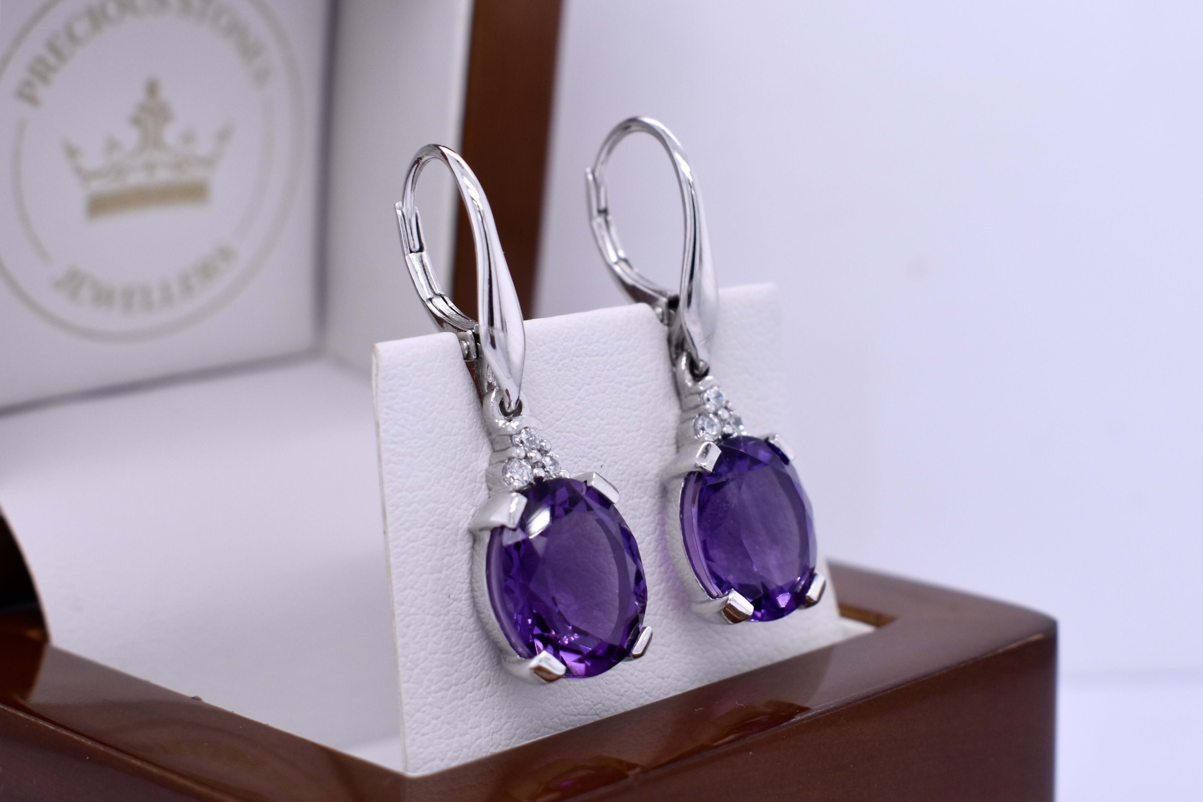 Vibrant and eye-catching, these oval amethysts measure approximately 12x10mm and are four claw set in sterling silver settings, complimented with sparkly CZ accents. Finished with continental clips for comfort and security. Photographed outside with other pieces (Available for seperate purchase)